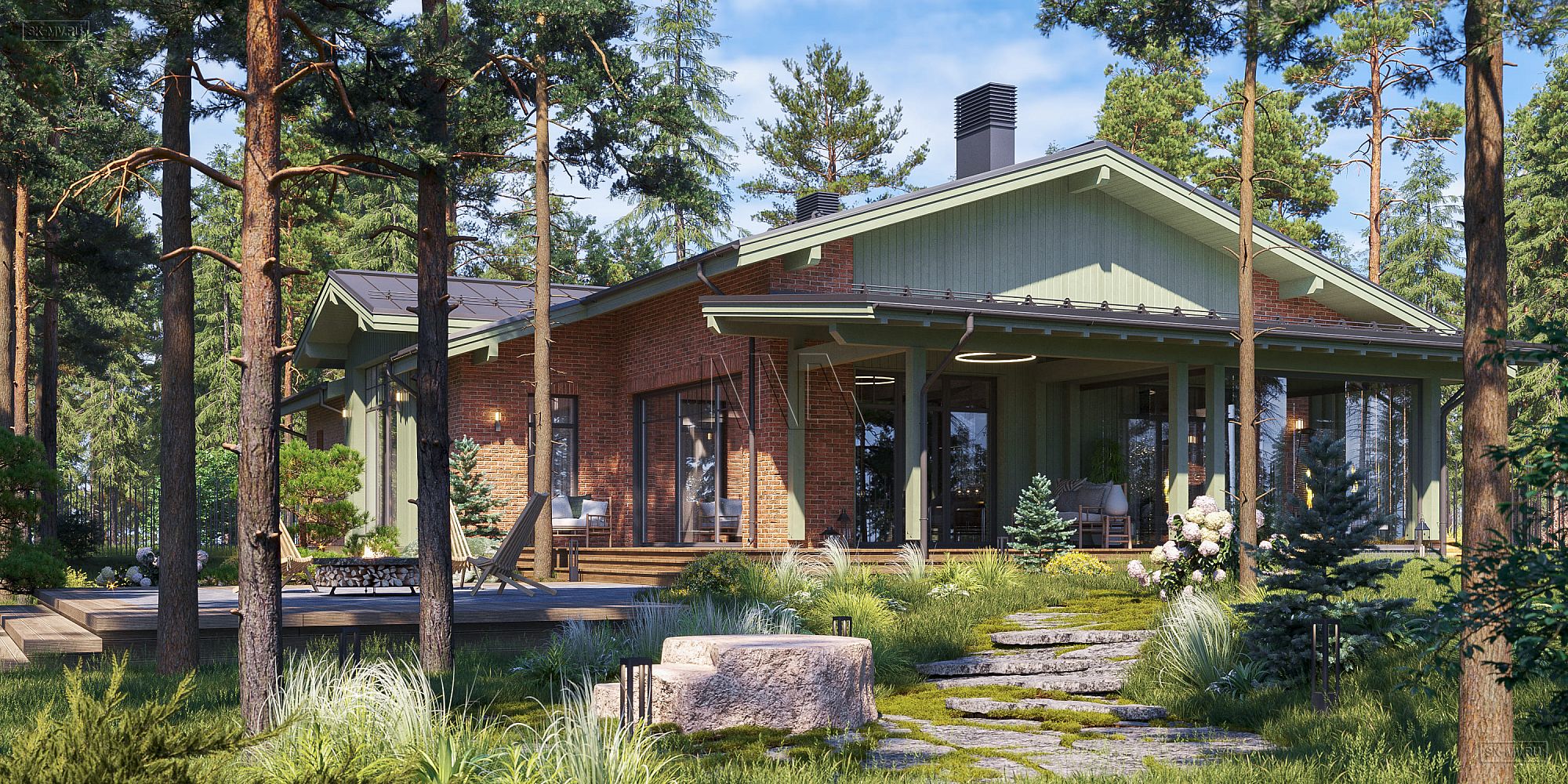 Для этого дома архитектор предложил три варианта комбинированной отделки главного фасада: сочетание пестрого красного клинкерного кирпича с оливкового цвета деревом и серым отделочным камнем. Неизбитое сочетание цветов идеально вписывается в окружающий лесной ландшафт.