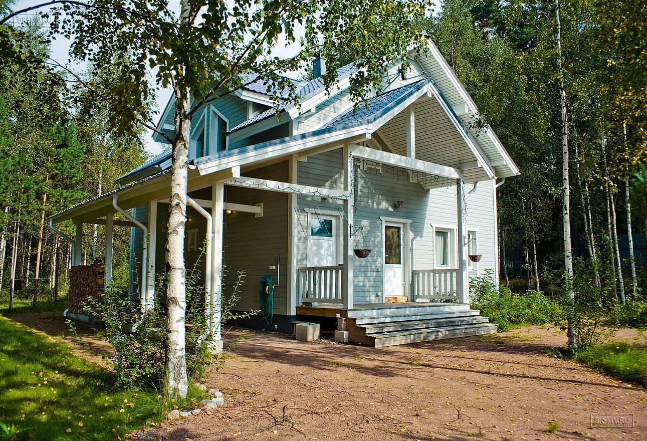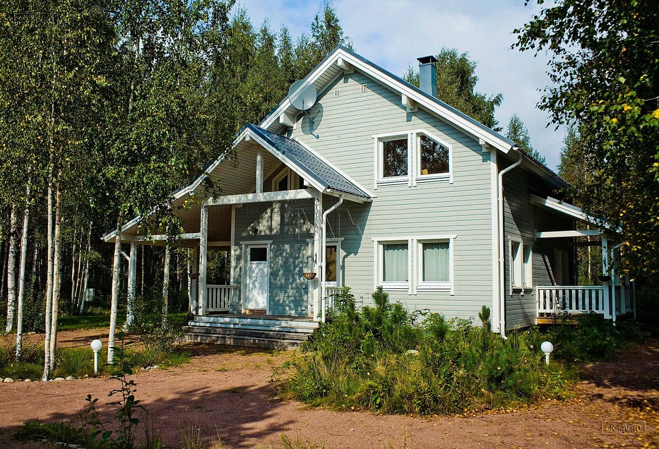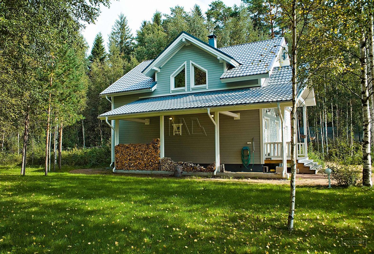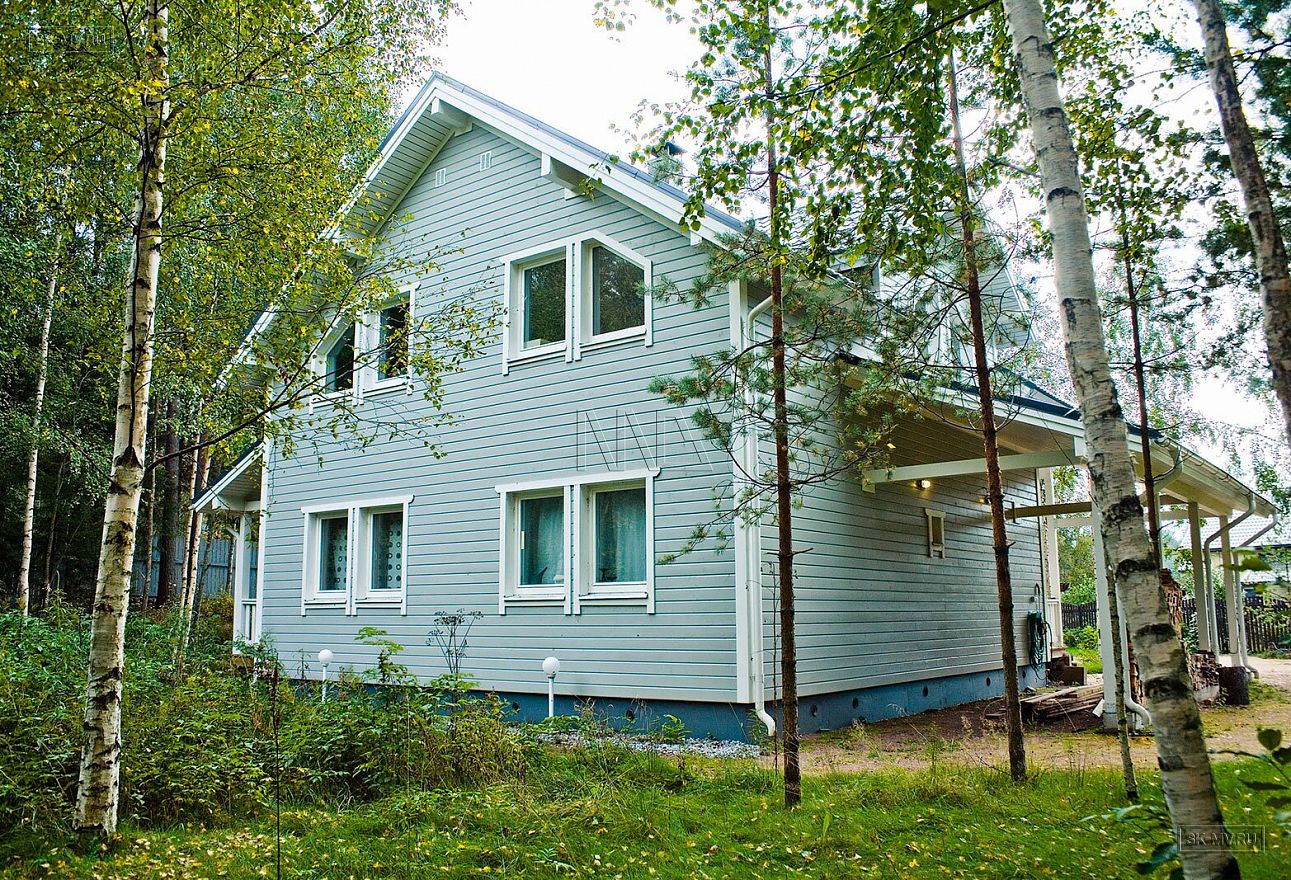 Небольшой каркасный двухэтажный деревянный дом площадью ок. 170 кв.м с навесом для автомобиля и террасой построен в поселке Борисово Ленинградской области по проекту МВ 1. Для этого объекта выполнялся полный комплекс работ от строительства дома, до монтажа инженерных сетей и внутренней отделки.