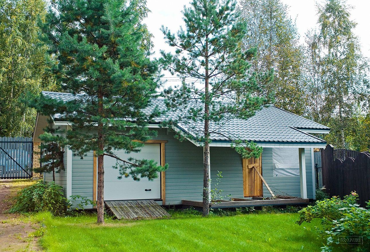 На этапе архитектурного плана проект МВ 1 был адаптирован с пристройкой навеса для двух автомобилей и небольшой террасы сбоку. Но особенность реализации этого дома — свайный фундамент с деревянным цокольным перекрытием. В данном случае на основании геологических изысканий группой инженеров принято решение вместо фундамента УШП монтировать свайное поле, поскольку торфяные грунты участка — очень слабые, а комплекс работ по выторфовке и засыпки под оснвание УШП являлся экономически не целесообразным для этого небольшого дома, учитывая желание заказчика максимально оптимизировать смету.
