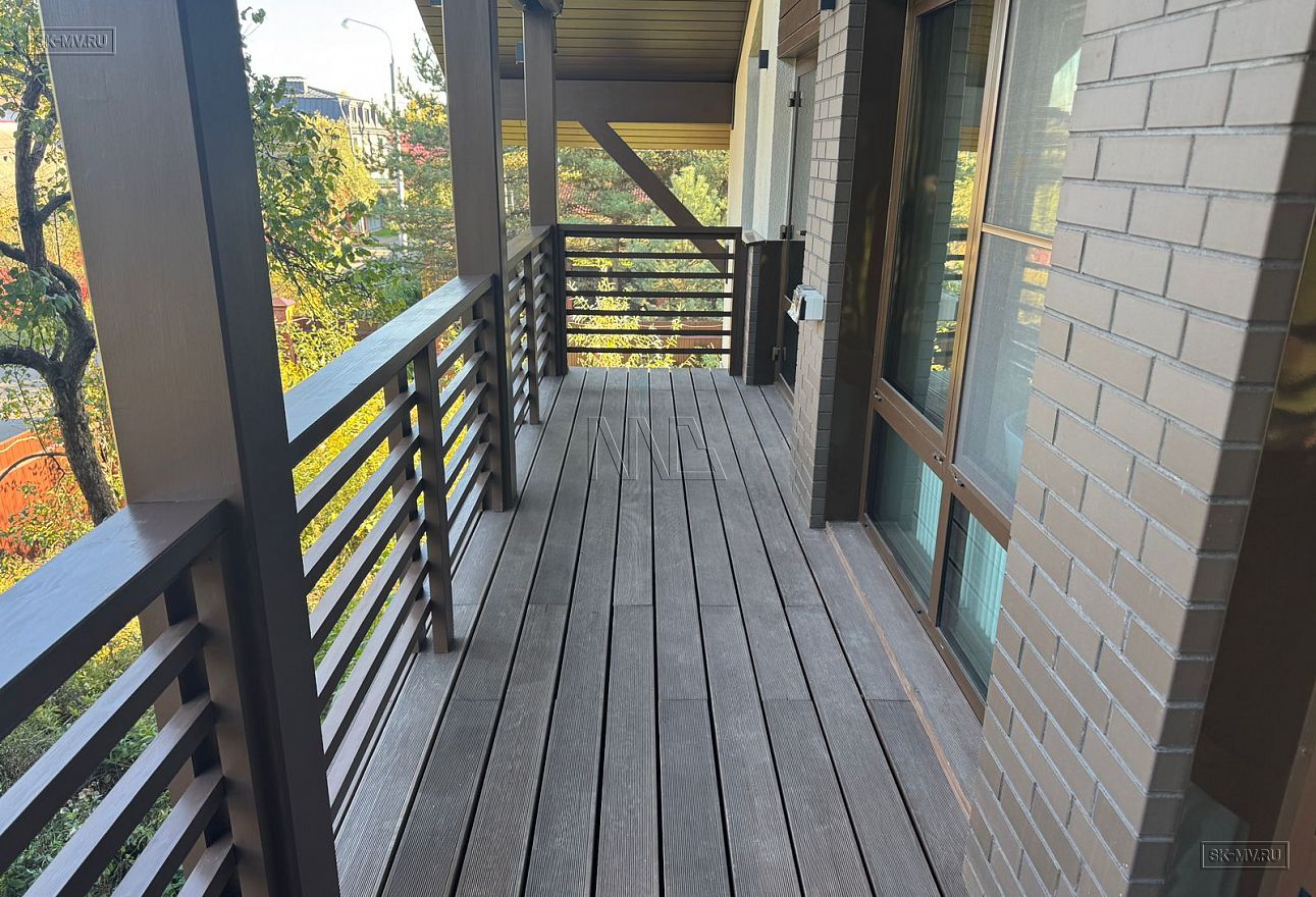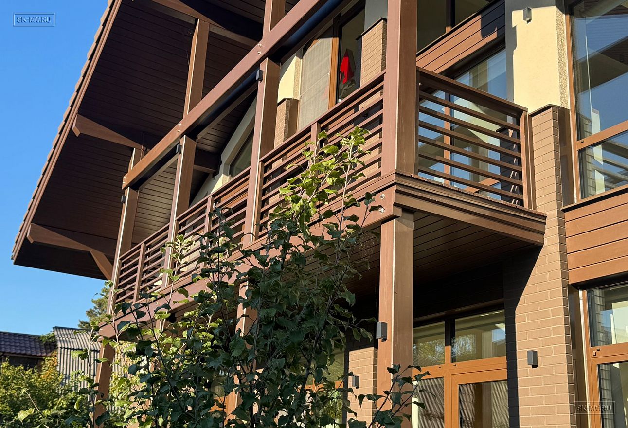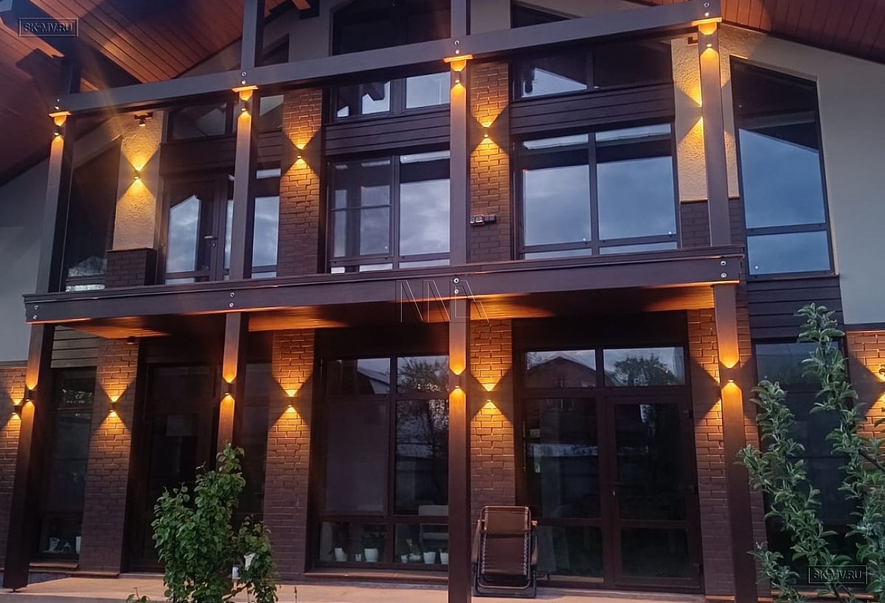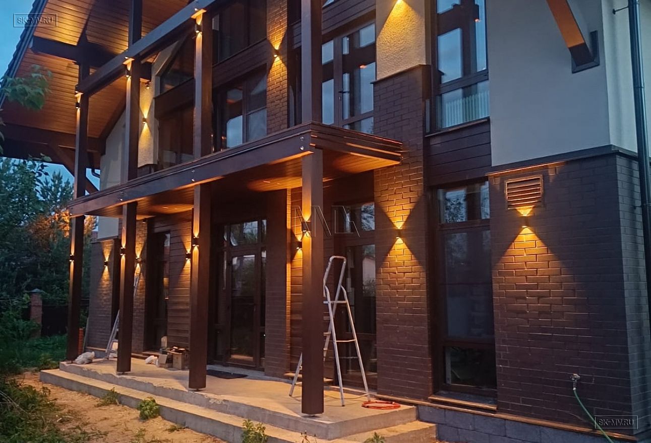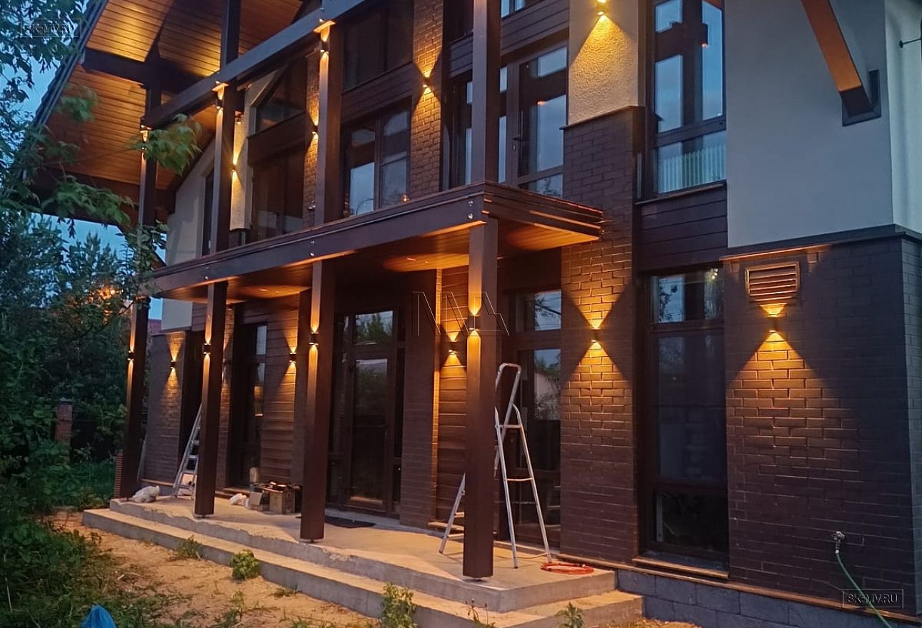 Завершающий этап строительства трехэтажного загородного дома по индивидуальному проекту «Дарна». Ключевыми особенностями проекта можно назвать симметричные террасы и балконы, второй свет в гостиной, СПА зону с сауной, большие площади остекления.