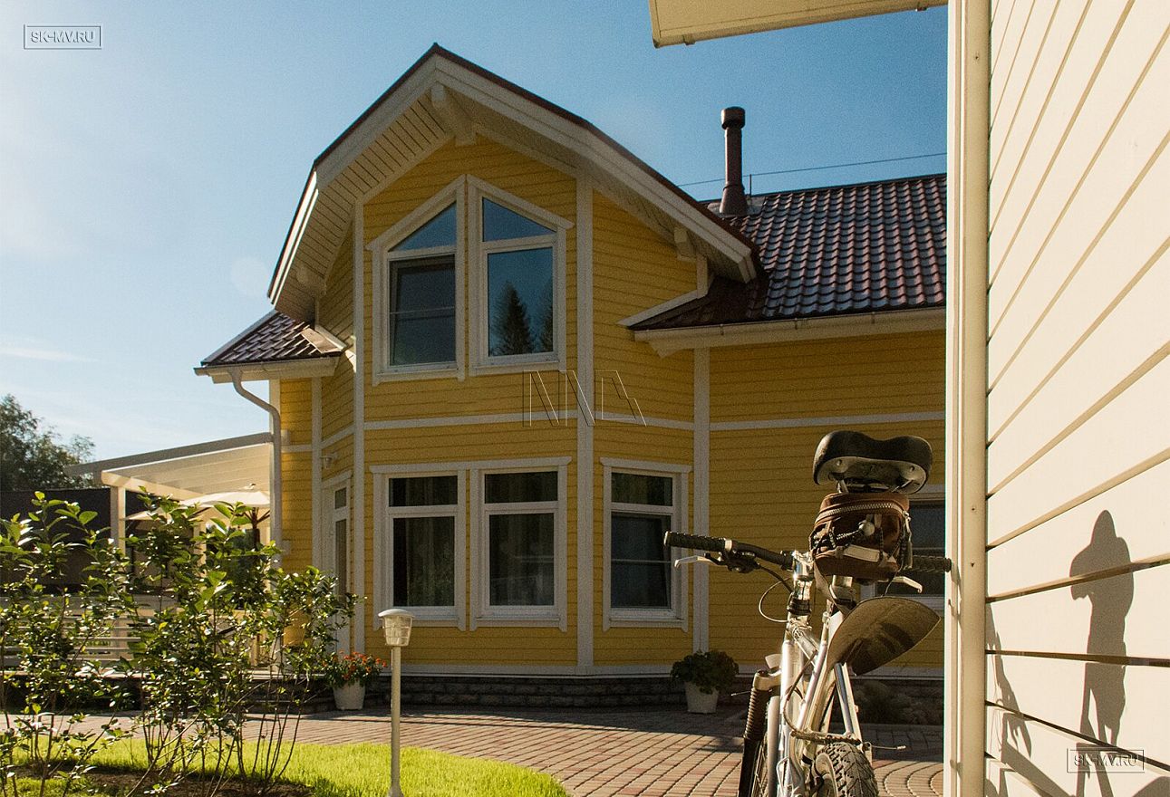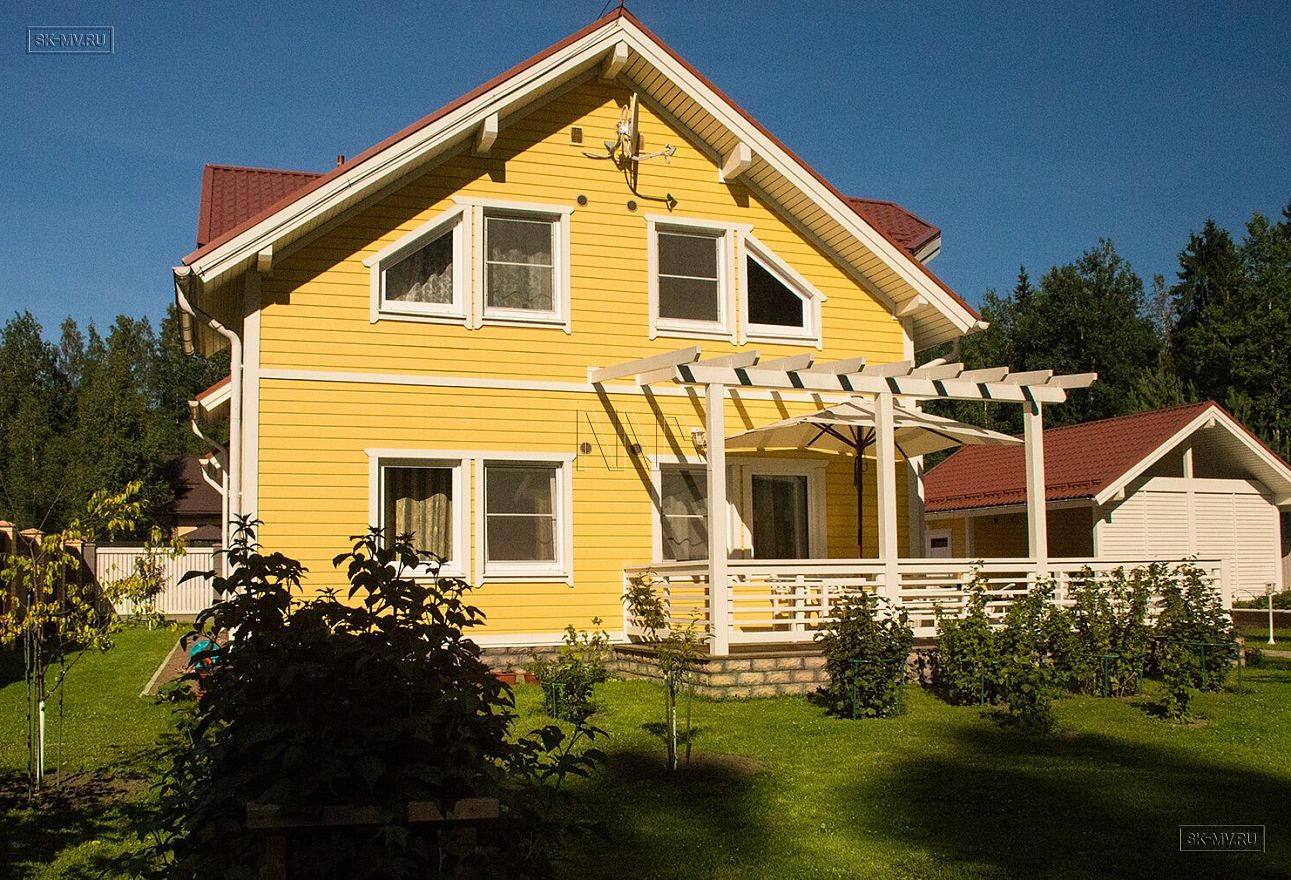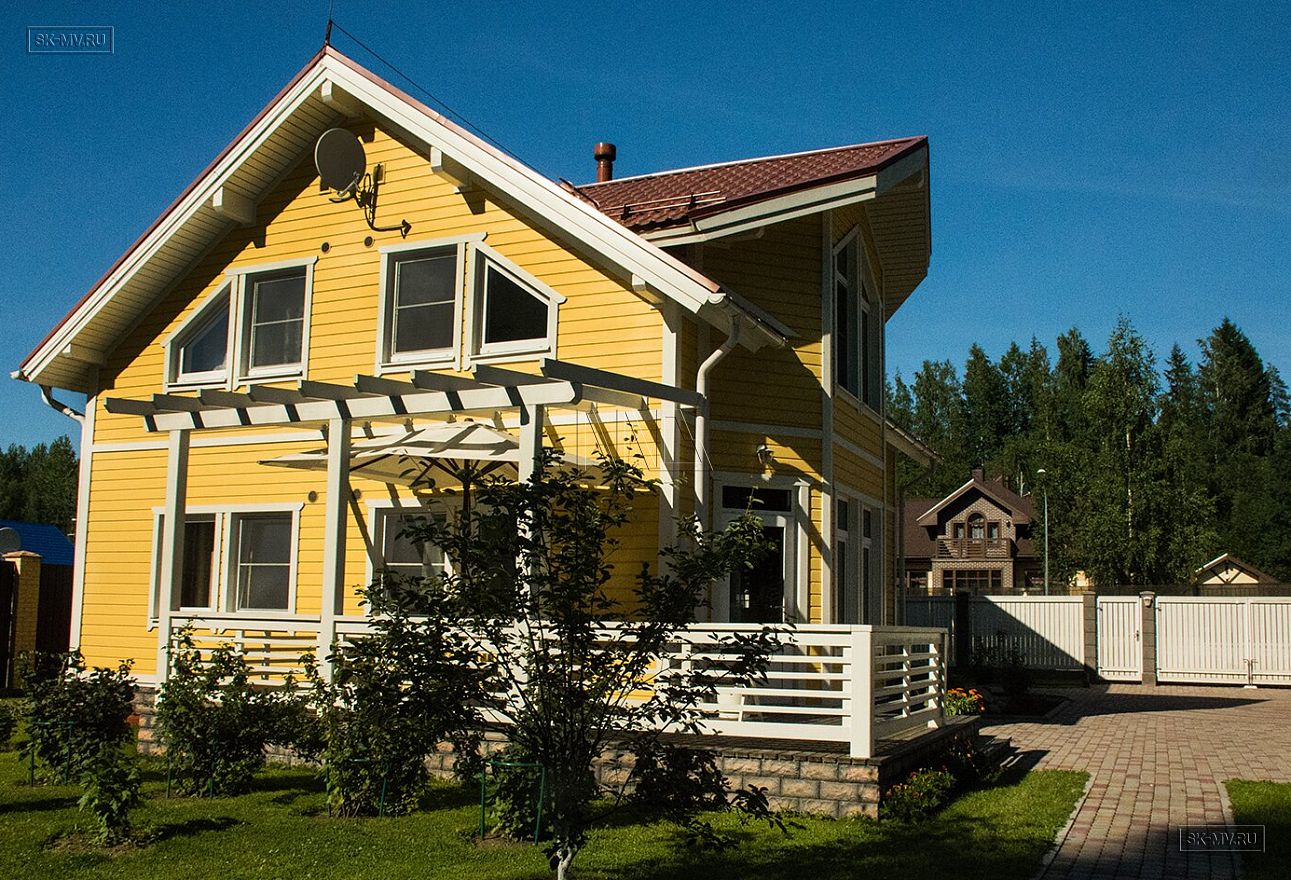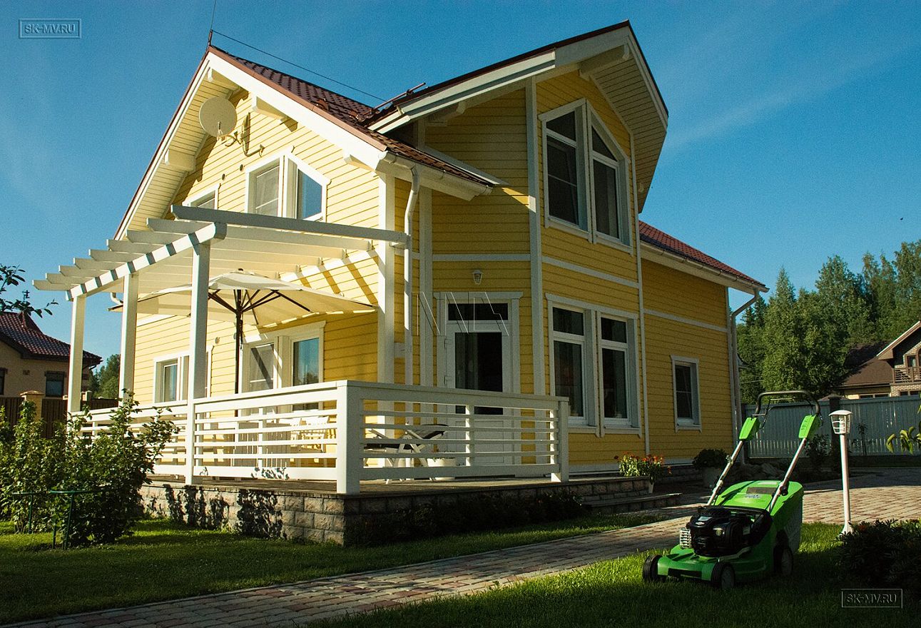 Каркасный дом под ключ площадью 152 кв.м построен нашей компанией в Санкт-Петербурге в поселке «Галактика». Яркий солнечный дом с фасадом из желтой отделочной доски и красной черепичной кровлей. Белая терраса, подшивка свесов и декоративные планки идеально дополняют фасад.