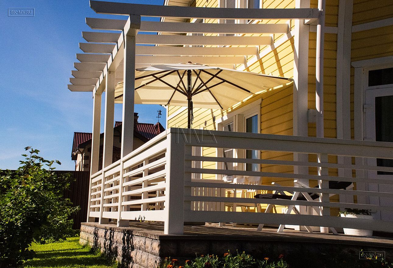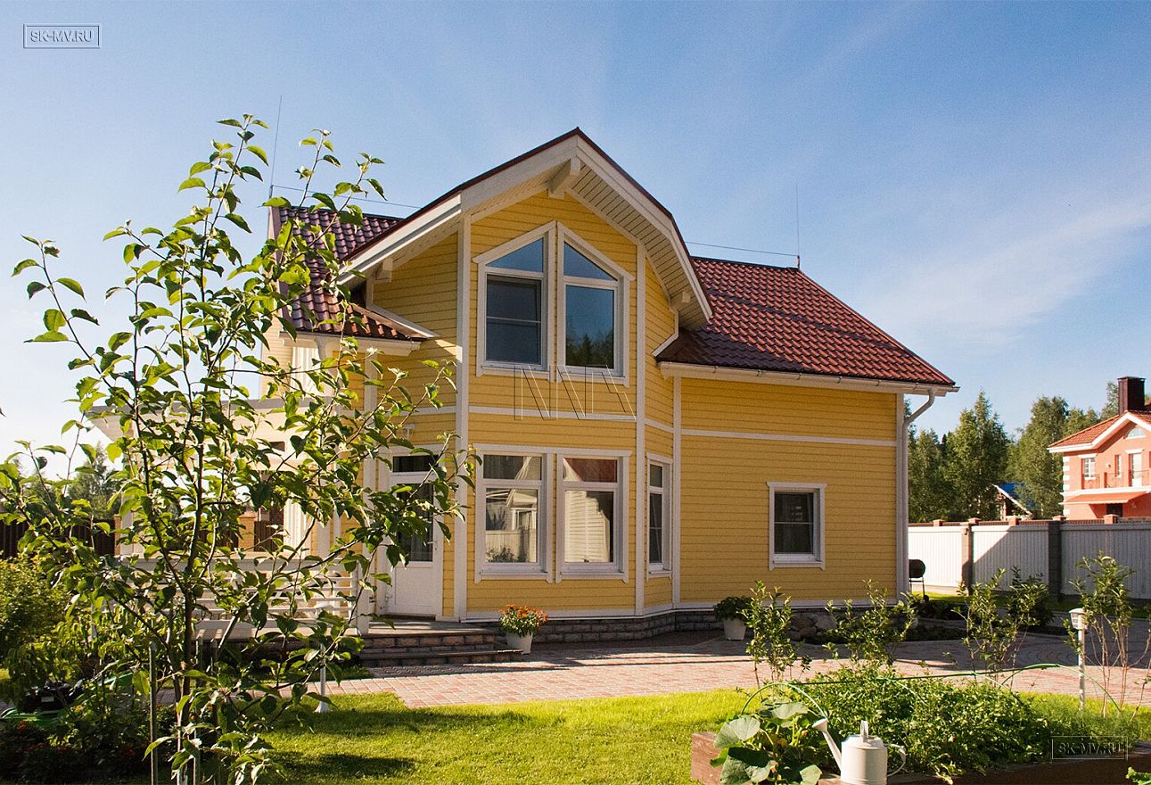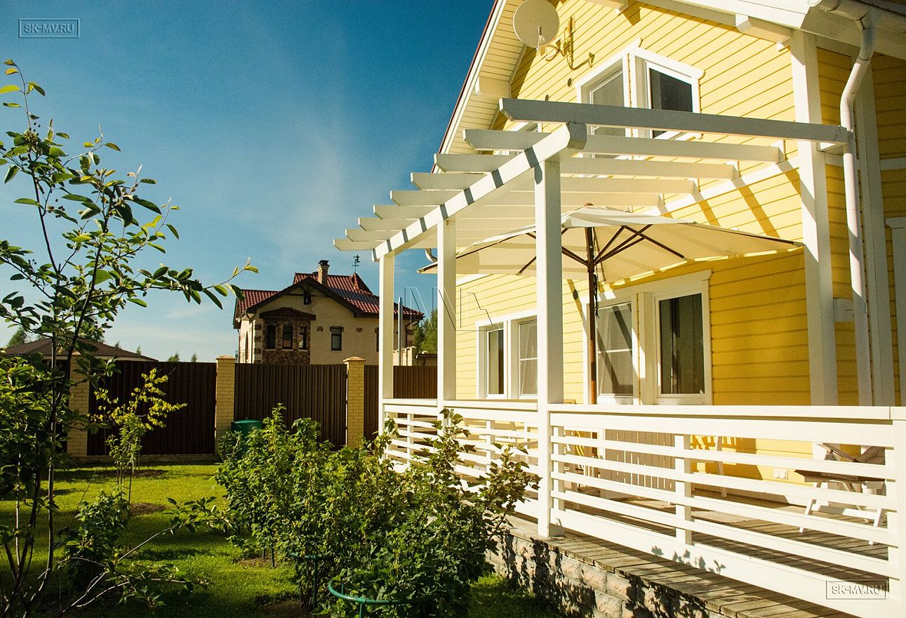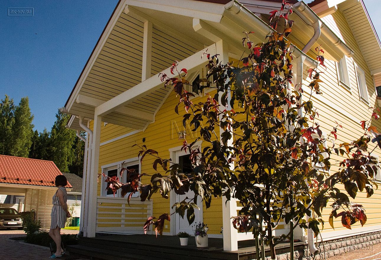 Каркасный дом под ключ площадью 152 кв.м построен нашей компанией в Санкт-Петербурге в поселке «Галактика». Яркий солнечный дом с фасадом из желтой отделочной доски и красной черепичной кровлей. Белая терраса, подшивка свесов и декоративные планки идеально дополняют фасад.