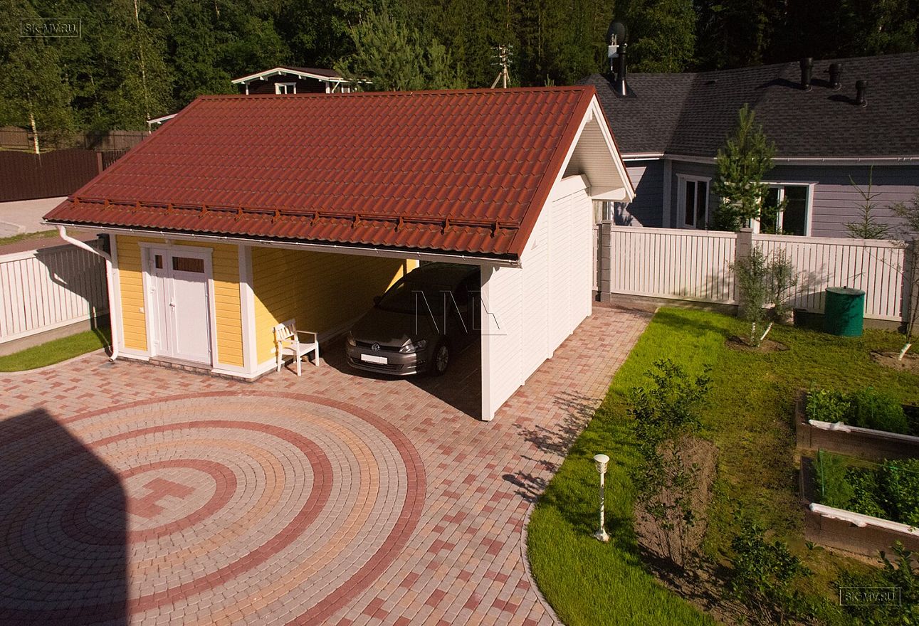 На участке полностью выполнены работы по благоустройству. В том же стиле, что и дом, построен навес для одного автомобиля с хозяйственным блоком. Оригинальное мощение площадки перед домом, как стилизации вертолетной площадки, — отличная идея домовладельцев, безупречно реализованная мастерами.