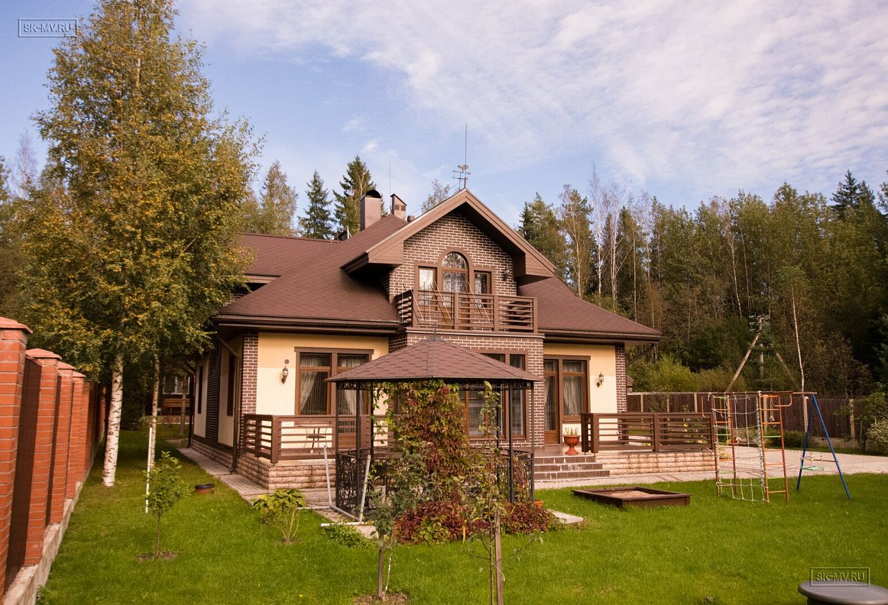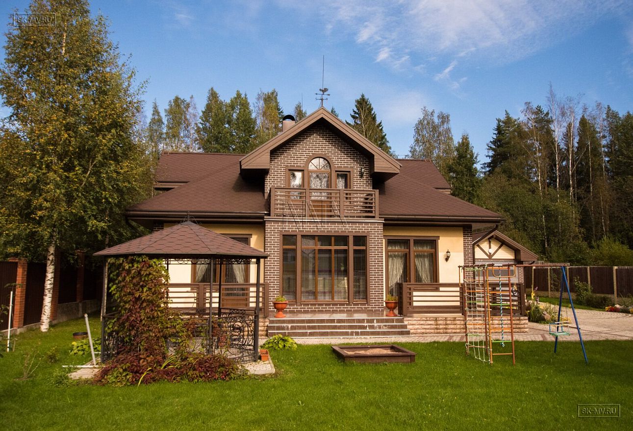 За его внешний вид между собой мы называем этот дом «шоколадным». Красивая темно-коричневая крыша из мягкой черепицы, лицевой кирпич коричневого цвета с белой расшивкой, темно-коричневые декоративные элементы террасы, окон, балконов и кровли все вместе создают удивительную красивую композицию.