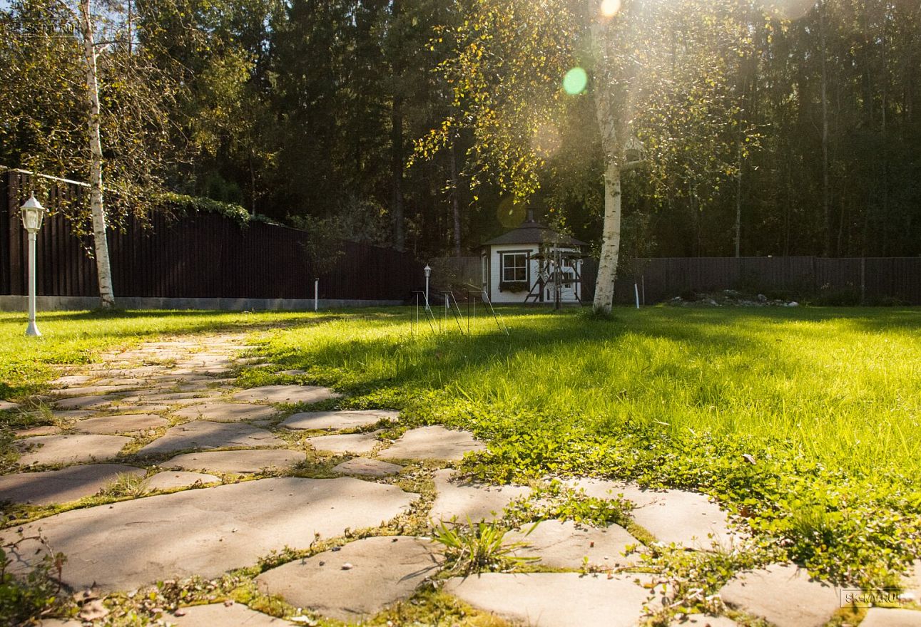 Благоустройство участка выполнено так, что красивые извилистые дорожки соединяют несколько зон отдыха, где можно позагорать, покачаться на качелях, поиграть или же организовать барбекю в летней кухне. Широкие площади зеленых газонов создают радостное настроение и живую атмосферу загородной жизни.