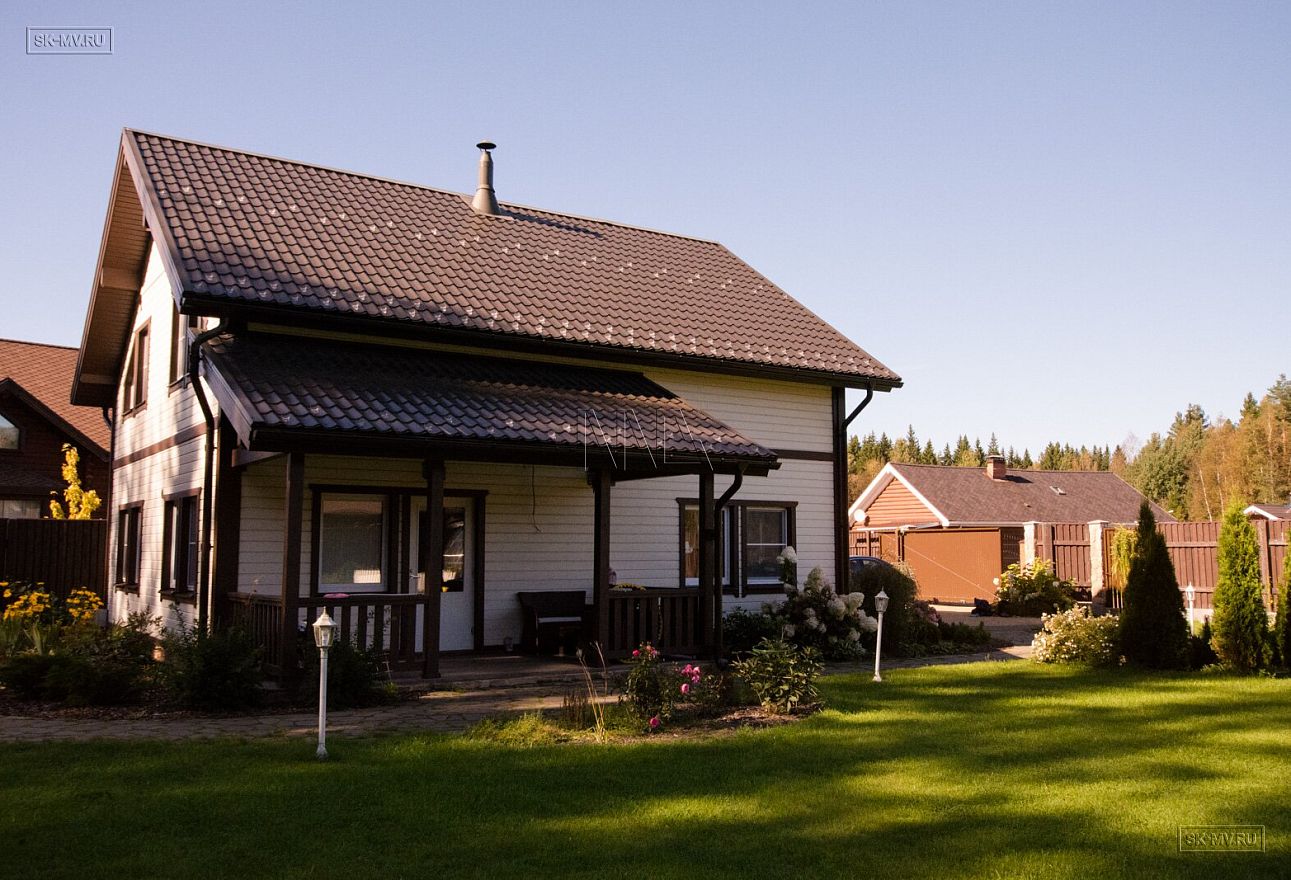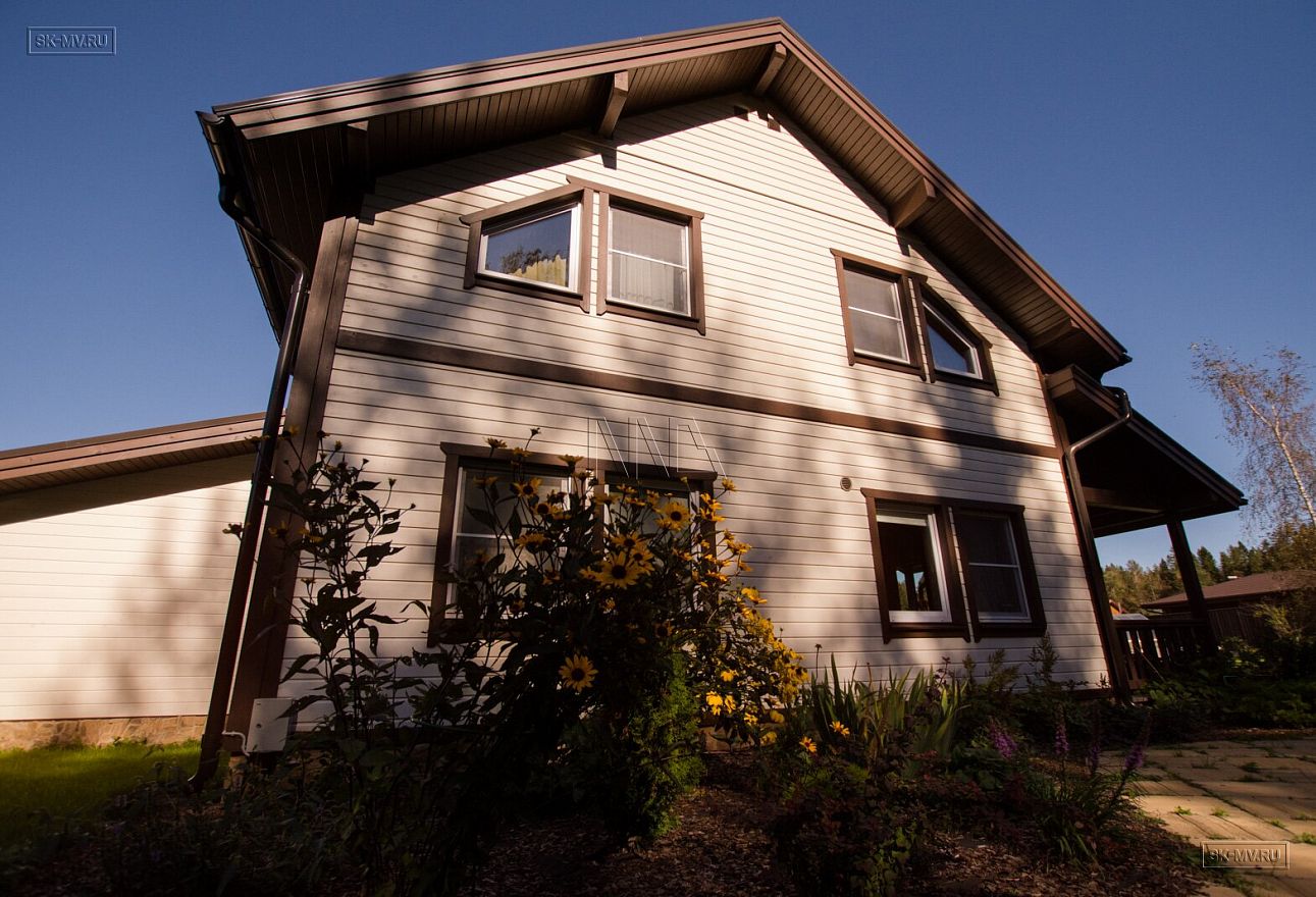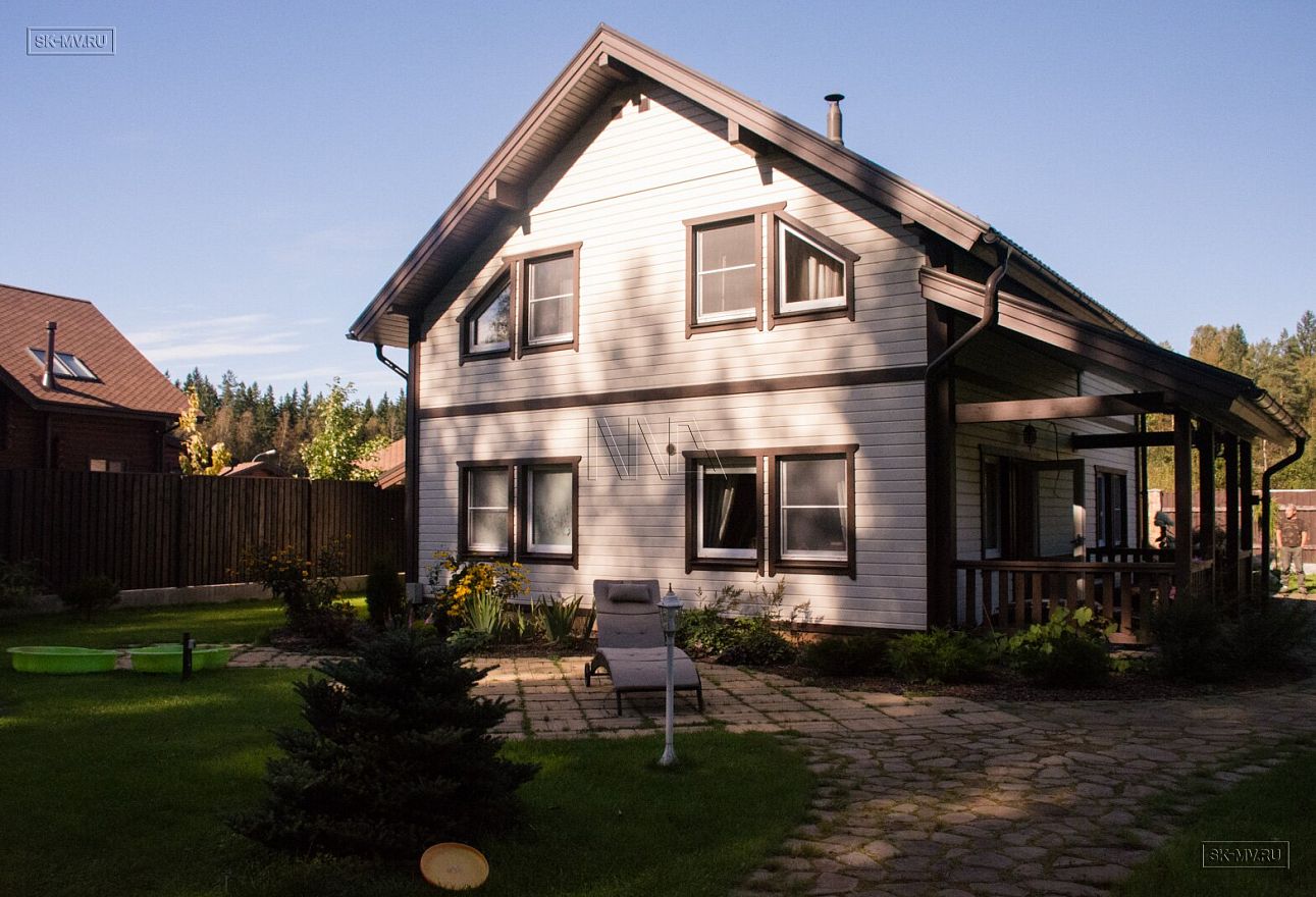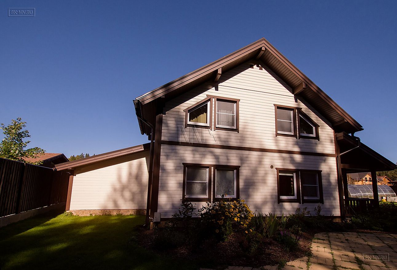 Двухэтажный каркасный дом с мансардным этажом (на фото) построен по типовому проекту «МВ 1» из коллекции Медного Всадника с небольшой адаптацией проекта под участок. Отделка фасада реализована в самом простом исполнении — наружная отделка дома деревом, окрашенным финским кроющим антисептиком Винха с колером молочного и коричневого цветов. Коричневая двускатная кровля безупречно завершает образ этого небольшого уютного домика для постоянного проживания.