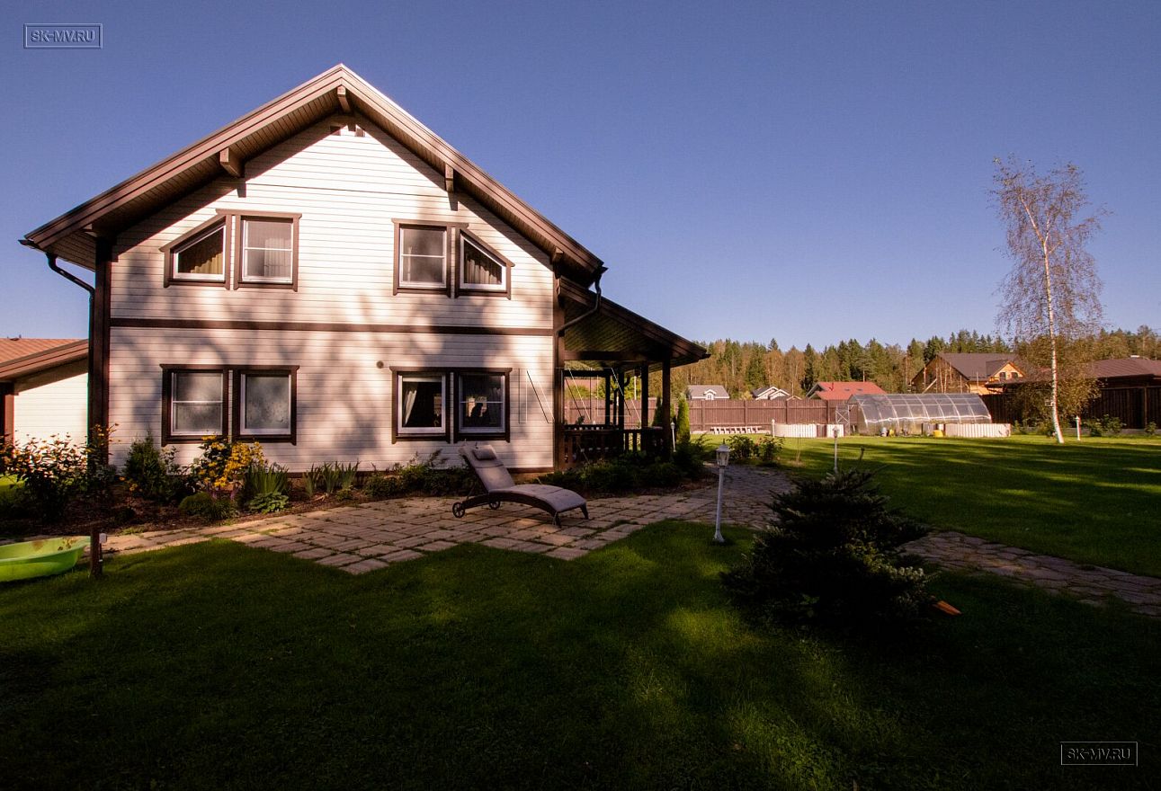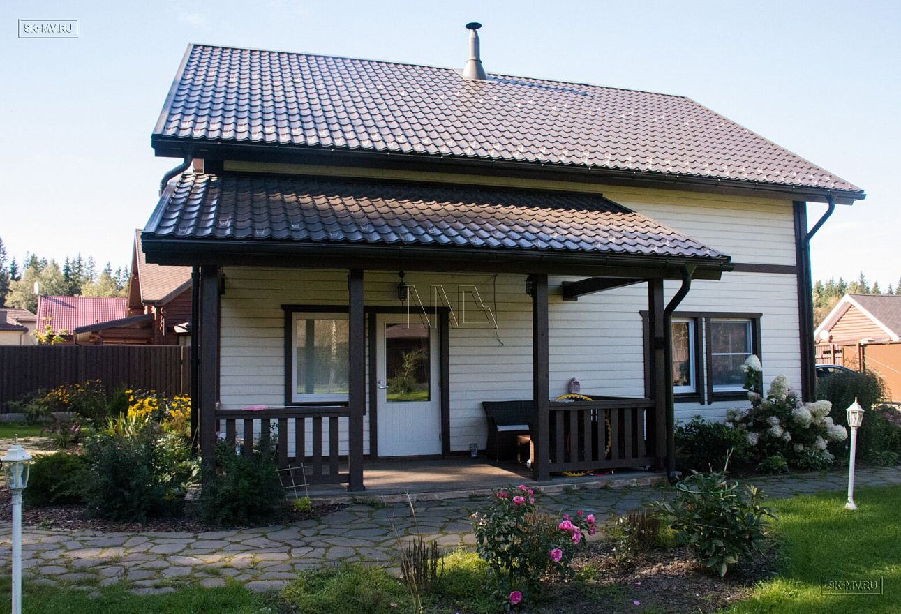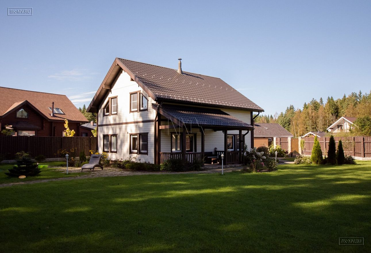 Двухэтажный каркасный дом с мансардным этажом (на фото) построен по типовому проекту «МВ 1» из коллекции Медного Всадника с небольшой адаптацией проекта под участок. Отделка фасада реализована в самом простом исполнении — наружная отделка дома деревом, окрашенным финским кроющим антисептиком Винха с колером молочного и коричневого цветов. Коричневая двускатная кровля безупречно завершает образ этого небольшого уютного домика для постоянного проживания.