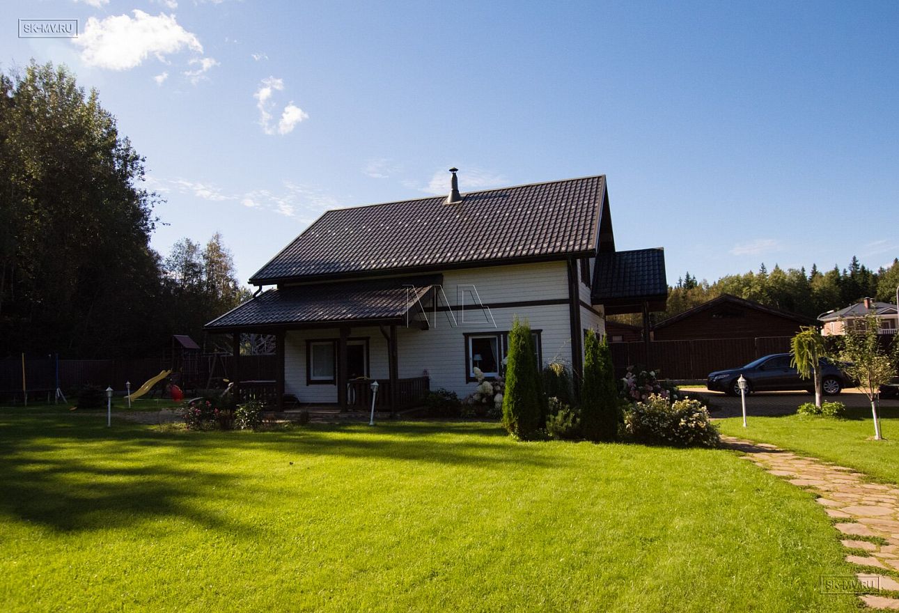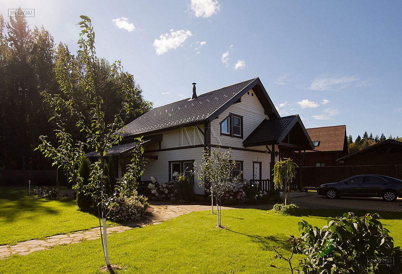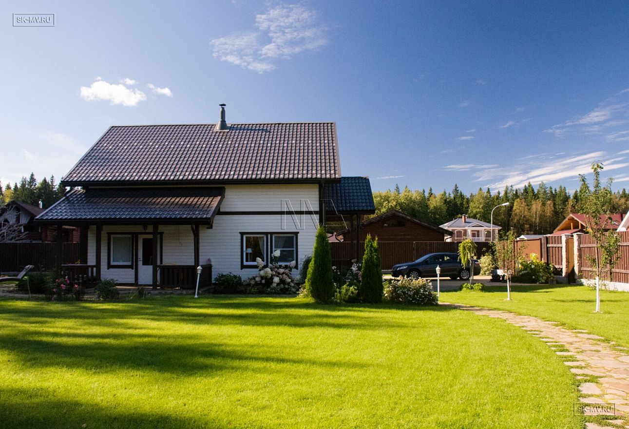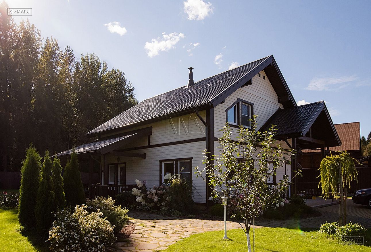 Двухэтажный каркасный дом с мансардным этажом (на фото) построен по типовому проекту «МВ 1» из коллекции Медного Всадника с небольшой адаптацией проекта под участок. Отделка фасада реализована в самом простом исполнении — наружная отделка дома деревом, окрашенным финским кроющим антисептиком Винха с колером молочного и коричневого цветов. Коричневая двускатная кровля безупречно завершает образ этого небольшого уютного домика для постоянного проживания.