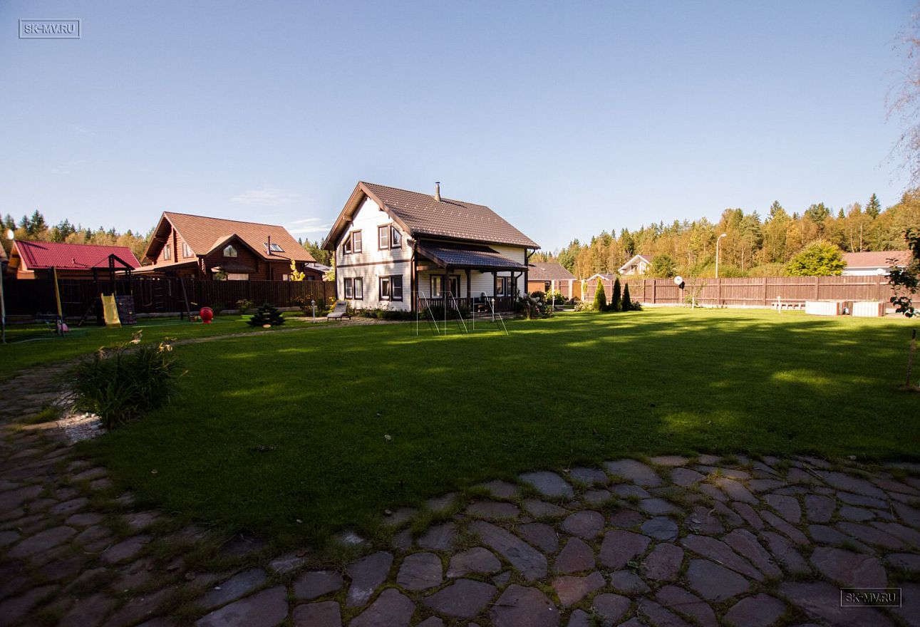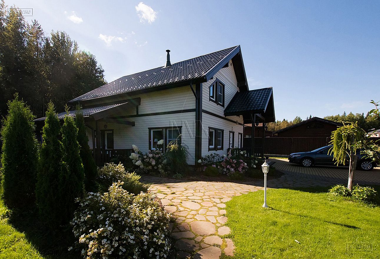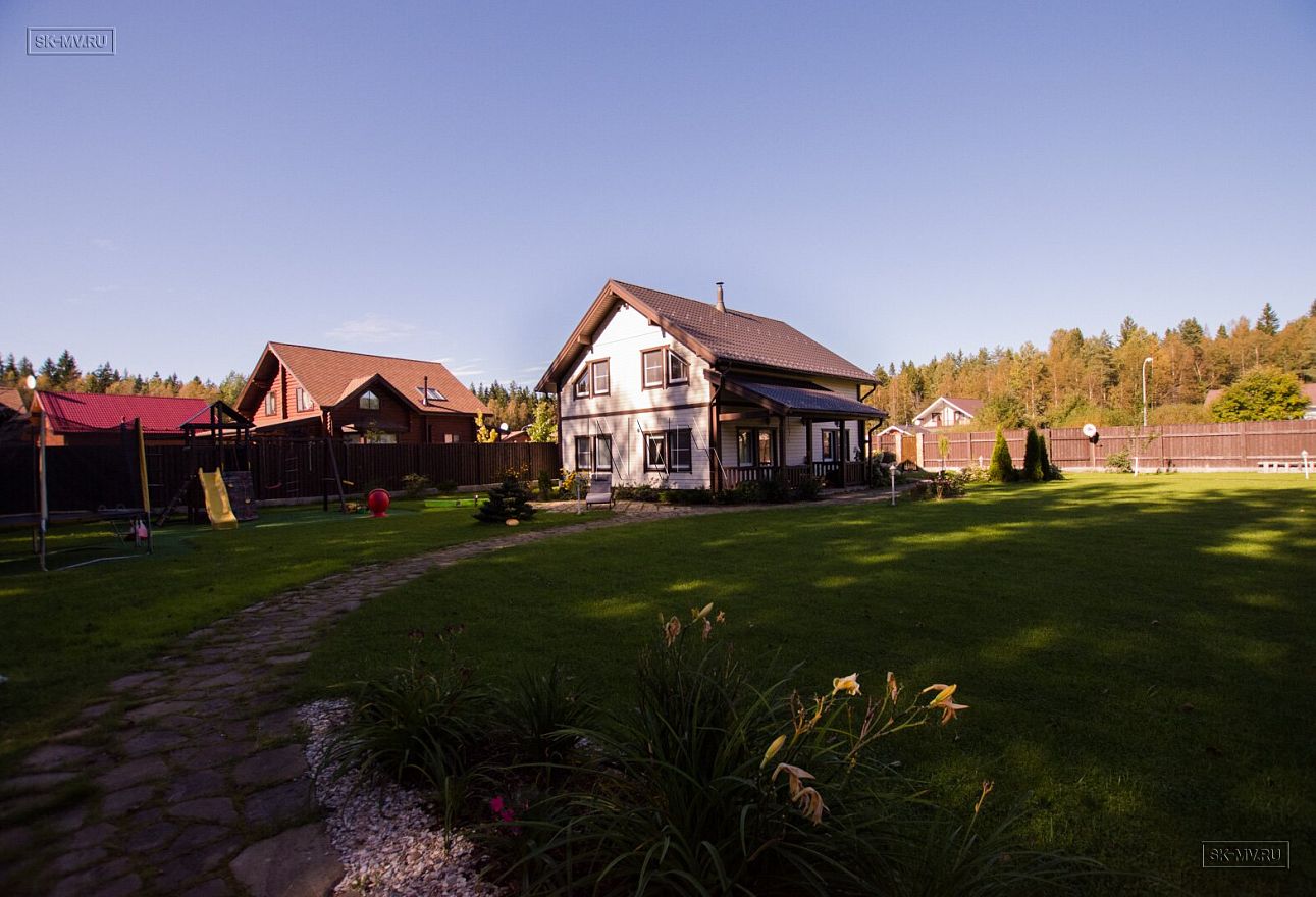 Если посмотреть на фотографии этого домовладения в поселке Галактика Ленинградской области, то в первую очередь глаз радуют две вещи — завершенность образа участка и гармония в пропорциях габаритов дома к габаритам участка. Нет ощущения скованности и недостатка пространства, как это обычно бывает когда люди стремятся возвести дом большой площади на маленьком участке. В Галактике 9 очень уютно — небольшая территория окружена деревянным забором с откатными воротами, правильно размещен дом в самой высокой точке, главным фасадом на юг, терраса обращена на участок, а крыльцо встречает хозяев при въезде, грамотно выполнено зонирование участка.