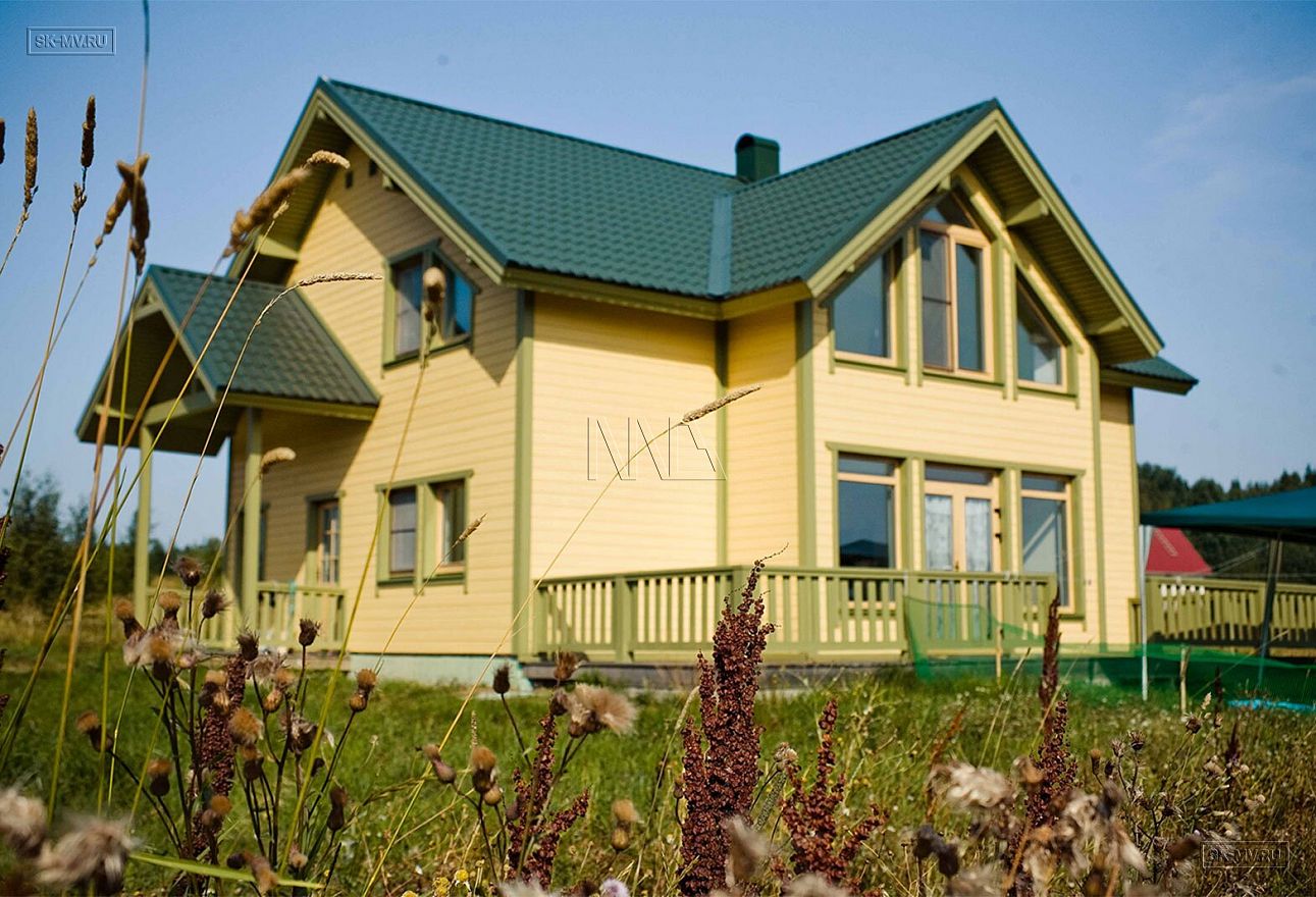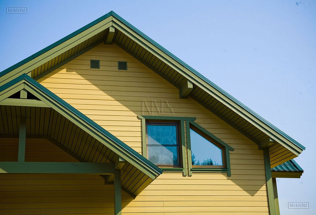 Оригинальное решения для оформления фасада — сочетание нежного желтого цвета вагонки и светлых декоративных элементов травяного цвета (стойки, балки, ограждения и подшивка свесов) — завершается яркой изумрудной кровлей.
