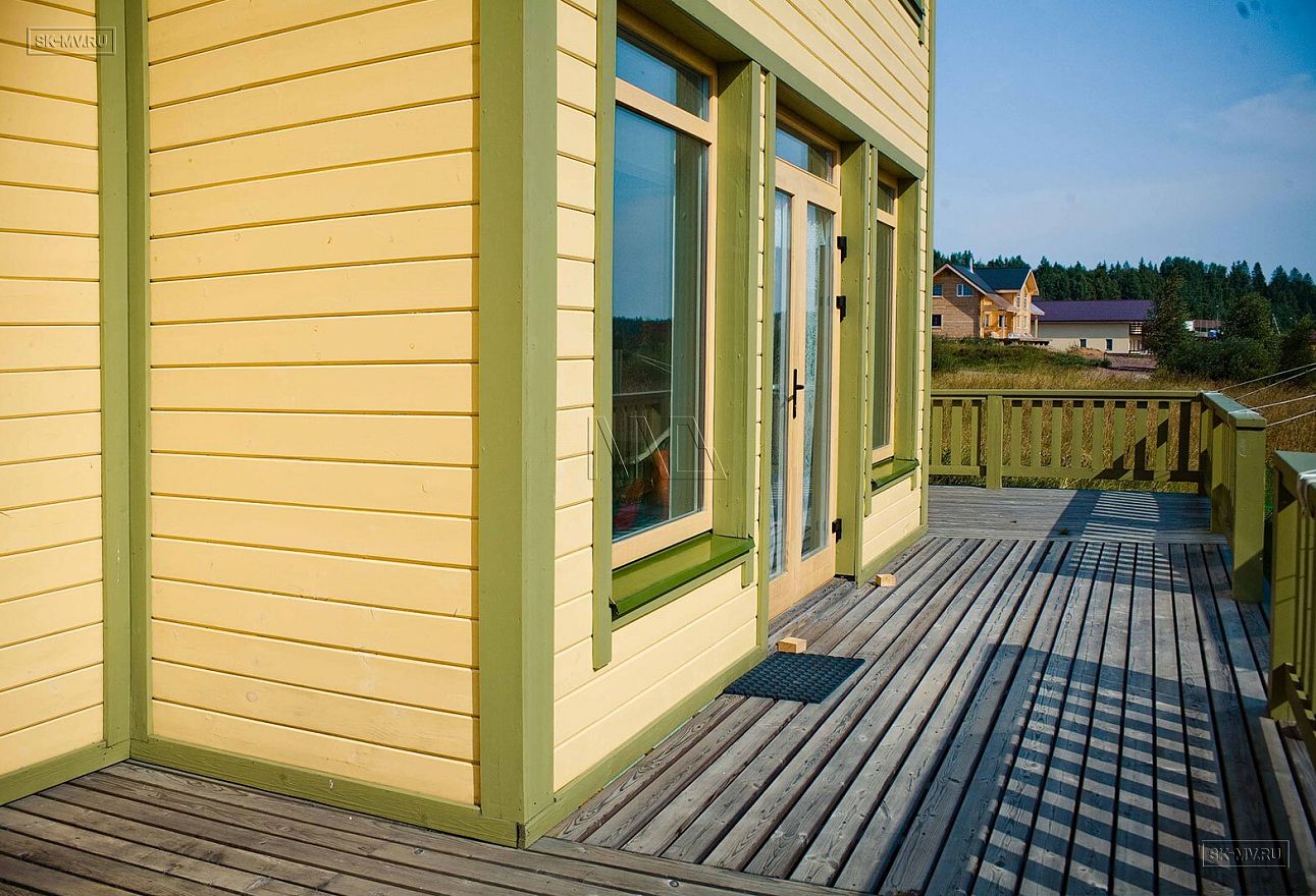 Яркий каркасный дом, представленный на фотографиях, построен по типовому проекту МВ 5 в поселке Гелиос вблизи Санкт-Петербурга. По желанию заказчика внесены изменения в пранировочные решения типового проекта.