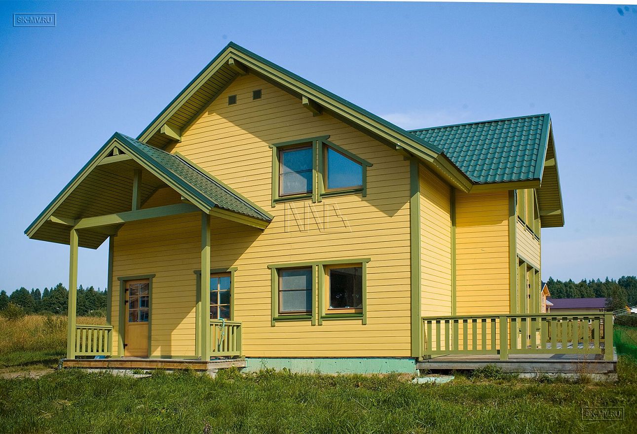 Во сколько обойдется строительство каркасного дома? С ценами можно ознакомиться на страничке с описанием типового проекта МВ 5. Фасад может быть отделан не только в таком оригинальном цвете, но и в любом другом сочетании цветов по вашему желанию. Не забывайте, что всегда есть возможность комбинирования различных материалов и фактур. С примерами работ можно ознакомиться на страничке построенных по этому проекту домов.