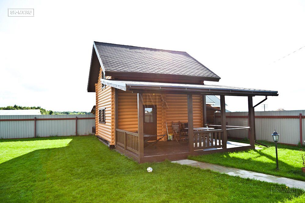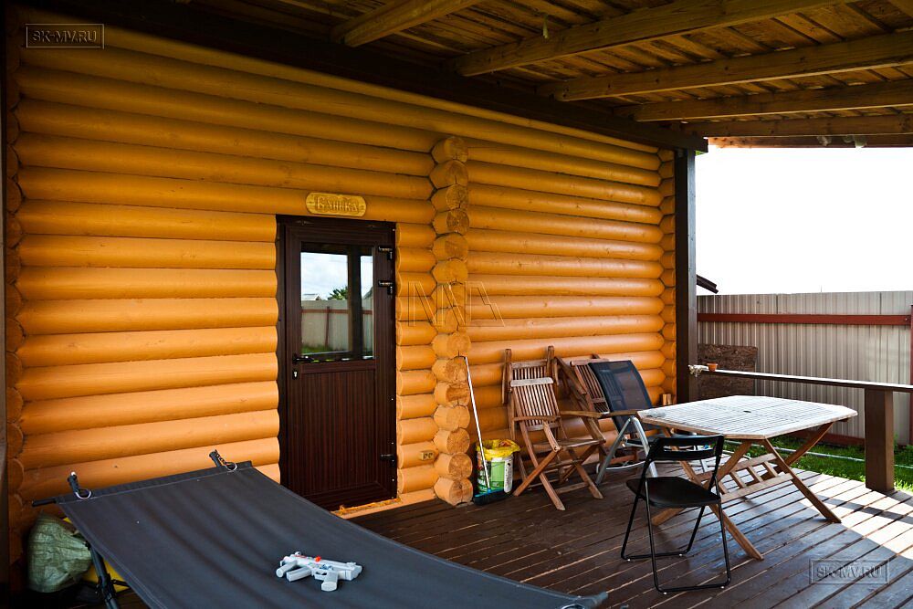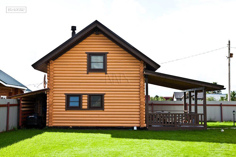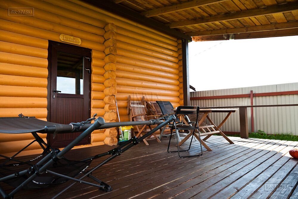 Открытая терраса украшает главный фасада дома. При желании ей можно добавить функциональности, увеличив площадь (сейчас ширина террасы всего 1,5 м) и добавив кровлю, чтобы защитить от воздействия осадков и солнца тех, кто соберется на террасе испить чаю в непогожий или солнечный денек, уютно разместившись в креслах за общим столом.