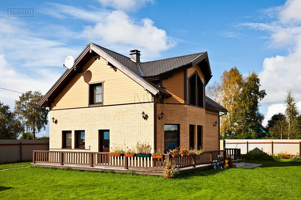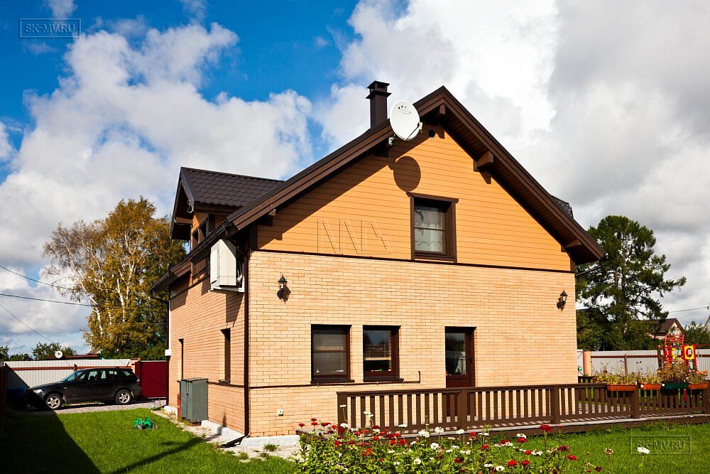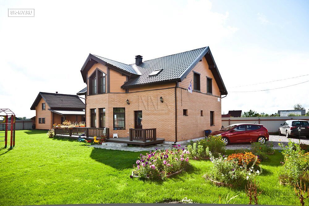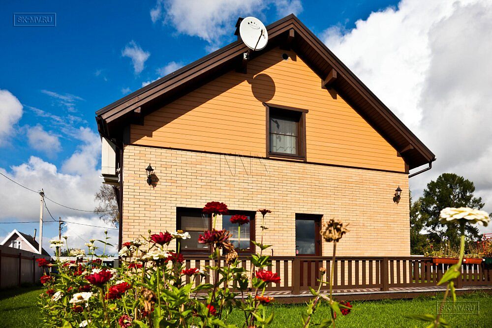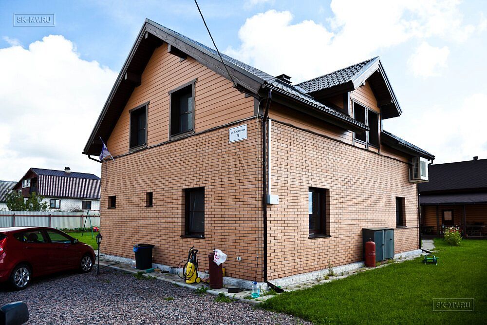 Двухэтажный каркасный дом площадью 150 кв.м с комбинированной кирпичной отделкой фасада построен по типовому проекту «МВ 3» в поселке Горная Шальдиха недалеко от Санкт-Петербурга.