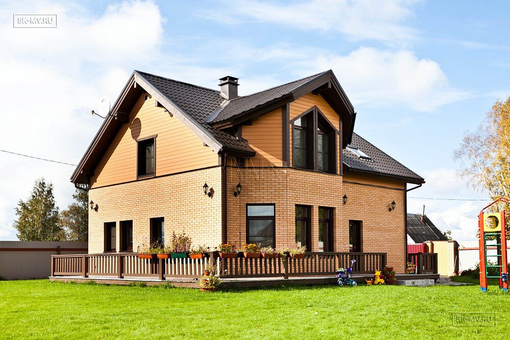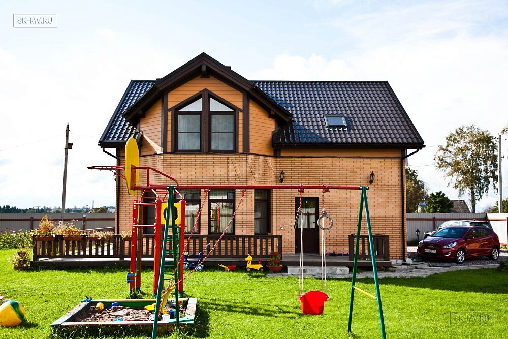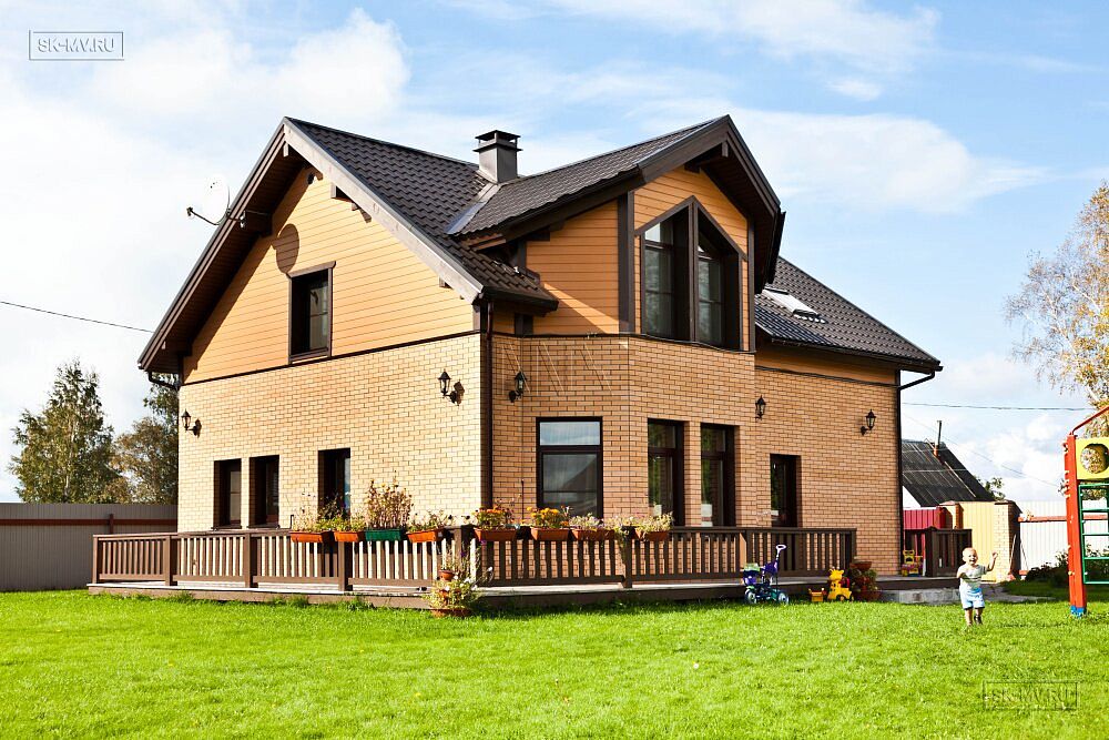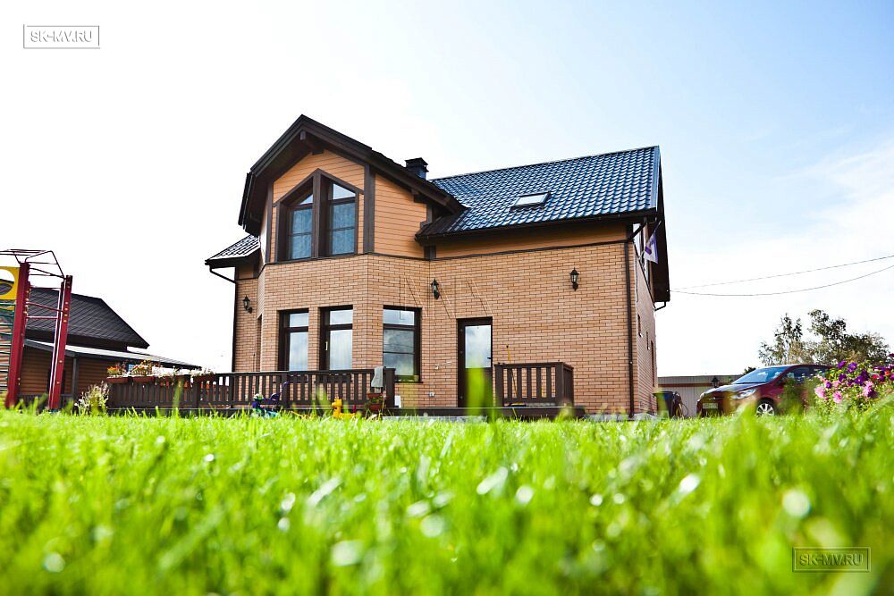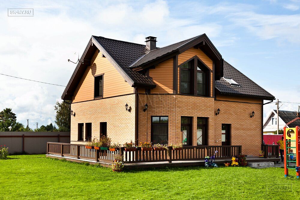 Двухэтажный каркасный дом площадью 150 кв.м с комбинированной кирпичной отделкой фасада построен по типовому проекту «МВ 3» в поселке Горная Шальдиха недалеко от Санкт-Петербурга.