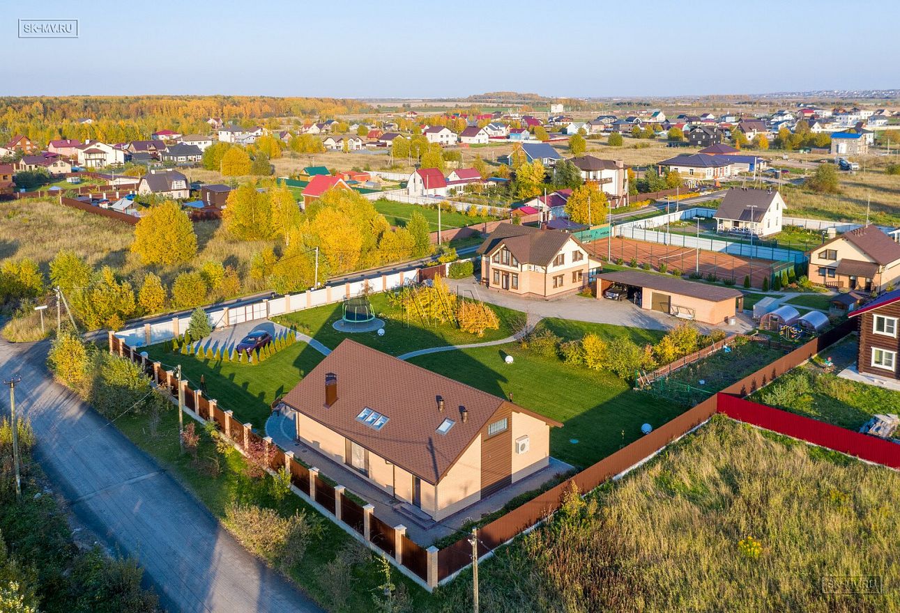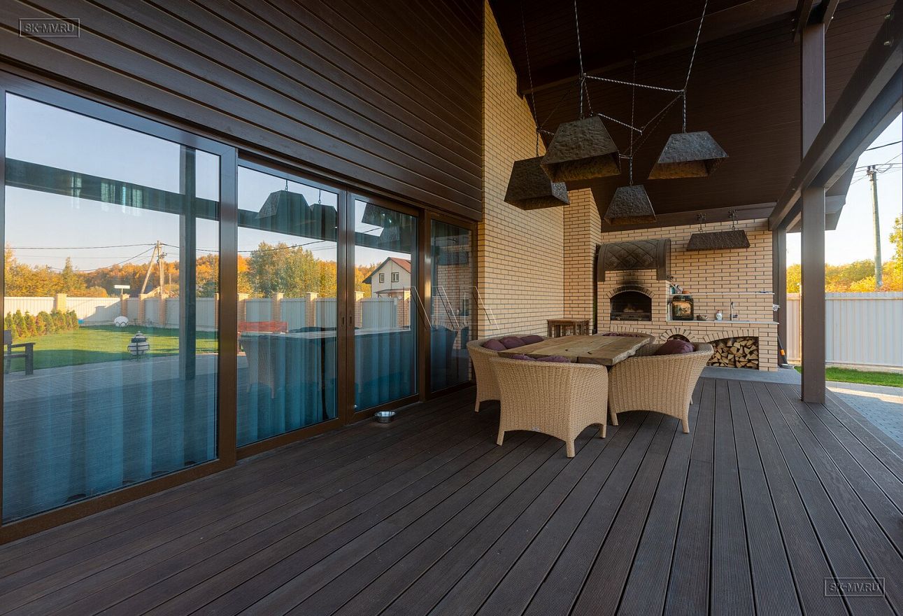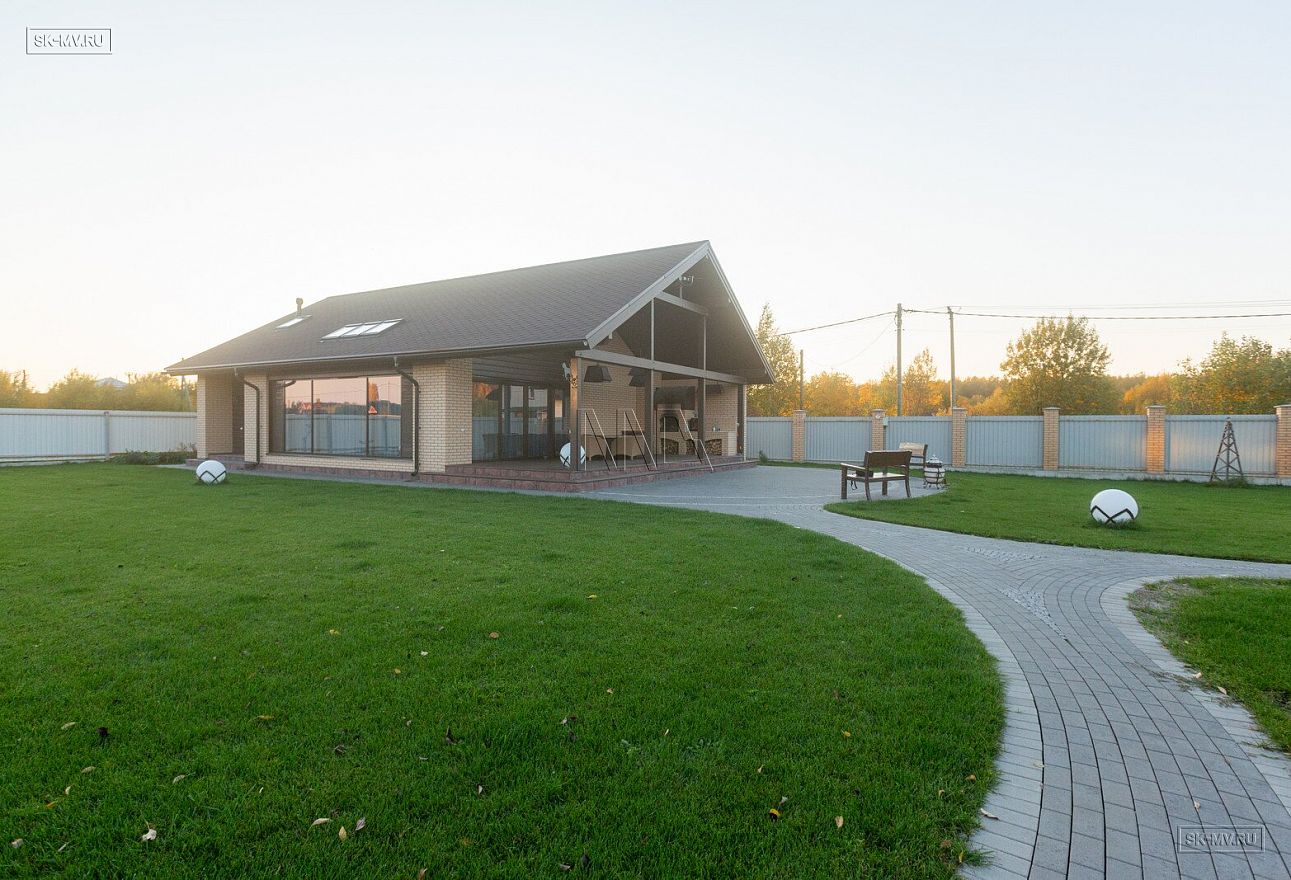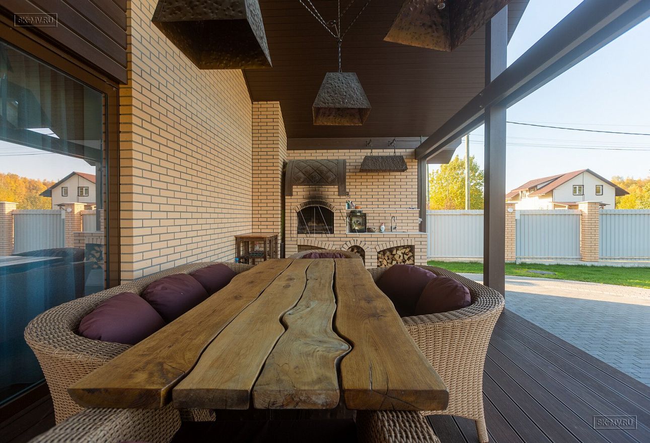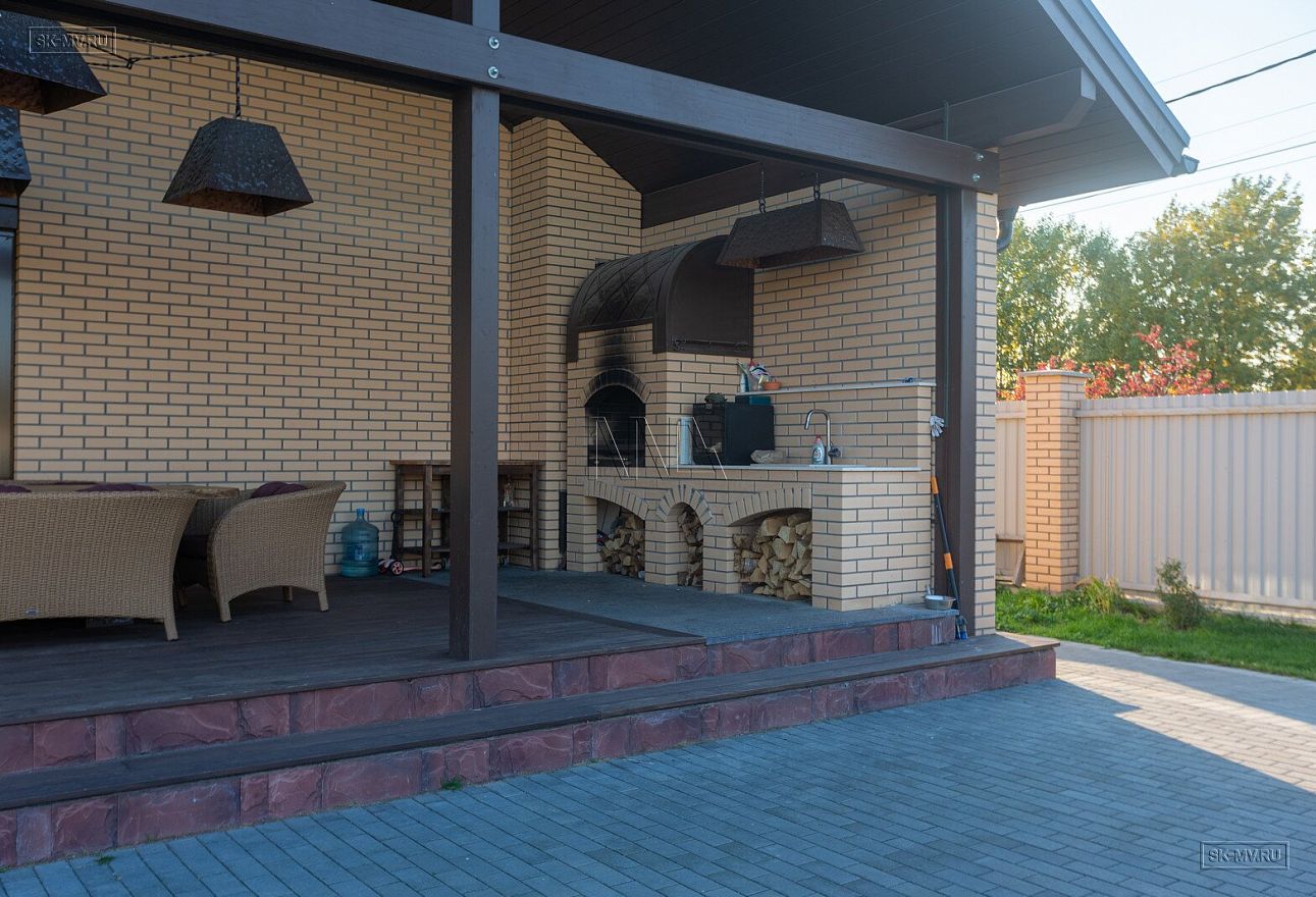 На фотографиях летняя кухня в Оликах с бильярдной и террасой барбекю, 132 кв.м.