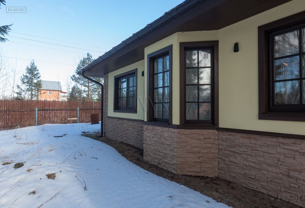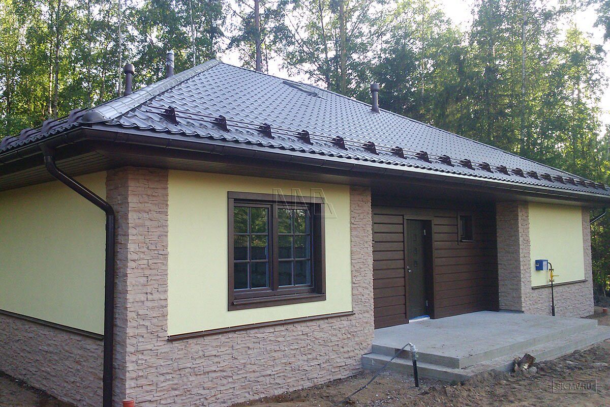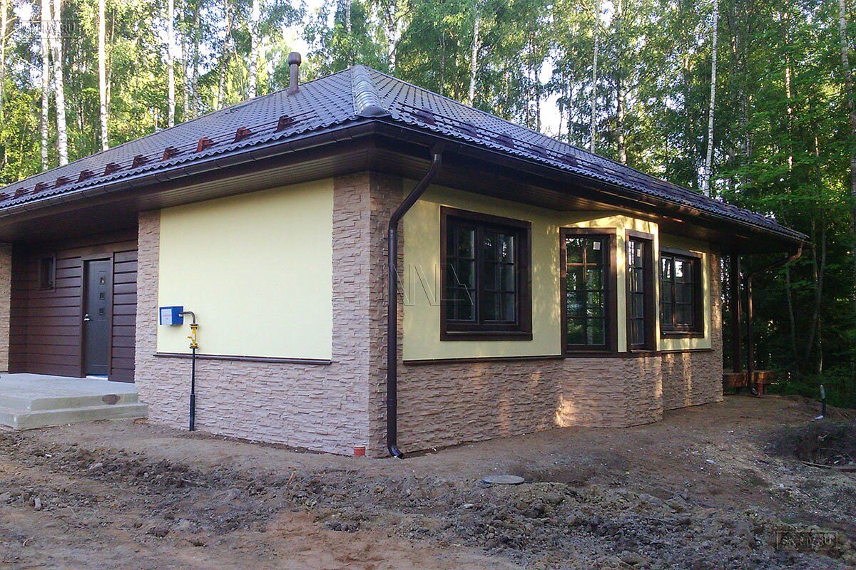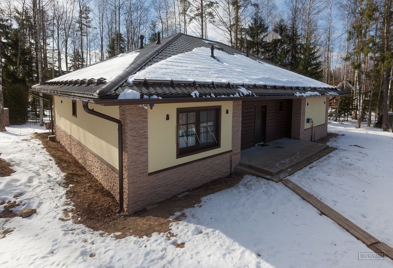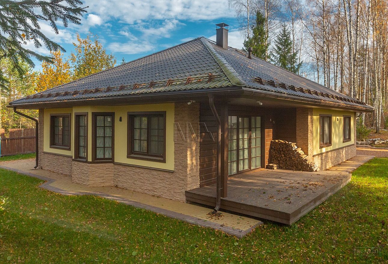 Одноэтажный газобетонный дом площадью почти 150 кв.м с шатровой кровлей, эркером и комбинированной отделкой фасада построен по типовому проекту «Фауна» в Ломоносовском районе Ленинградской области. Строительство дома выполнялось «под ключ» с разводкой коммуникаций и внутренней отделкой. В ближайших планах хозяев работы по благоустройству и озеленению участка.