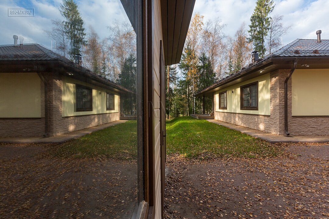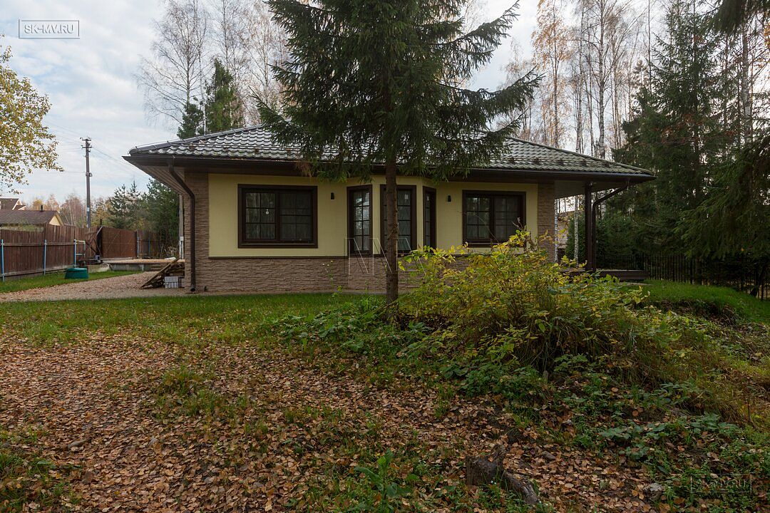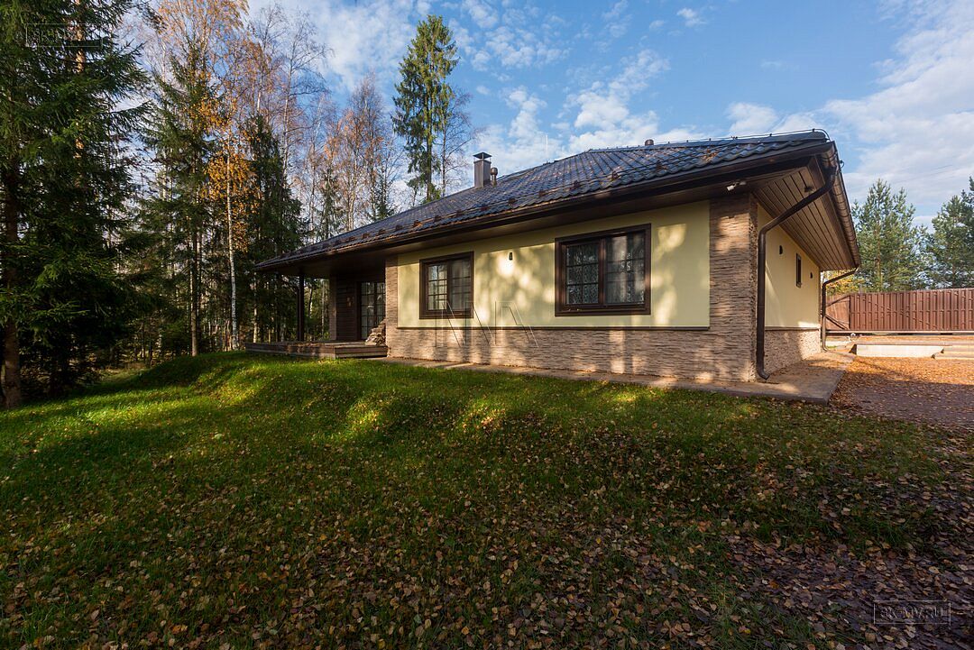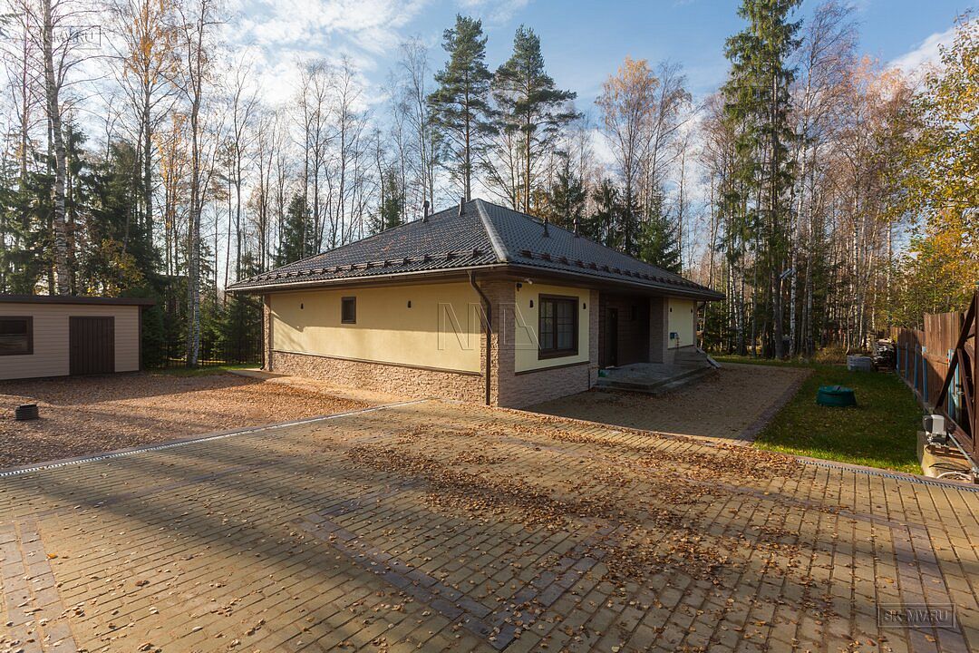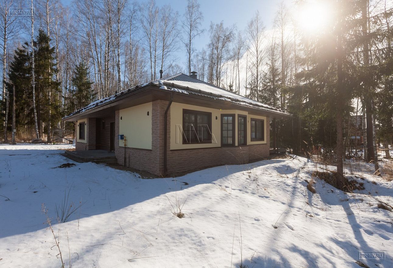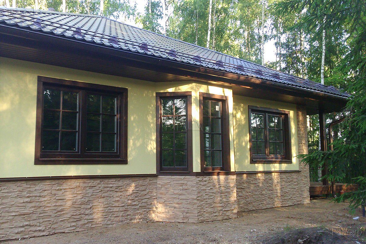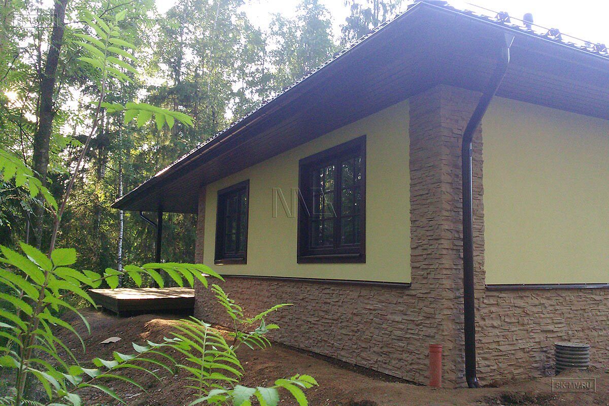 Одноэтажный газобетонный дом площадью почти 150 кв.м с шатровой кровлей, эркером и комбинированной отделкой фасада построен по типовому проекту «Фауна» в Ломоносовском районе Ленинградской области. Строительство дома выполнялось «под ключ» с разводкой коммуникаций и внутренней отделкой. В ближайших планах хозяев работы по благоустройству и озеленению участка.