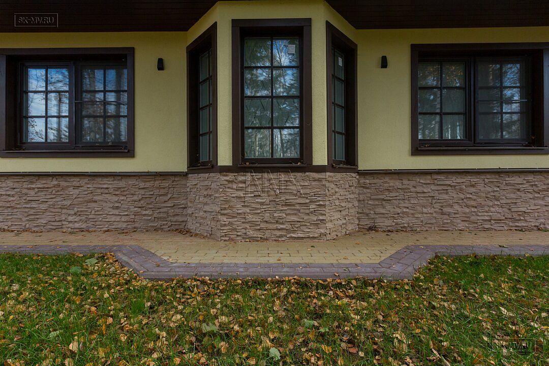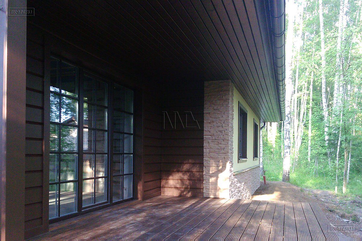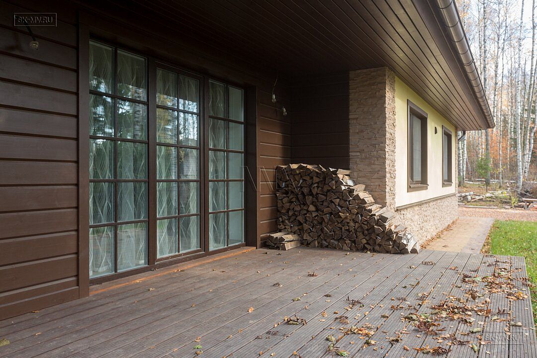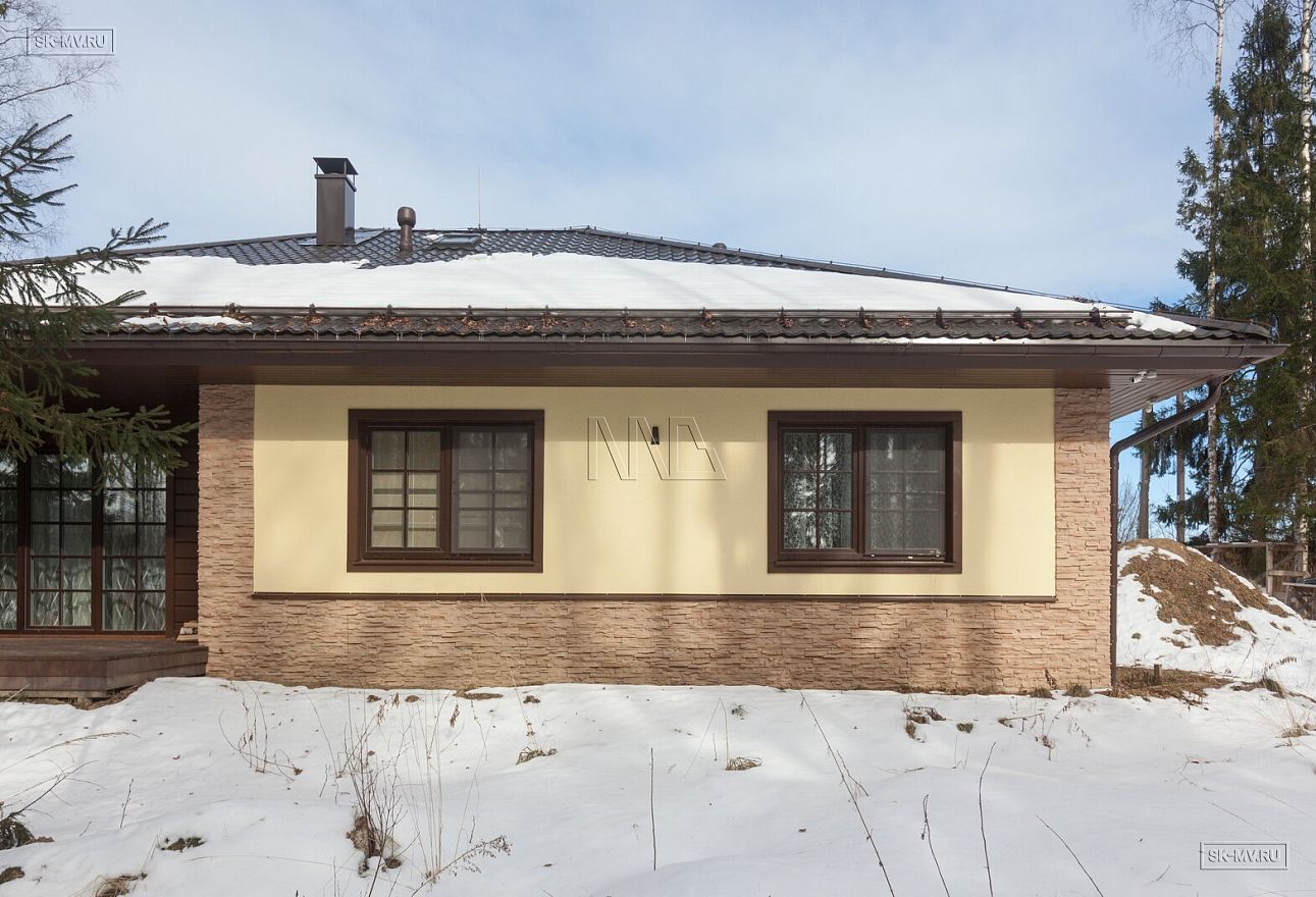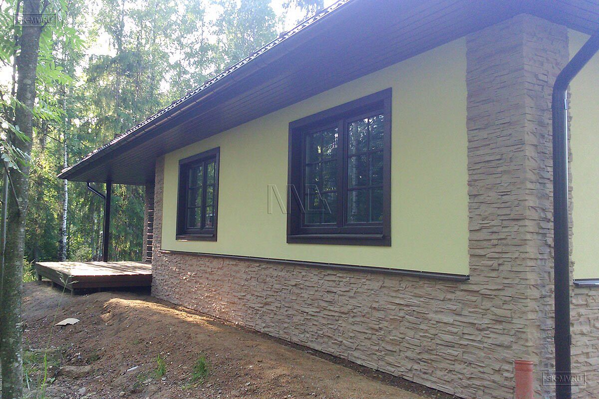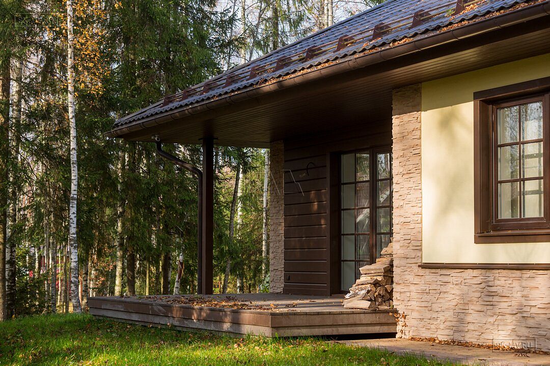 Фасадная отделка дома заслуживает особого внимания. Почему? Потому что это тот редкий случай, когда гармонично на одном фасаде скомбинировано три материала — натуральная штукатурка, отделочная доска и рустовый камень, который формирует основной тон отделки и который все больше и больше архитекторы применяют для облицовки фасада, а не только цоколя.