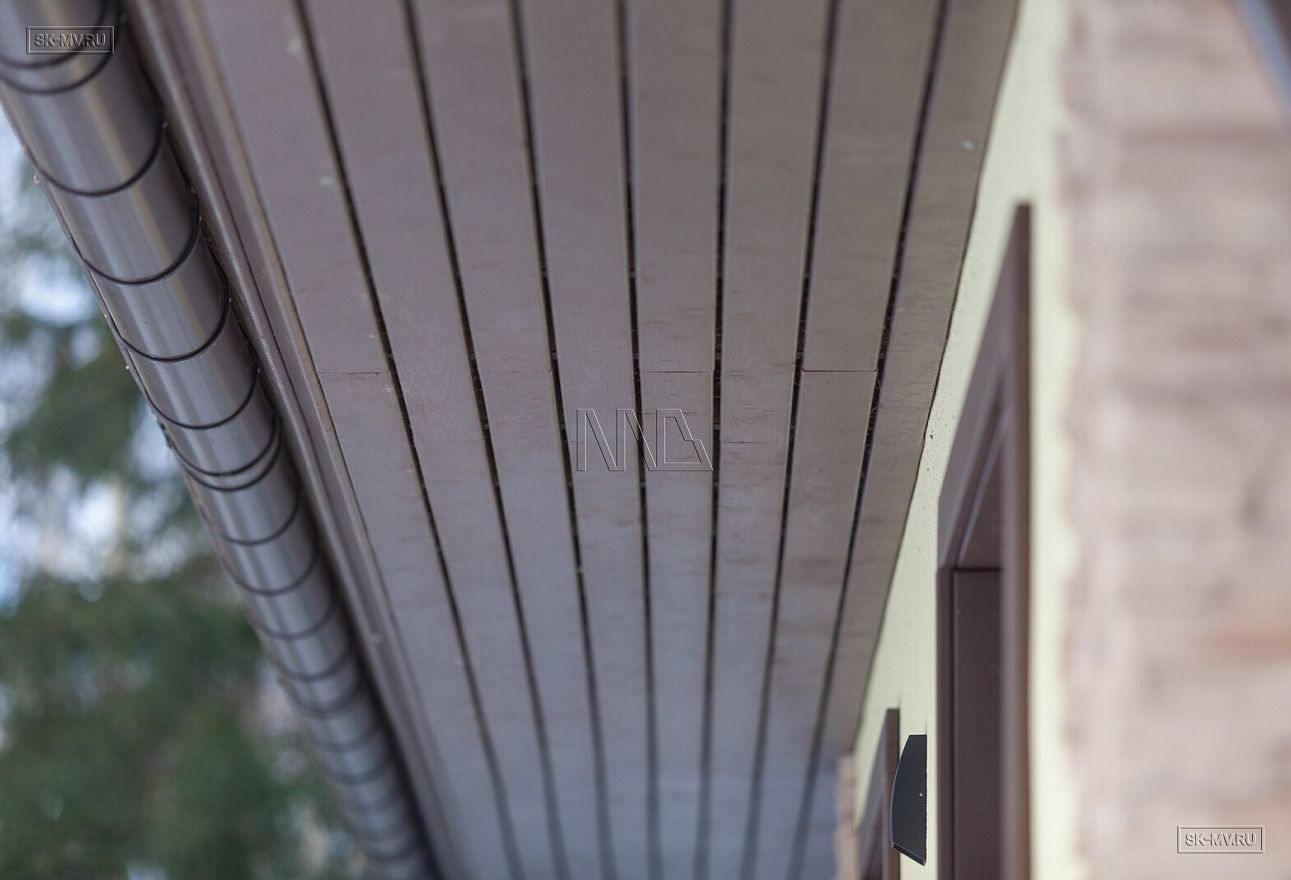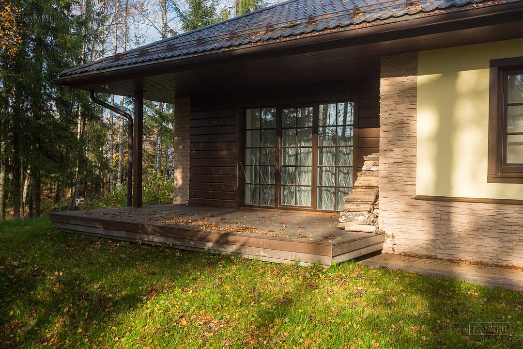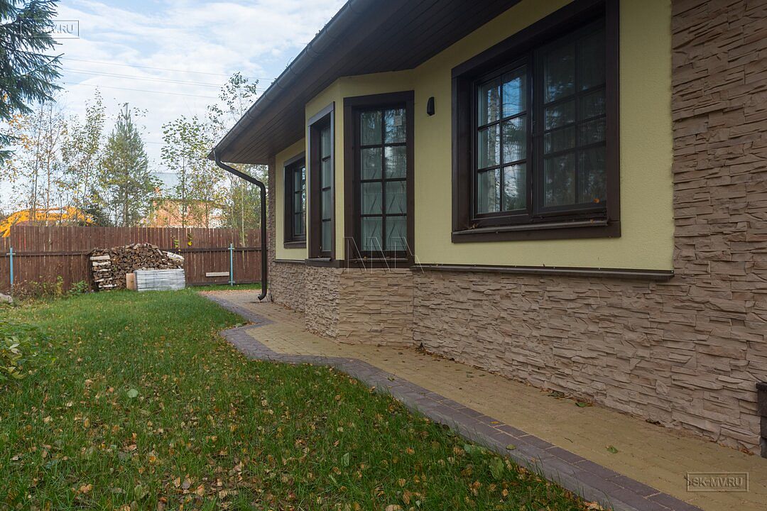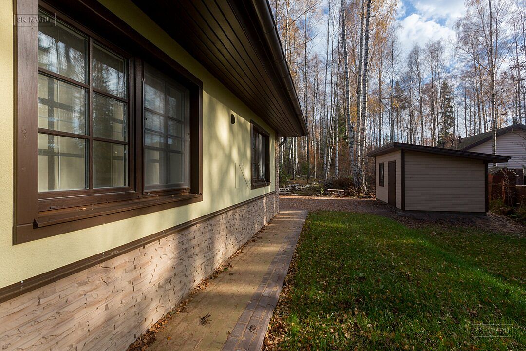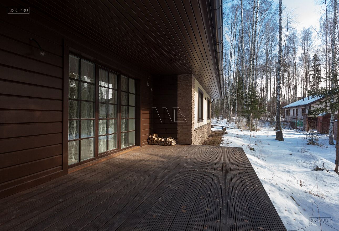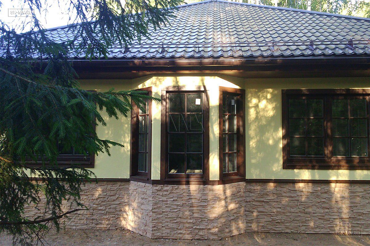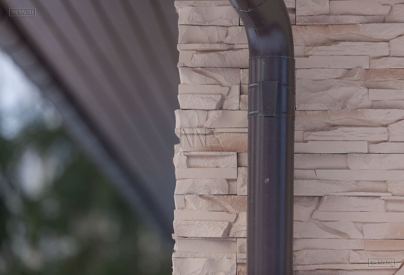Фасадная отделка дома заслуживает особого внимания. Почему? Потому что это тот редкий случай, когда гармонично на одном фасаде скомбинировано три материала — натуральная штукатурка, отделочная доска и рустовый камень, который формирует основной тон отделки и который все больше и больше архитекторы применяют для облицовки фасада, а не только цоколя.