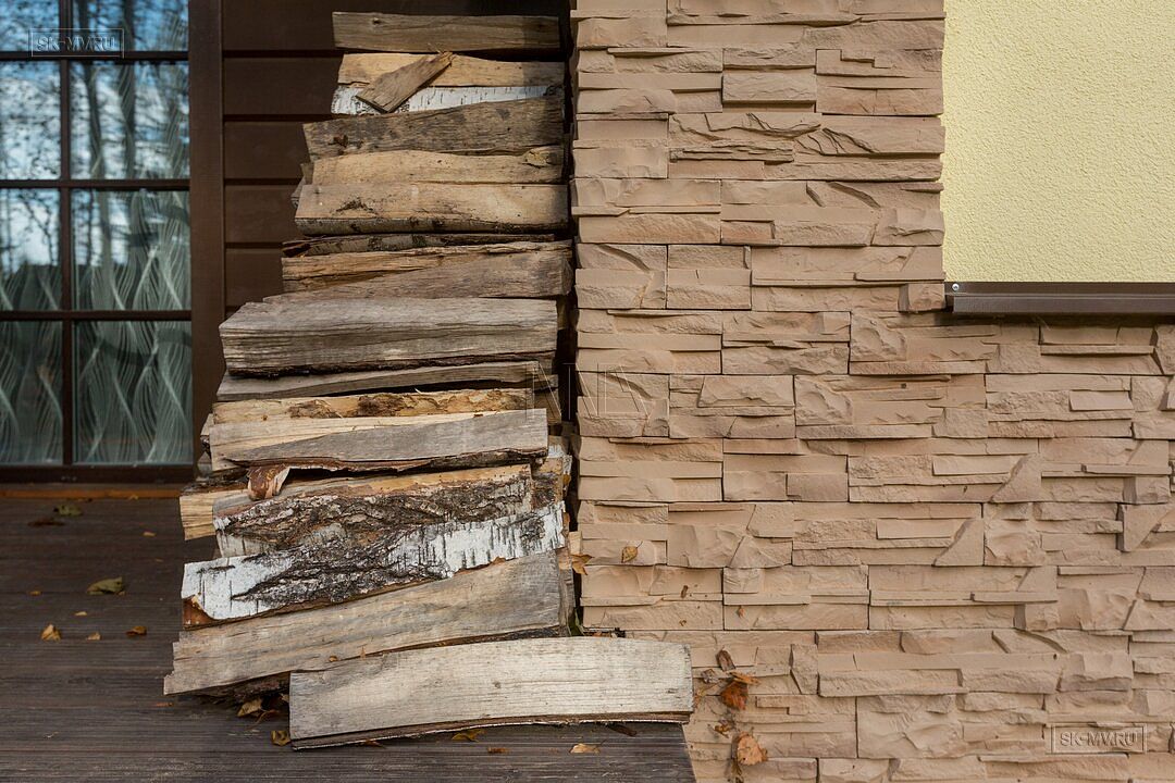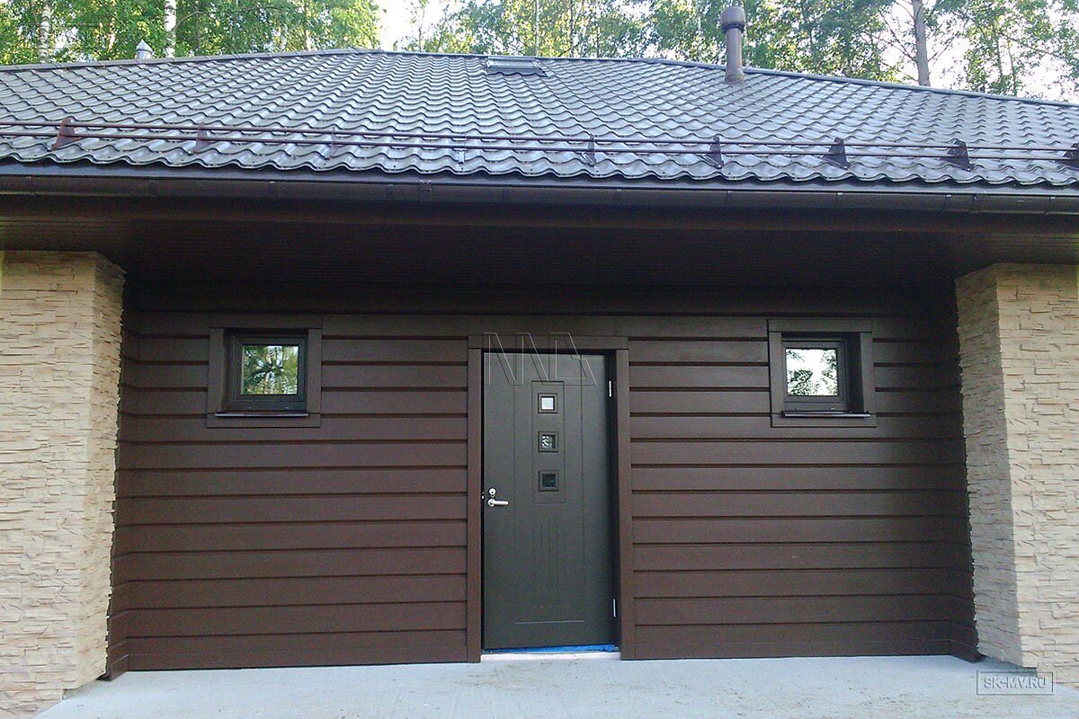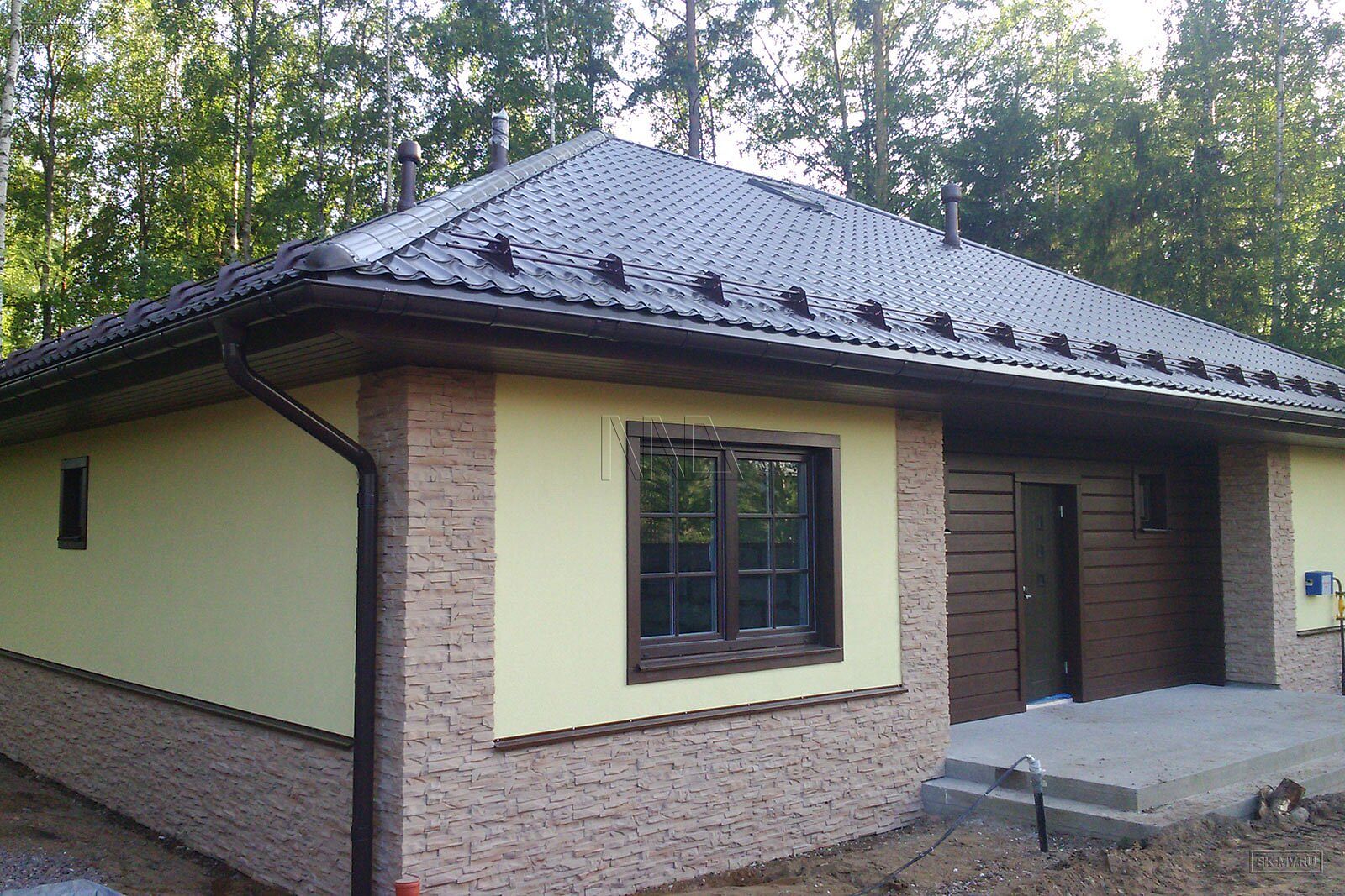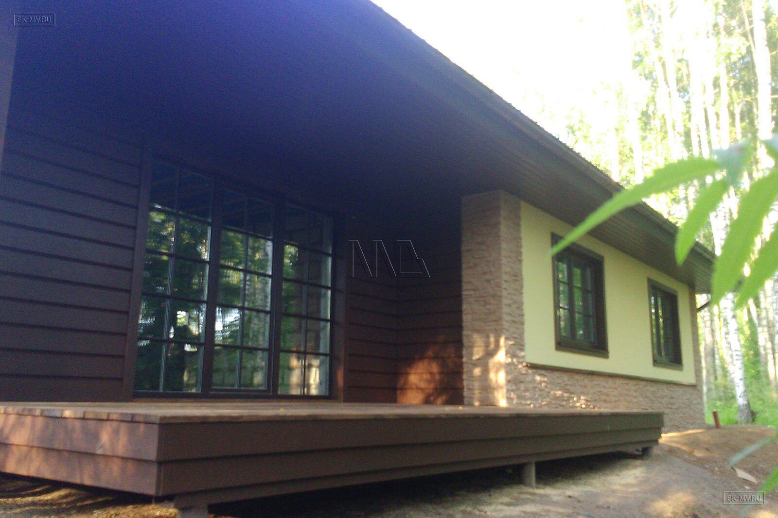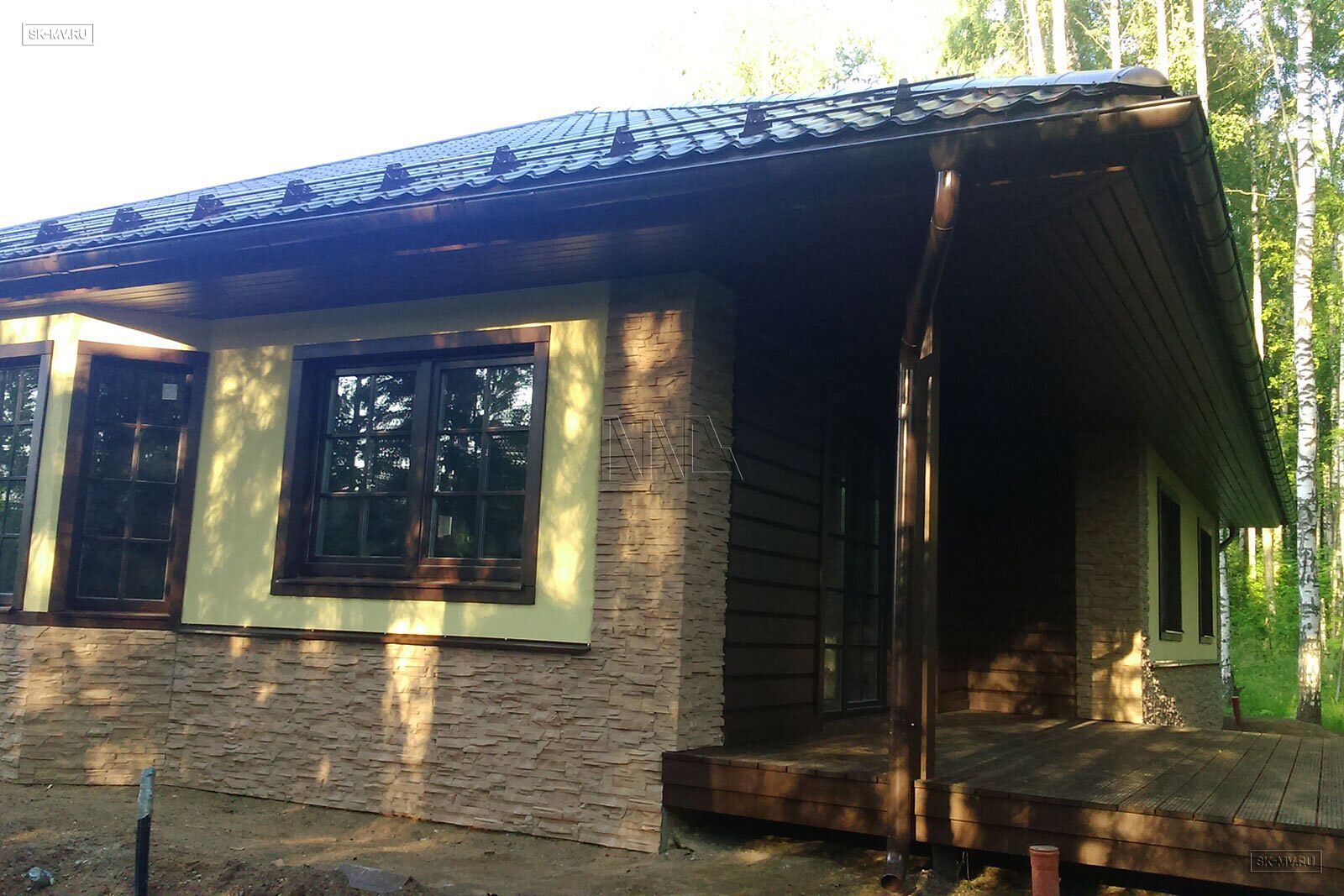 Фасадная отделка дома заслуживает особого внимания. Почему? Потому что это тот редкий случай, когда гармонично на одном фасаде скомбинировано три материала — натуральная штукатурка, отделочная доска и рустовый камень, который формирует основной тон отделки и который все больше и больше архитекторы применяют для облицовки фасада, а не только цоколя.