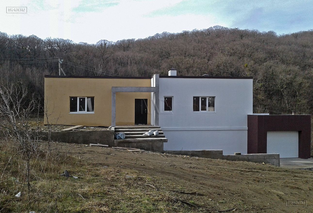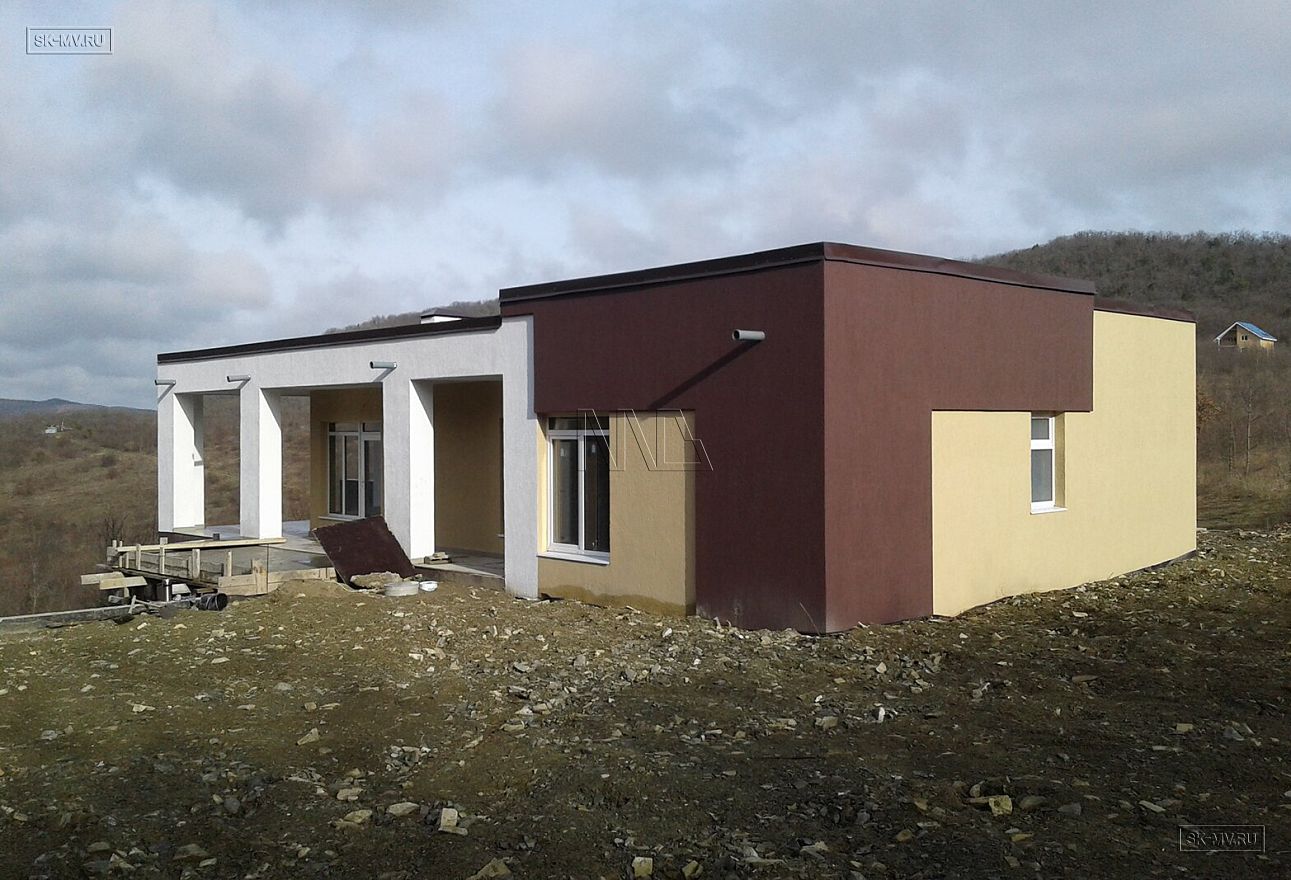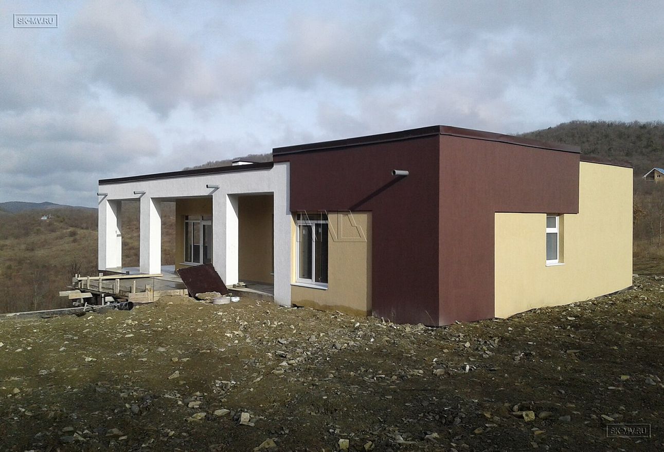Одноэтажный дом в стиле хай тек построен под ключ в коттеджном эко-поселке «Наше место», расположенном в Краснодарском крае недалеко от известного озера Абрау, завода шампанских вин Абрау-Дюрсо и, конечно же, от Черного моря (900 м пешком).