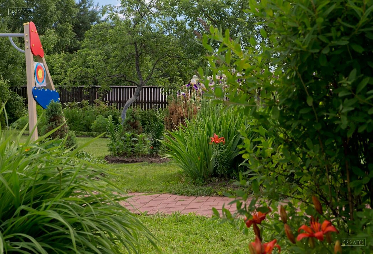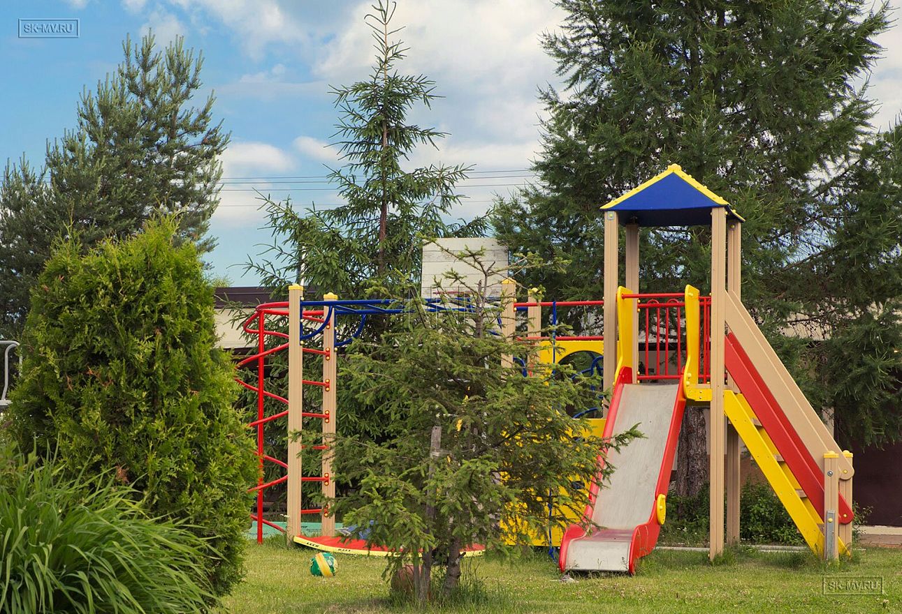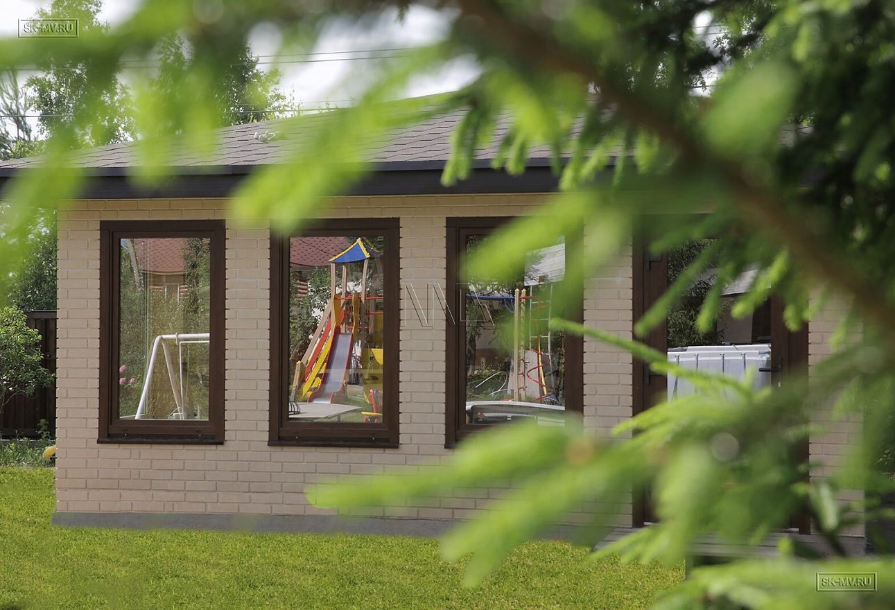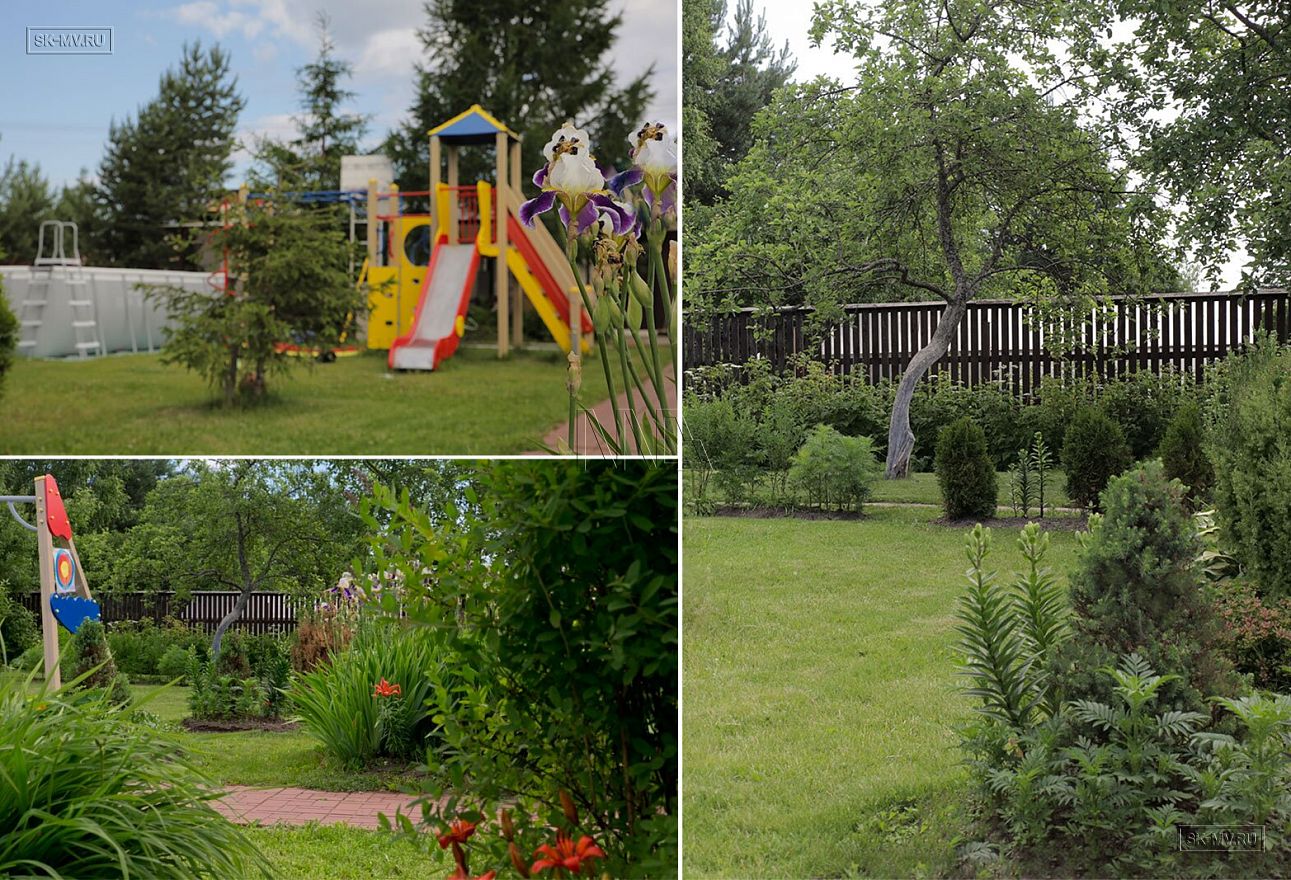 Дополнительно для комфортного отдыха на участке возведена крытая застекленная беседка с летней кухней и барбекю в том же архитектурном стиле, что и дом. Детская площадка, ограждение участка, дорожки и прочие элементы благоустройства территории выполнены в рамках работы над ландшафтным дизайном и озеленением территории.