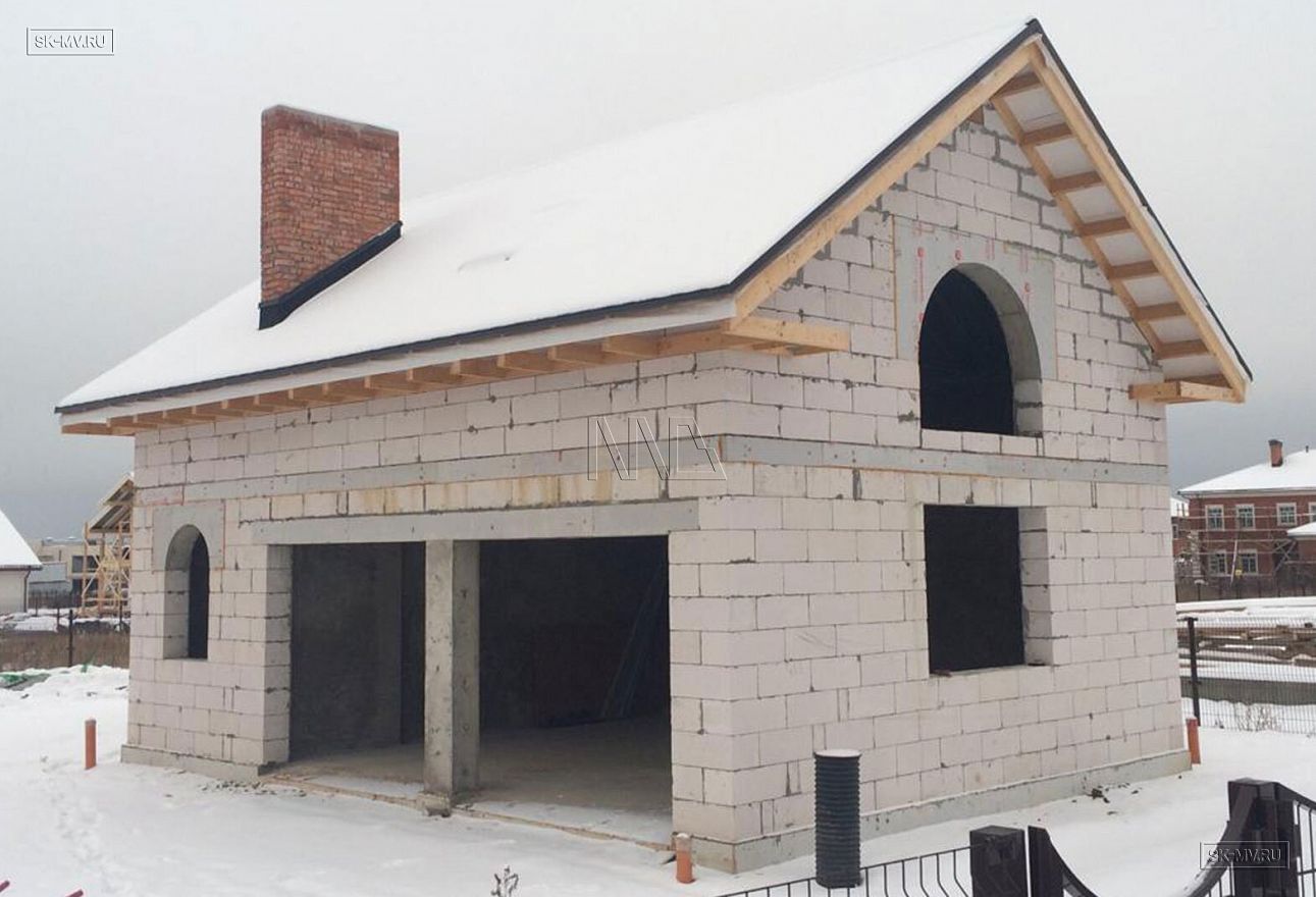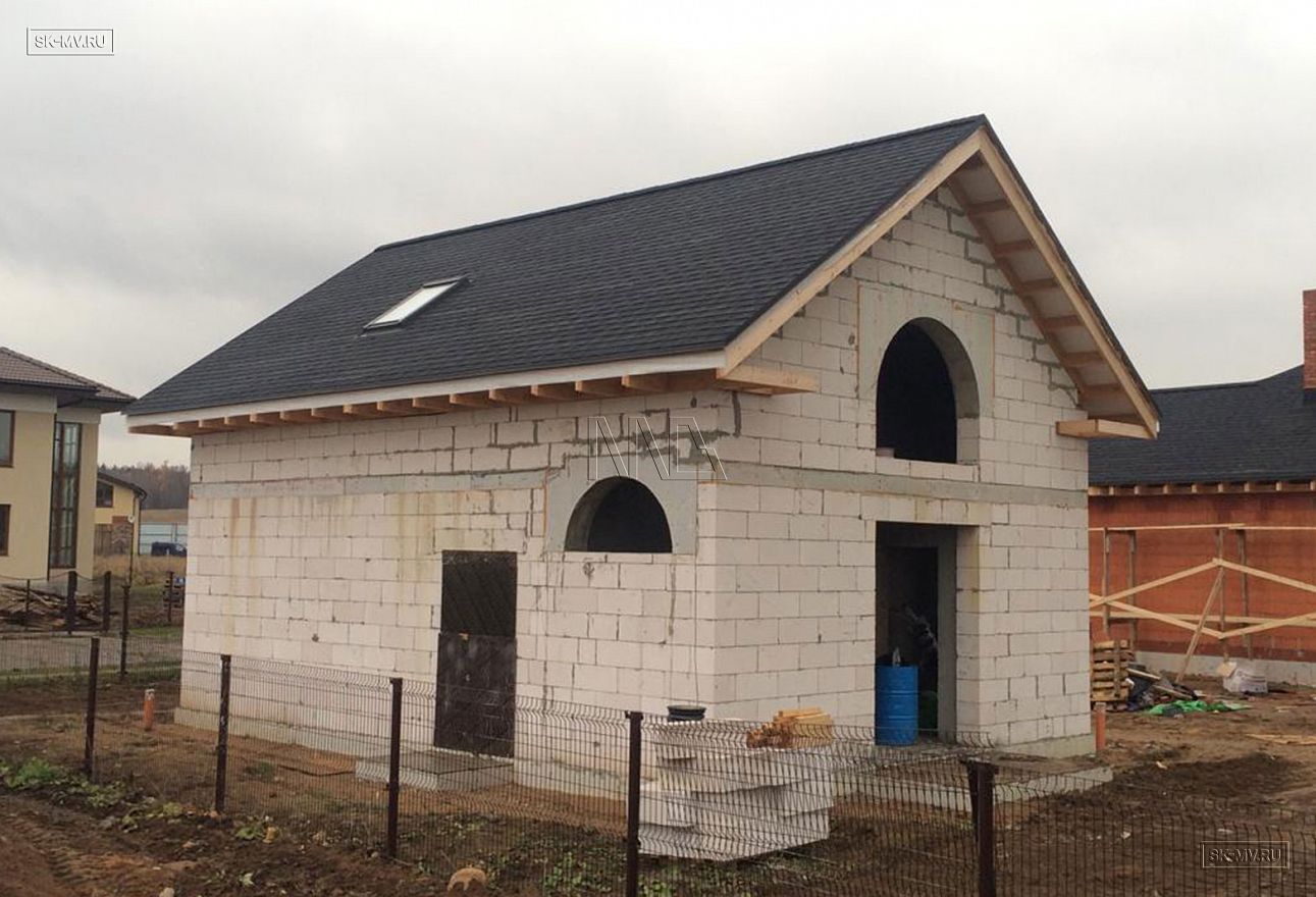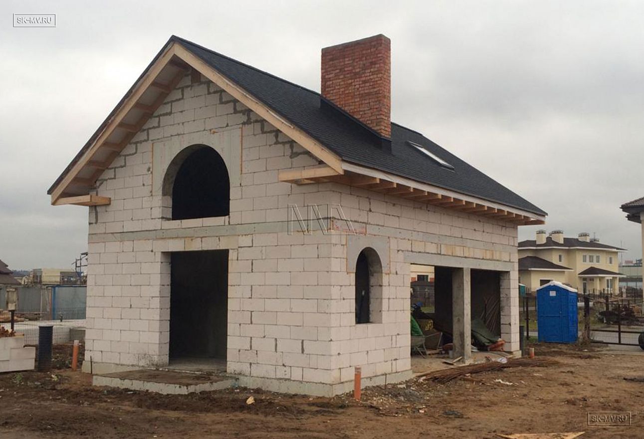 Строительство одноэтажного газобетонного гаража на два автомобиля с мансардным жилым этажом площадью 111 кв.м по индивидуальному проекту ведется в ЖК «Новорижский» Московской области, Инстринском районе. Как у основного жилого дома фасадная отделка гаража будет выполнена из дагестанского камня. Основное здание и гараж выполнены единым архитектурным ансамблем с большими арочными окнами, формой, стилистикой. Но из разных материалов для несущих и ограждающих конструкций: жилой дом — из кирпича, гараж с мансардным этажом — из газобетона.