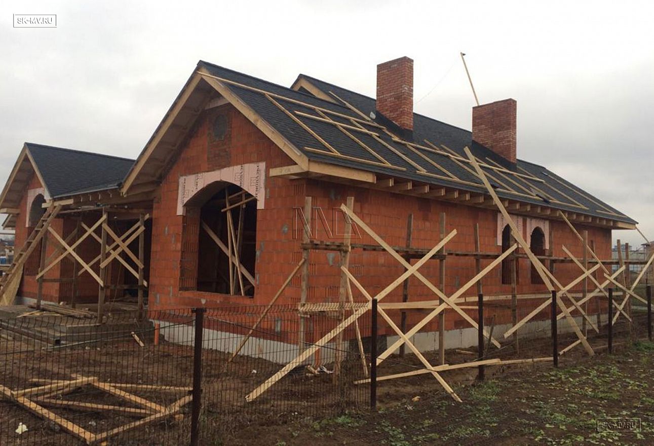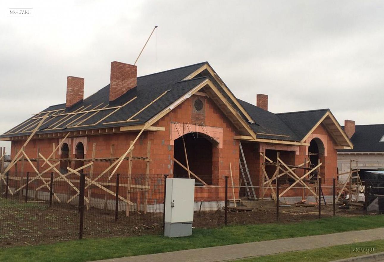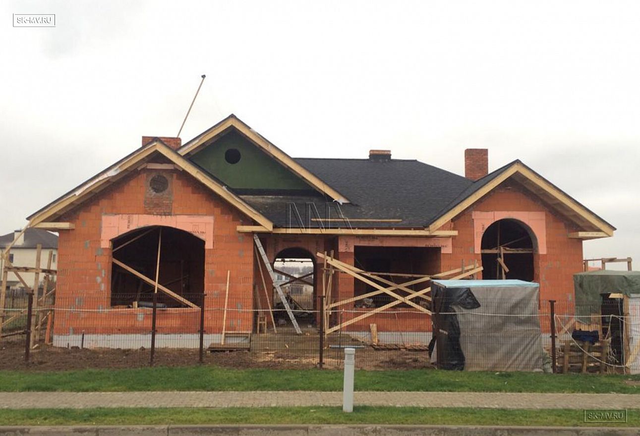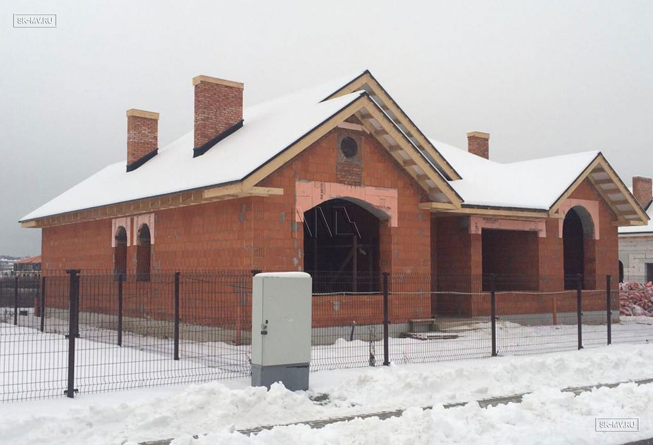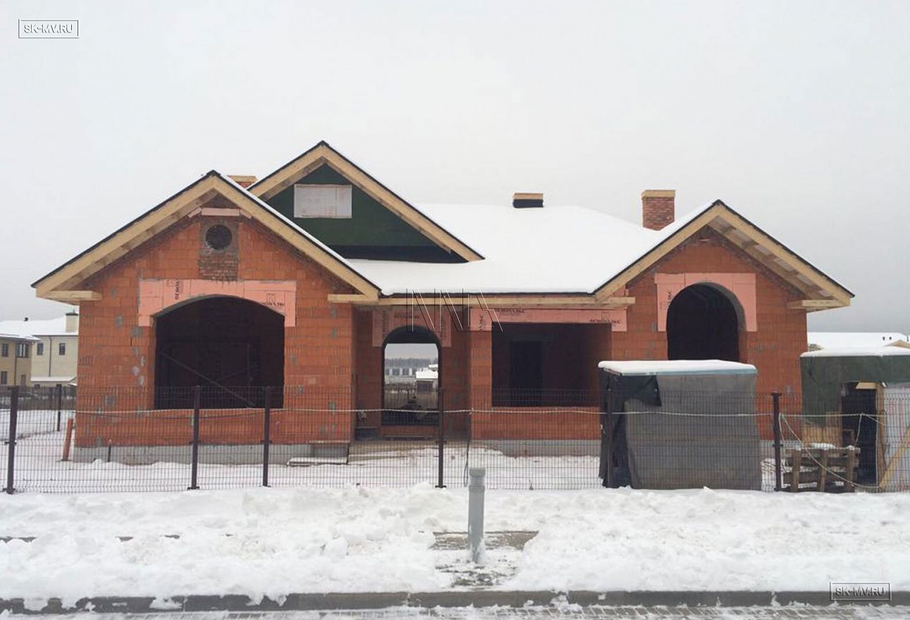 Строительство одноэтажного кирпичного дома по индивидуальному проекту ведется в Московской области в Инстринском районе, ЖК «Новорижский». Из главных архитектурных особенностей проекта можно выделить большую площадь остекления фасада дома, четыре кирпичные вентиляционные шахты, наличие бассейна и высокие потолки. Внешняя отделка дома будет выполнена из дагестанского камня.