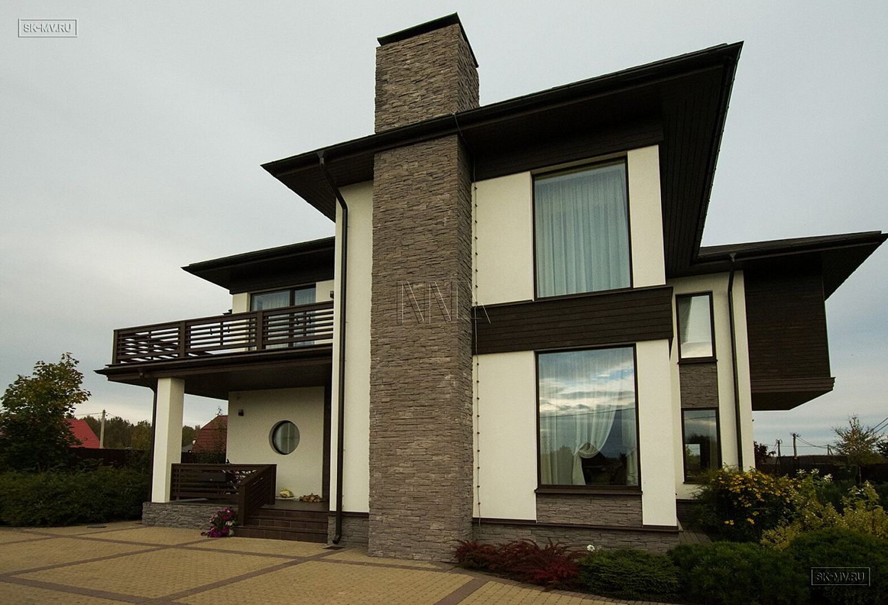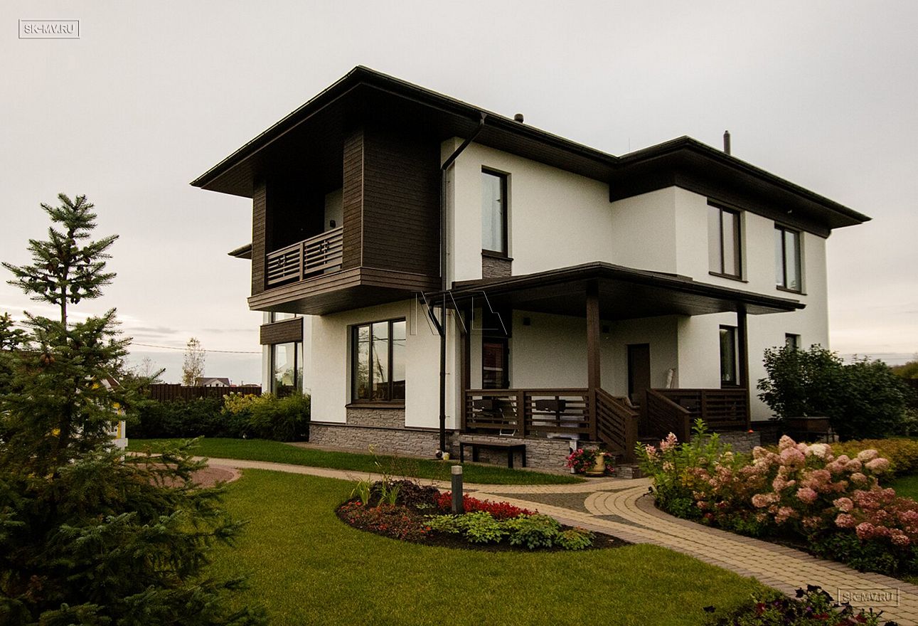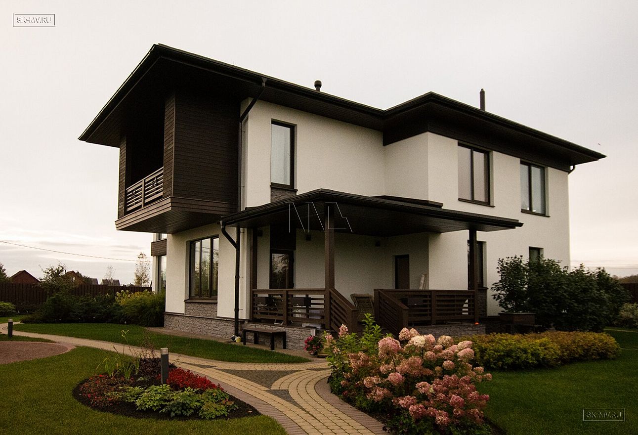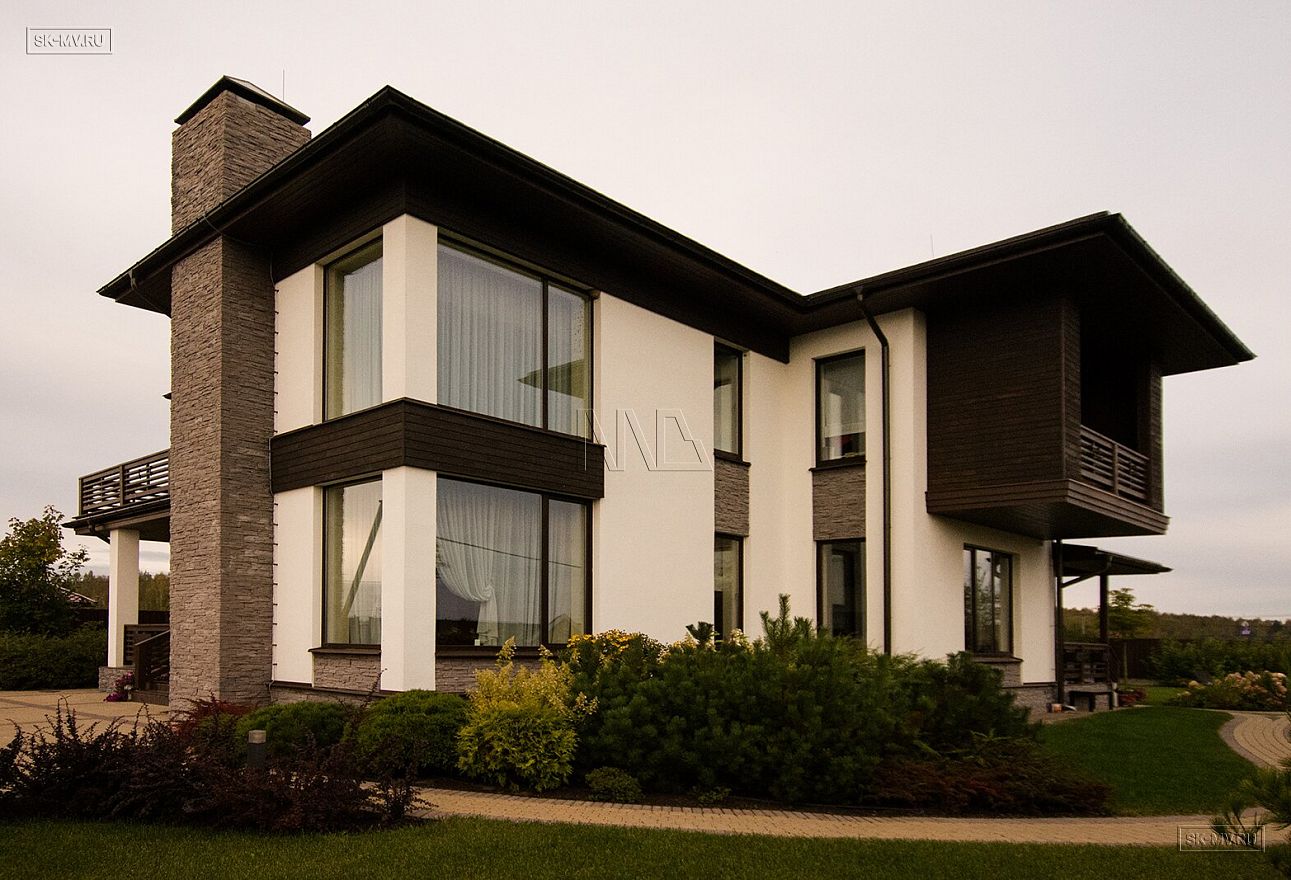 Построенный дом нравится исключительно всем: и гостям, и хозяевам. Простые прямые формы дома с большими угловыми панорамными окнами есть суть этого проекта. Гостиная освещена естественным светом в течение всего дня и наполнена воздухом за счет второго света. Простые формы дают возможность для лаконичного оформления фасада: белая силикатная штукатурка и коричневая облицовочная доска собраны в единый облик элементами из рустового камня цвета «какао с молоком». Это новое модное сочетание цветов находит все больше приверженцев — архитекторов и заказчиков.