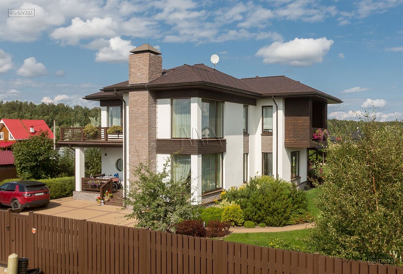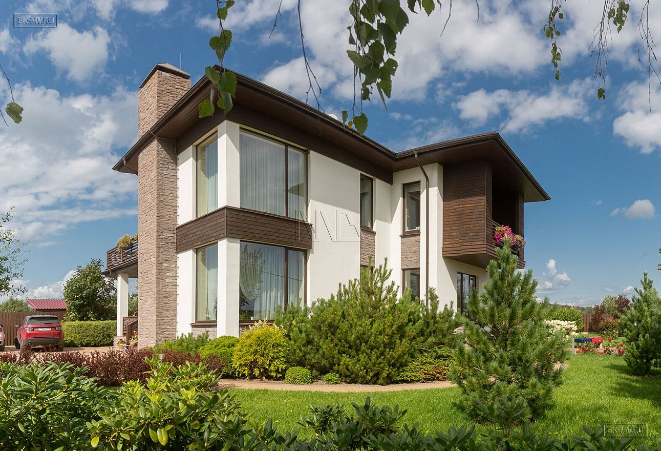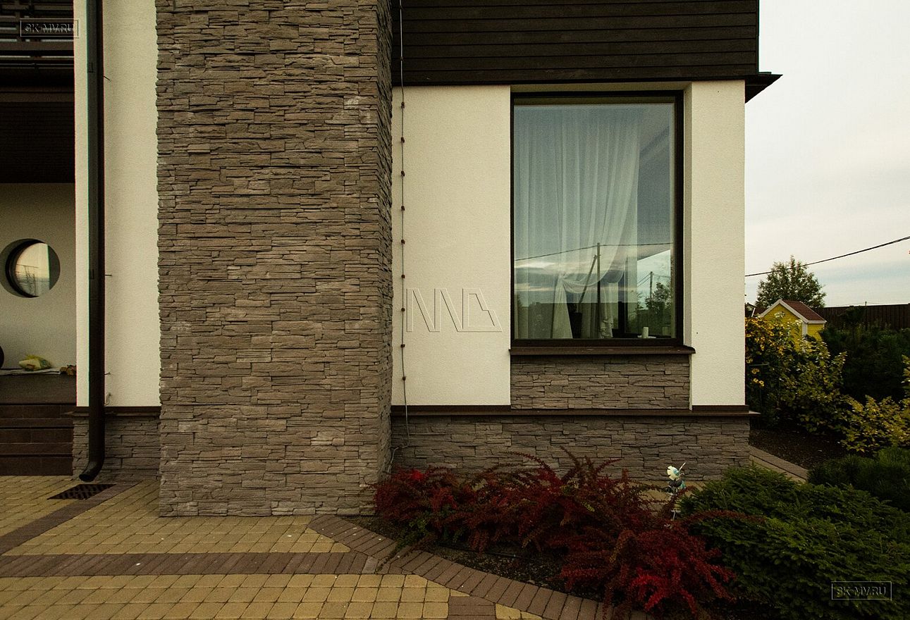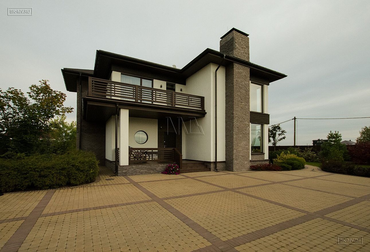 Построенный дом нравится исключительно всем: и гостям, и хозяевам. Простые прямые формы дома с большими угловыми панорамными окнами есть суть этого проекта. Гостиная освещена естественным светом в течение всего дня и наполнена воздухом за счет второго света. Простые формы дают возможность для лаконичного оформления фасада: белая силикатная штукатурка и коричневая облицовочная доска собраны в единый облик элементами из рустового камня цвета «какао с молоком». Это новое модное сочетание цветов находит все больше приверженцев — архитекторов и заказчиков.