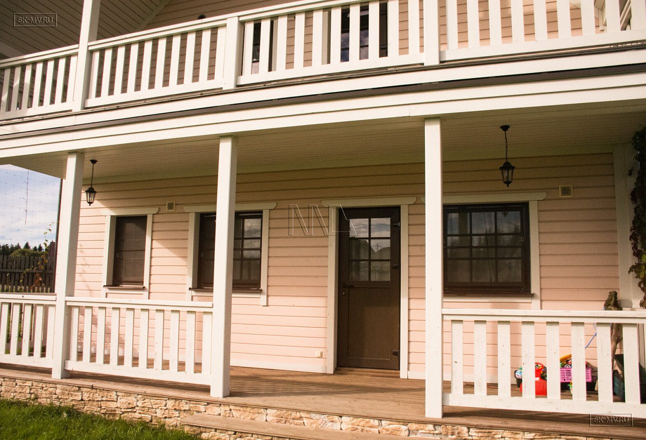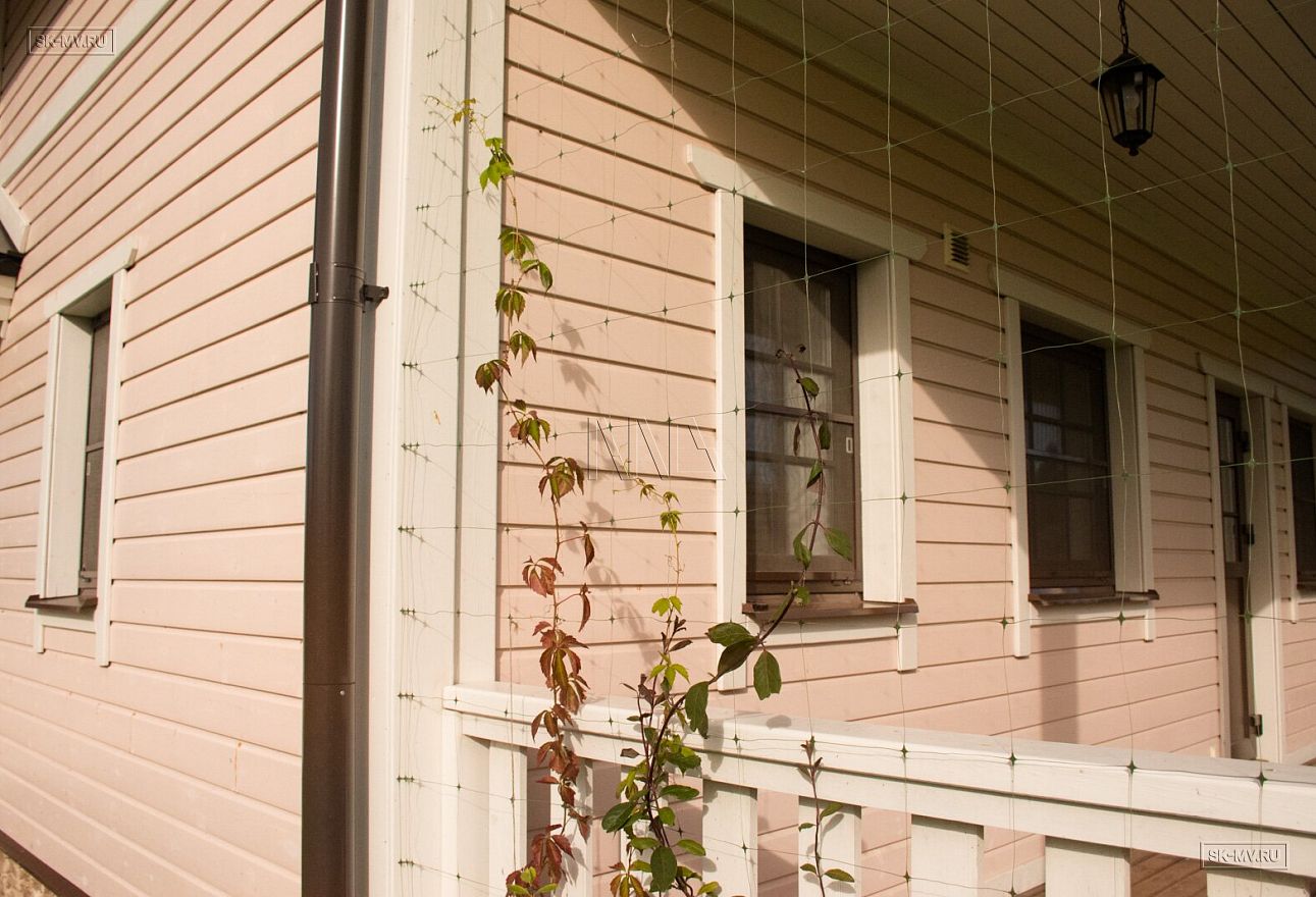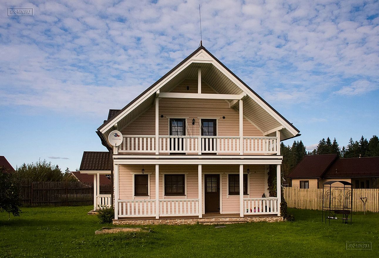 Внешний облик дома действительно необычный — сочетание нежной розовой вагонки, коричневых оконных и дверных изделий и коричневой кровли, дополненные белыми декоративными стойками, балками и наличниками. Большая терраса с выходом из гостиной и большой глубокий балкон с выходом из каждой спальни — элементы лапландской архитектуры, которая обязана учитывать климатические особенности региона и частые осадки, создавая тем не менее пространство для комфортного отдыха.