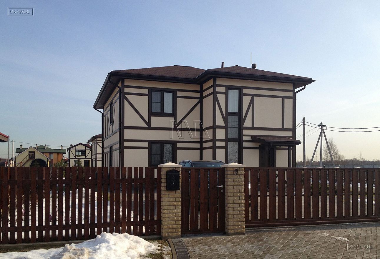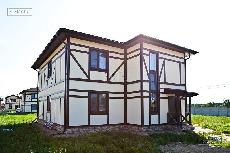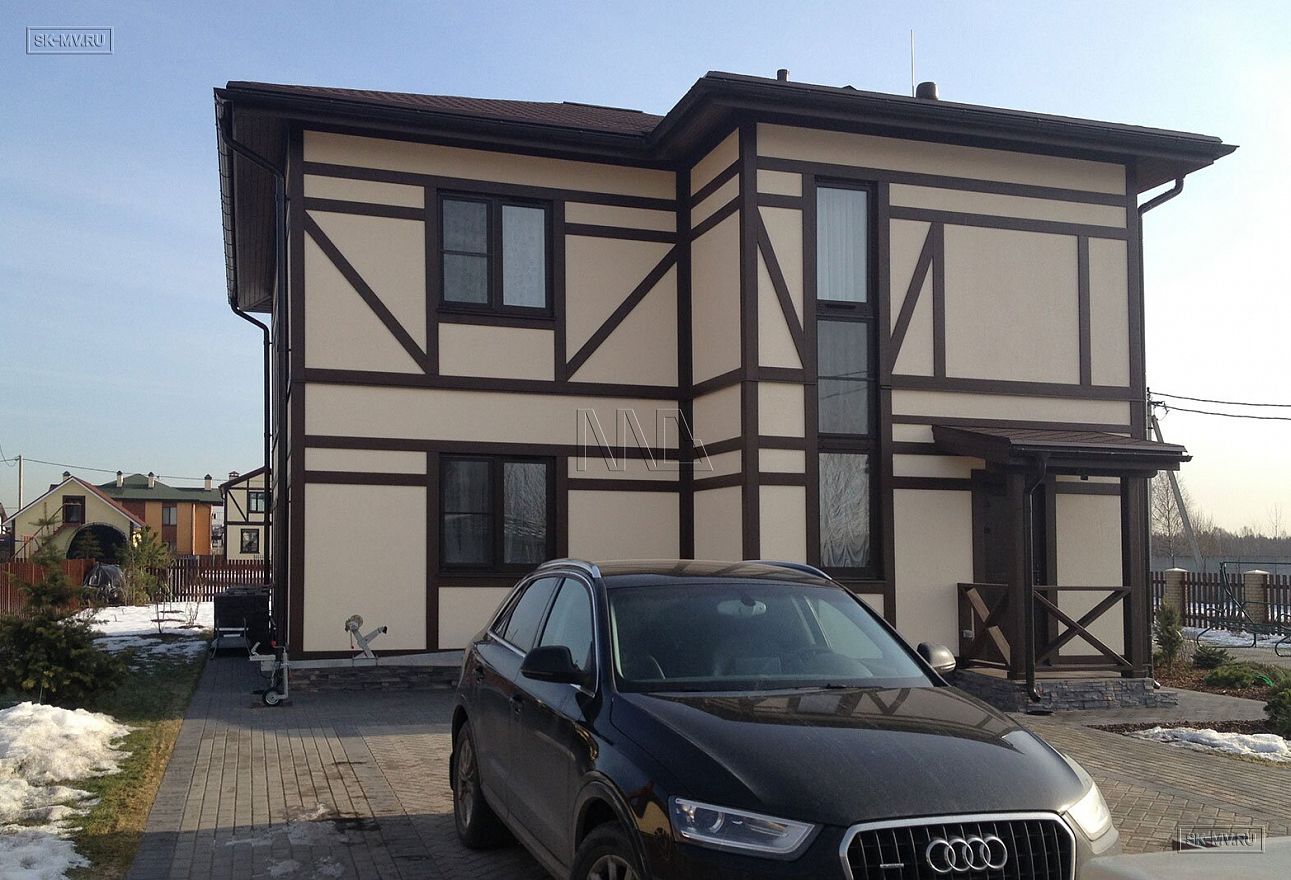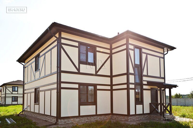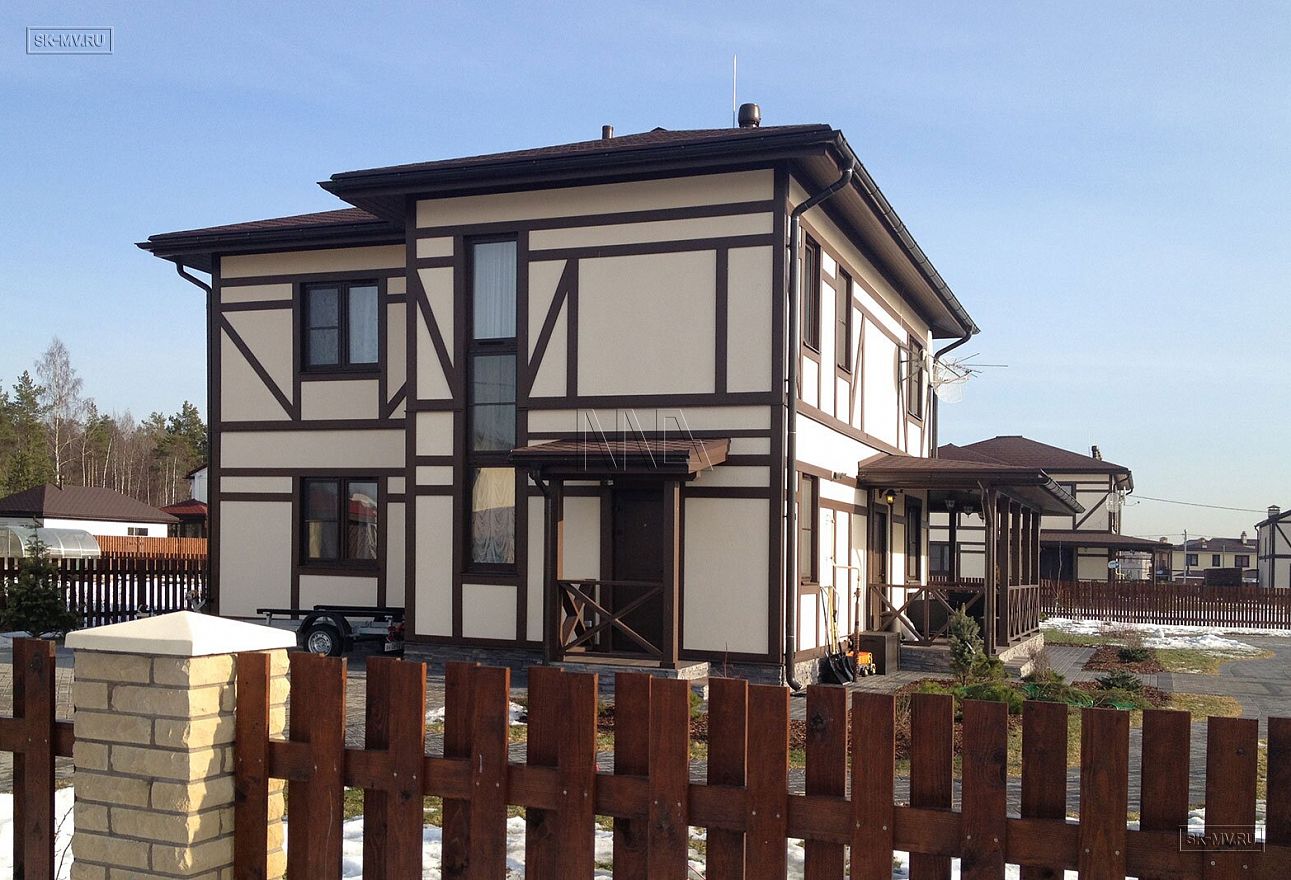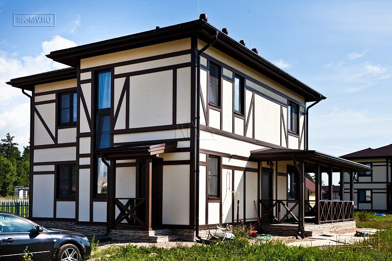 Каркасный дом в стиле фахверк площадью почти 200 кв.м построен в поселке Парквэй в Ленинградской области по одноименному проекту «Парквэй». Имитация балок и стоек декоративными коричневыми планками на белом оштукатуренном фасаде смотрится красиво и презентабельно. Фасадная отделка каркасного дома в стиле фахверк вполне доступна по цене.