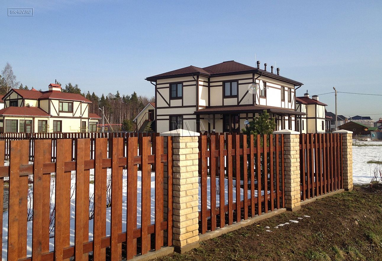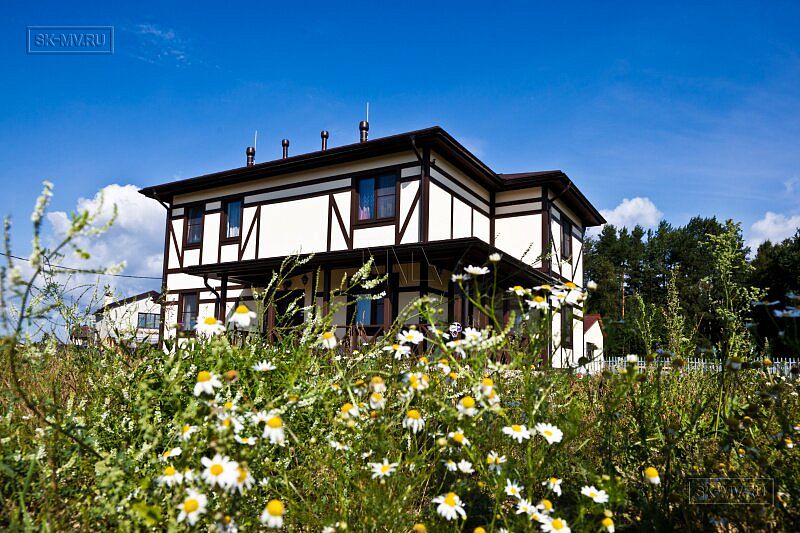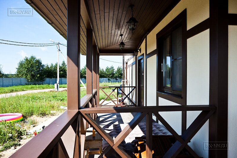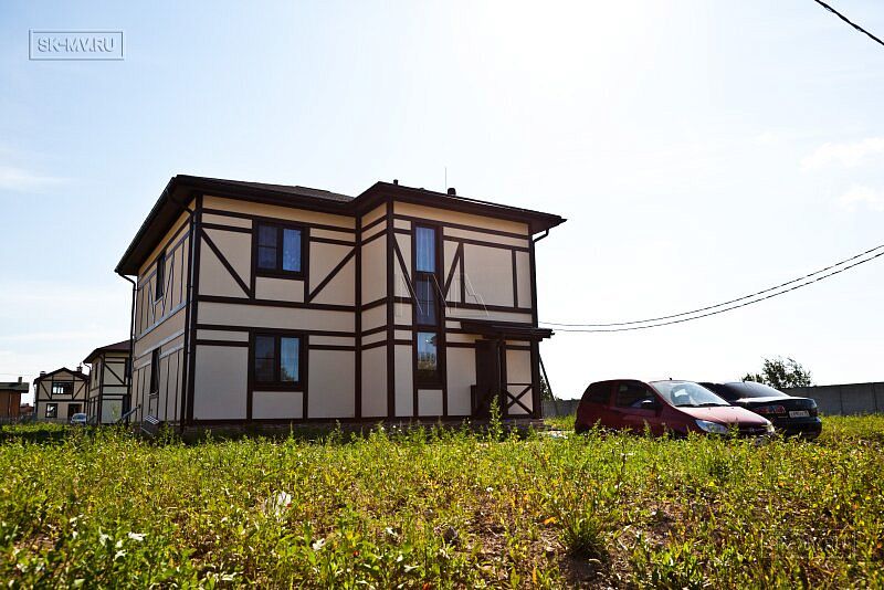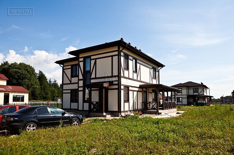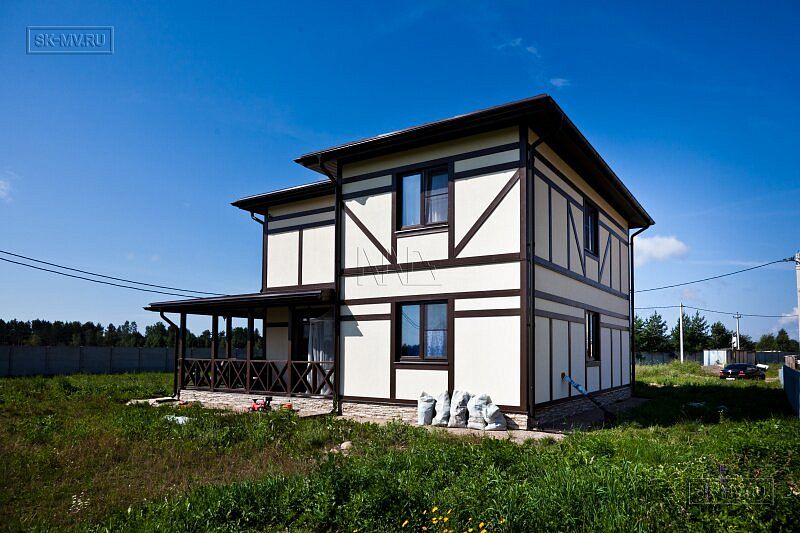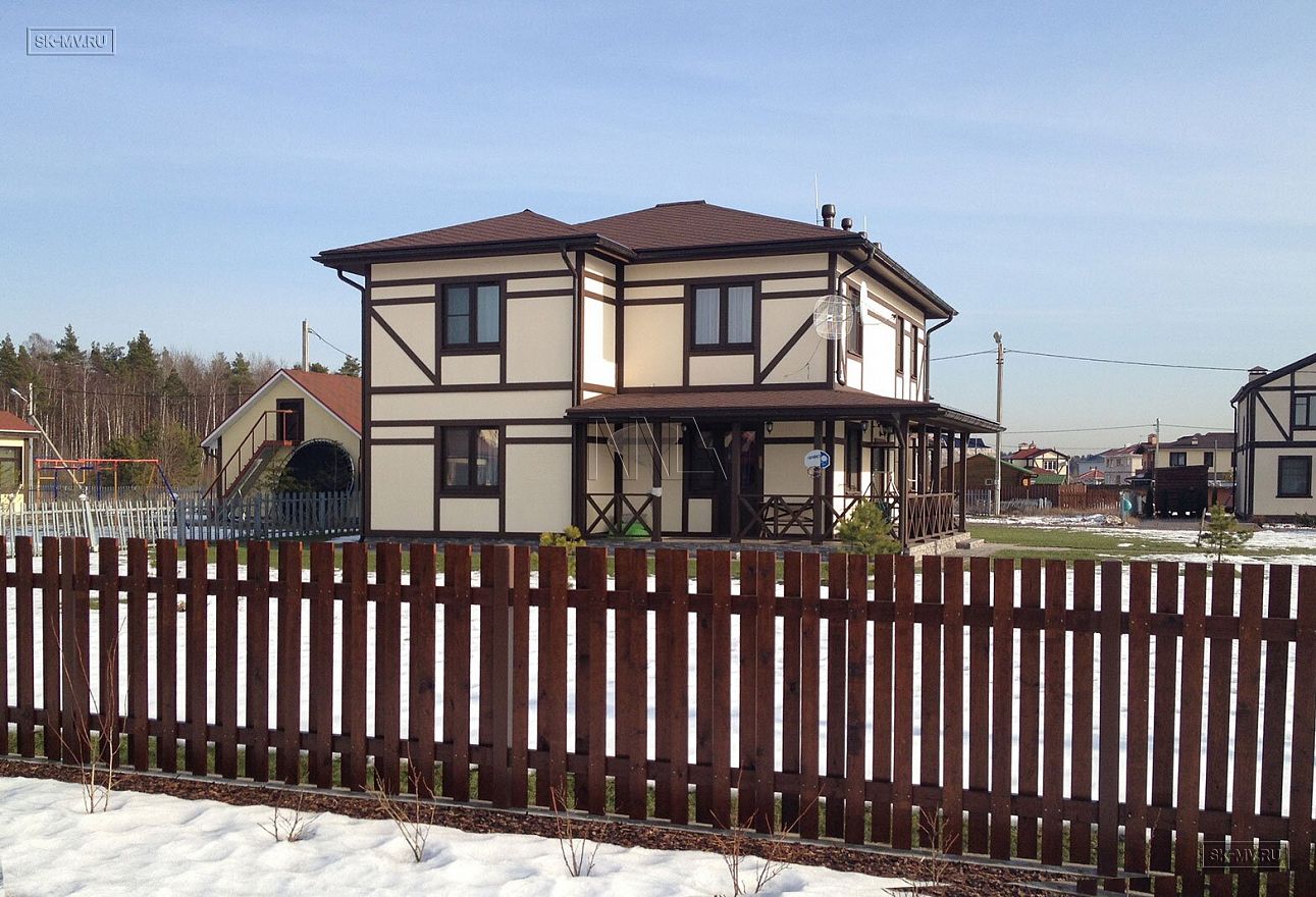 Каркасный дом в стиле фахверк площадью почти 200 кв.м построен в поселке Парквэй в Ленинградской области по одноименному проекту «Парквэй». Имитация балок и стоек декоративными коричневыми планками на белом оштукатуренном фасаде смотрится красиво и презентабельно. Фасадная отделка каркасного дома в стиле фахверк вполне доступна по цене.