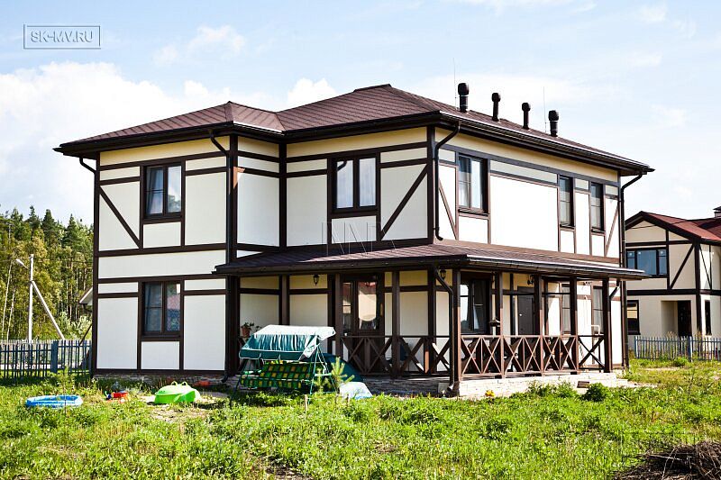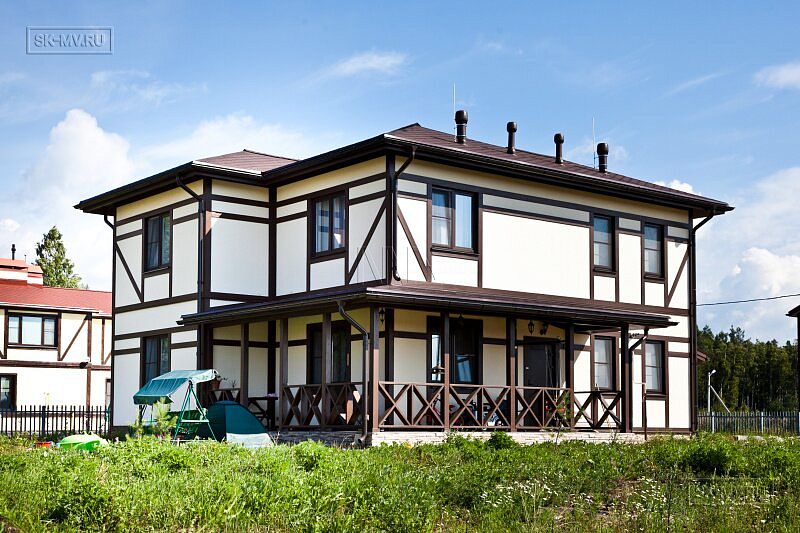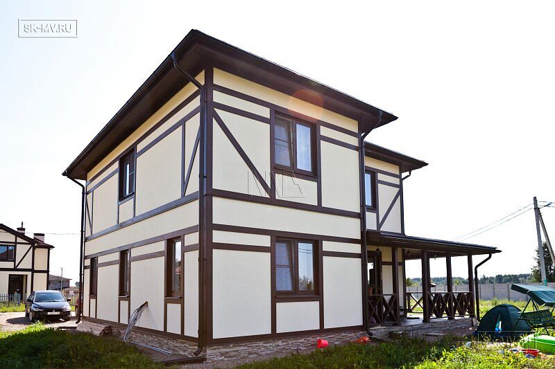 Заказчики этого дома пришли к нам с твердой уверенностью, что им нужен дом «фахверк». И не один дом, а целых два одинаковых фахверковых дома, которые будут находится на соседних участках. Выбор заказчиков пал не на строительство дома по технологии фахверк, а на каркасный дом с имитацией стоек и балок (так называемый «фальш фахверк»), поскольку стоимость строительства каркасного дома полностью соответствовала его бюджету и потребности в скорейшем переезде загород. Но кроме этого дополнительными преимуществами в пользу каркасной технологии было то, что это дом для постоянного проживания, теплый, заводского исполнения и строительство можно начинать осенью и очень быстро въехать в новый дом.