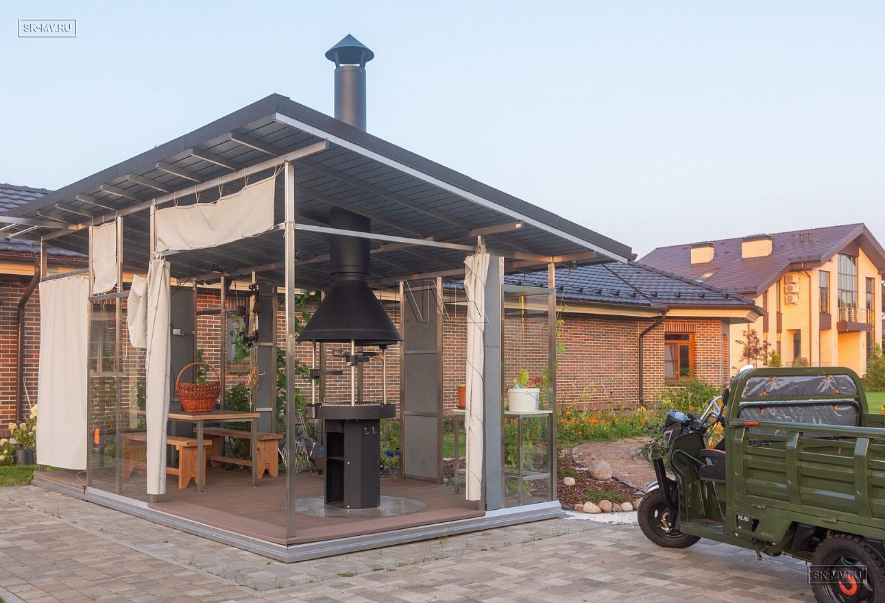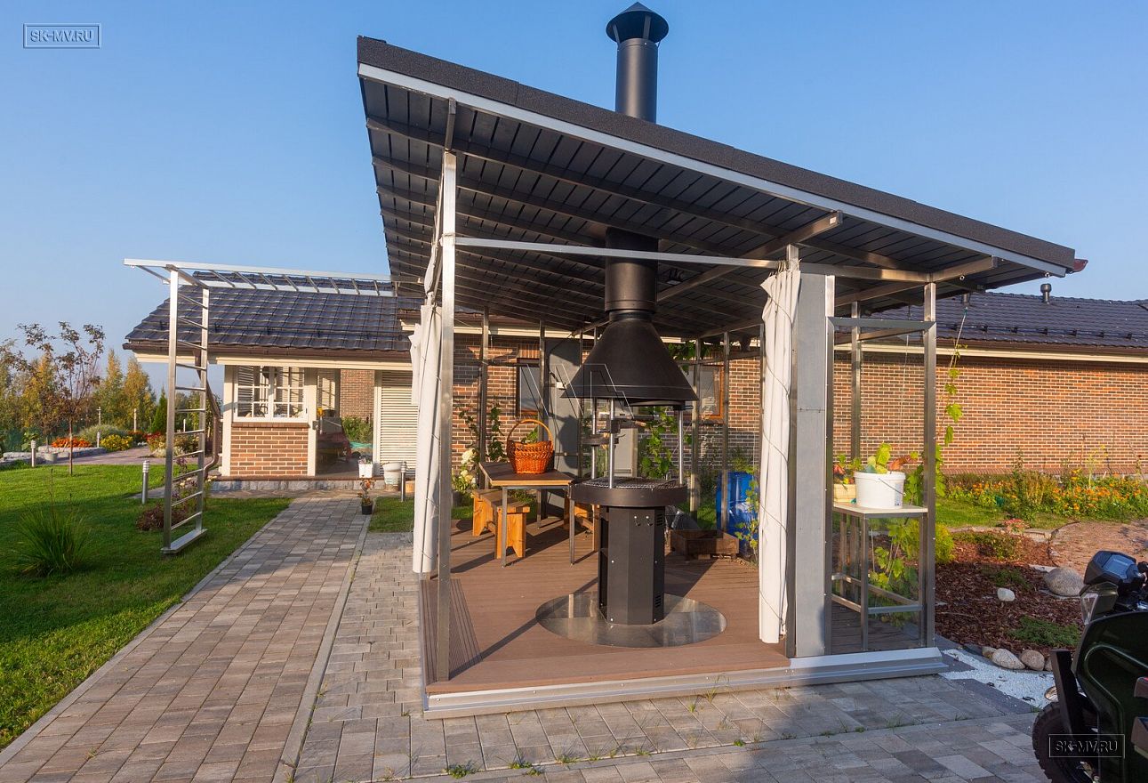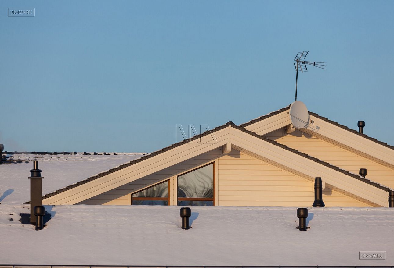 Необычной у этого дома является и сложная многоскатная многоуровневая кровля из натуральной черепицы с большим количеством доборных элементов, вент. проходов, снегозадержателей. Особой техники и умений строителей требует укладка черепицы на конических кровлях.