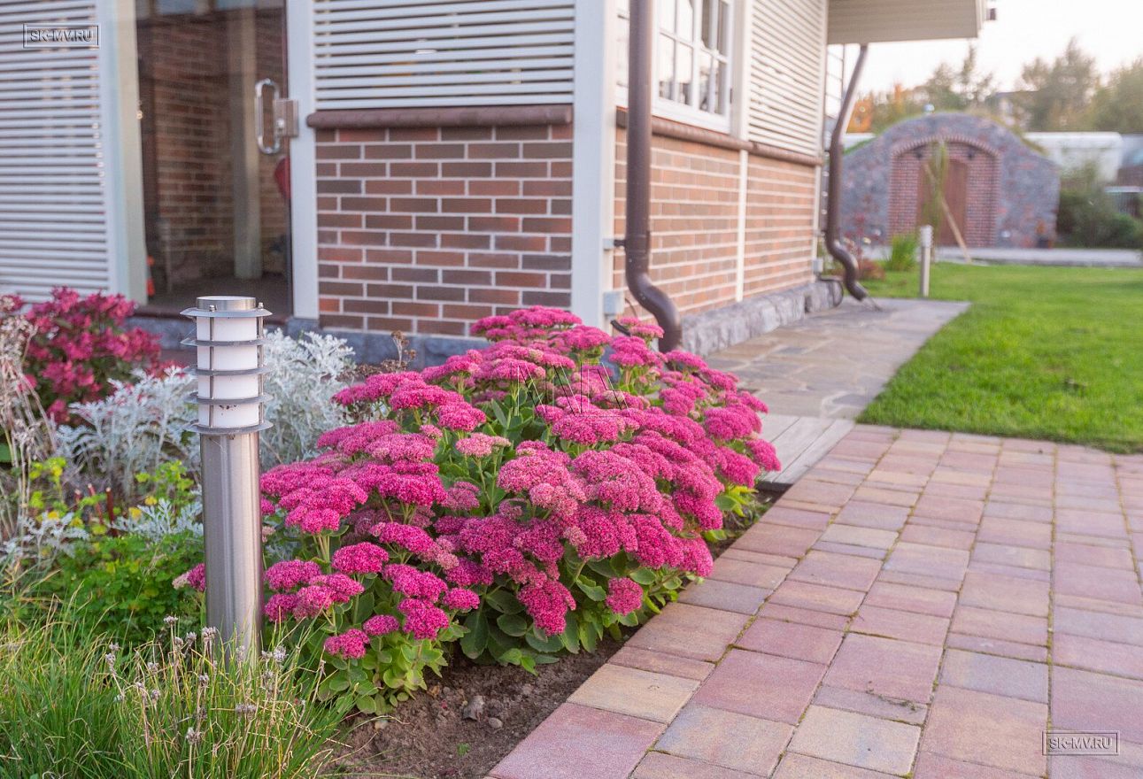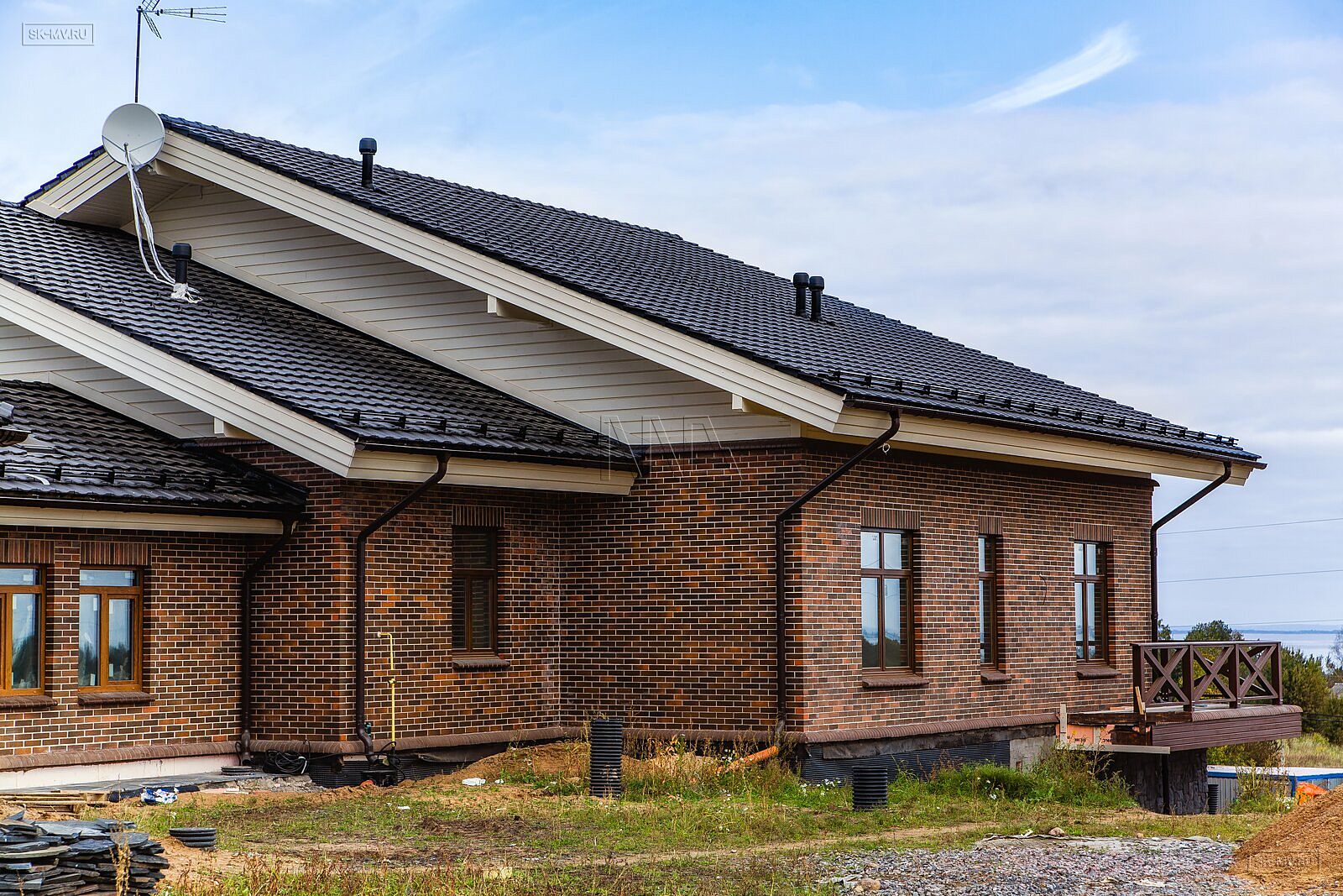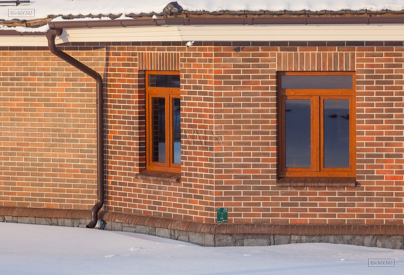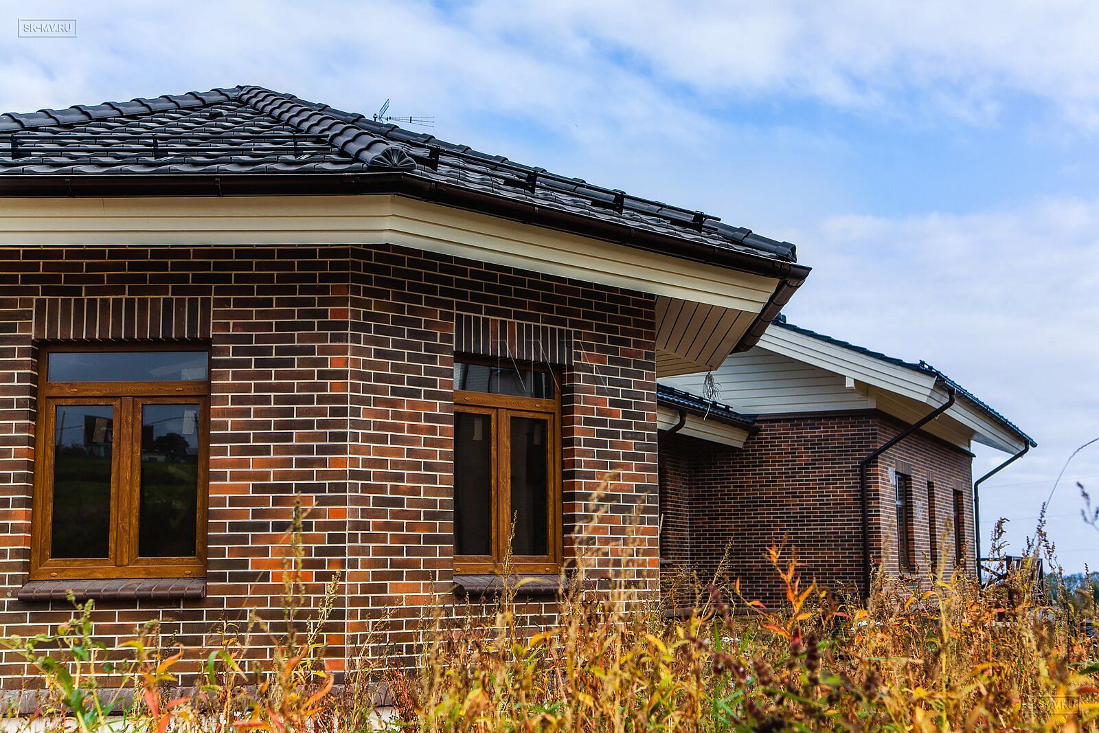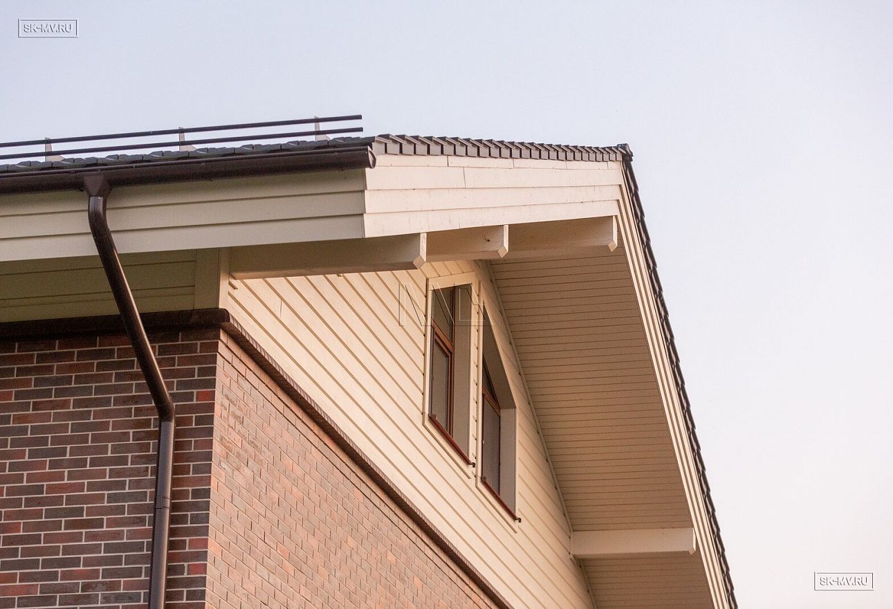 Особенно хочется отметить вкус хозяев, которые безупречно подобрали сочетание кофейного цвета облицовочной доски (в том числе для подшивки карнизных свесов) с пестрым коричневым лицевым кирпичом и кровлей цвета антрацит.