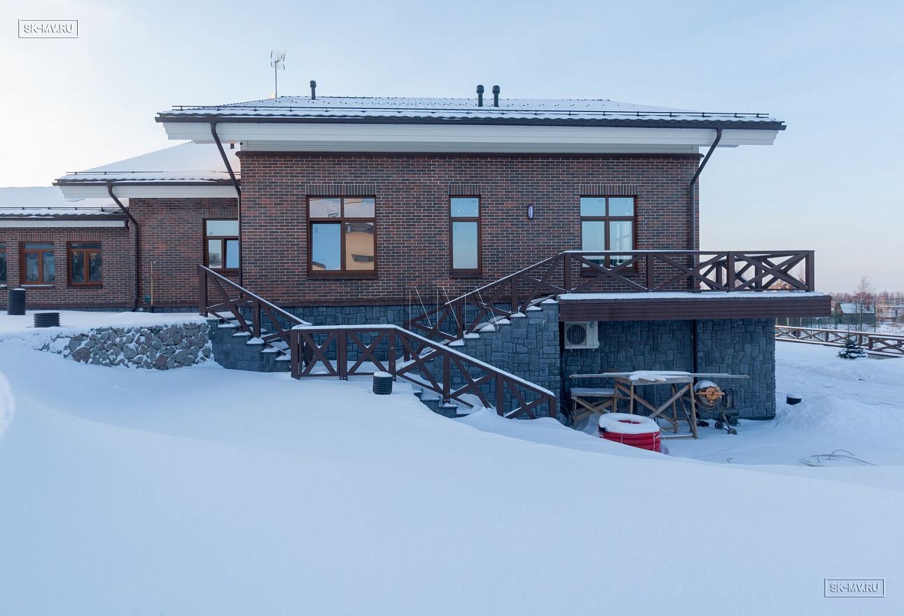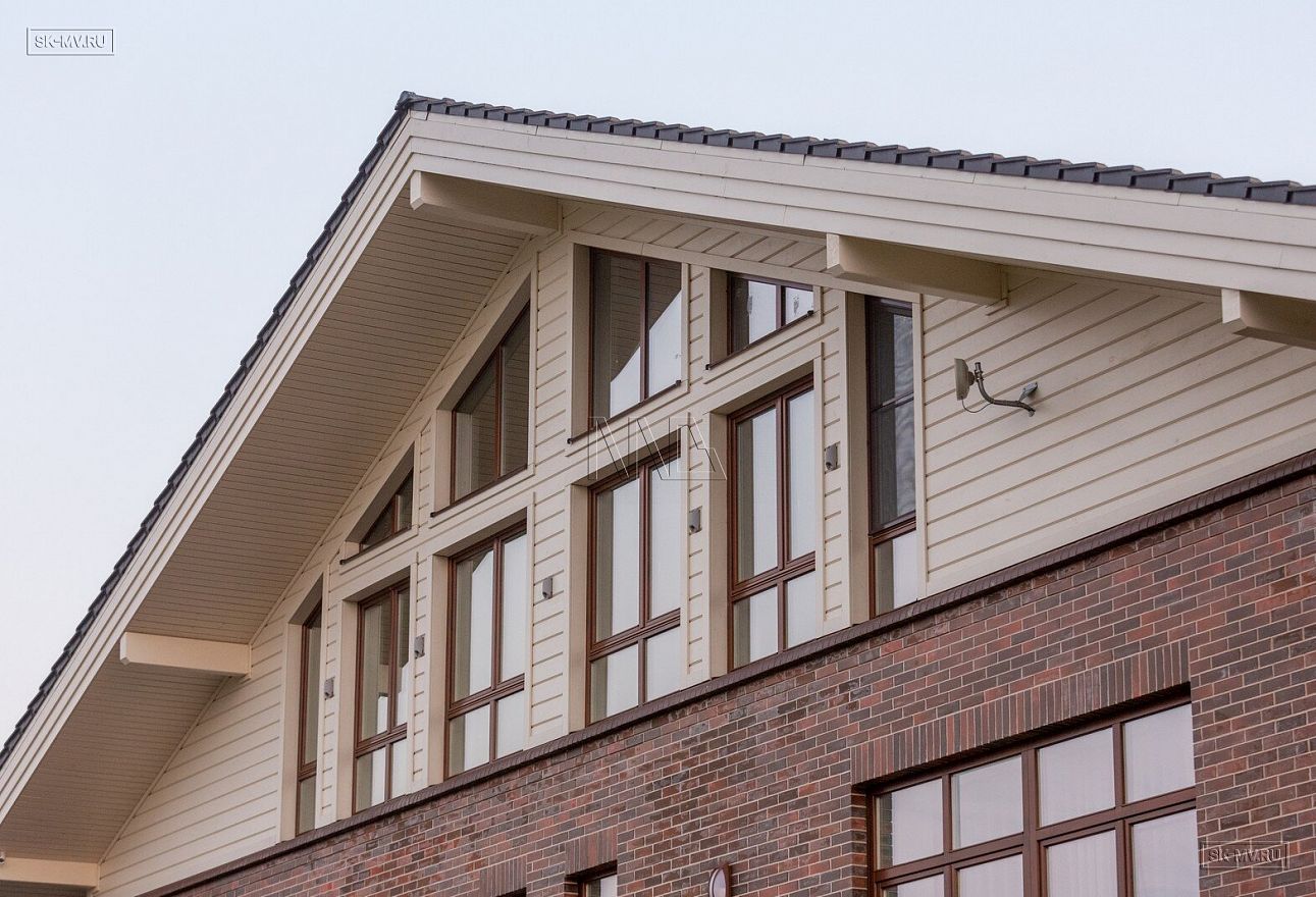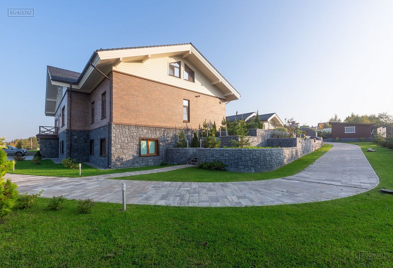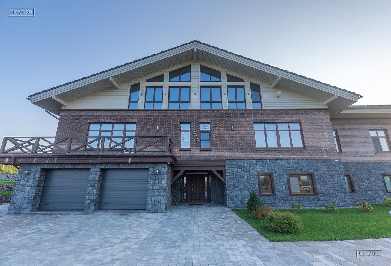 Этот большой уникальный дом с цокольным этажом выполнен из кирпича и деревянного каркаса с железобетонным монолитным межэтажным перекрытием и цоколем. Стены первых двух этажей — кирпичные, а мансардный этаж — каркасный.