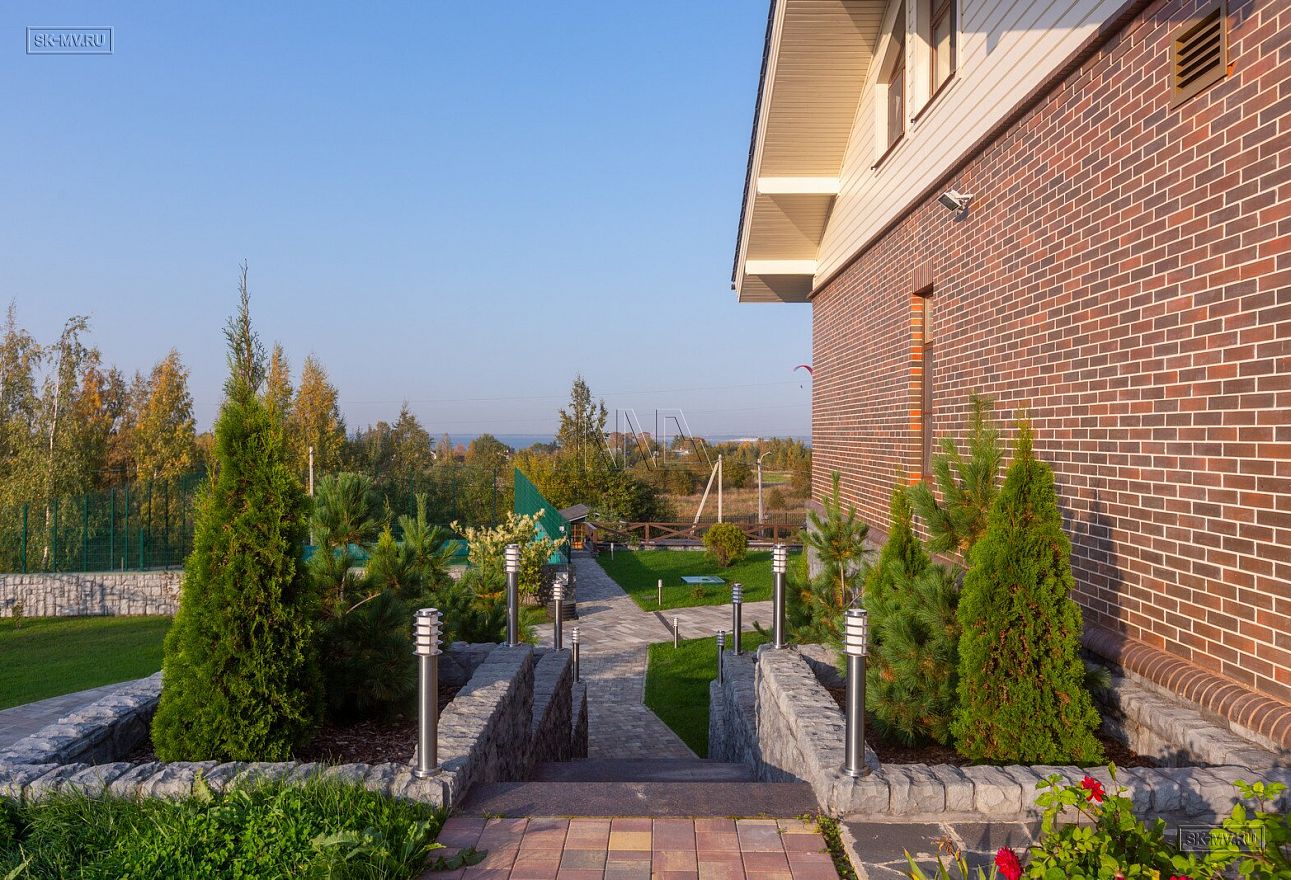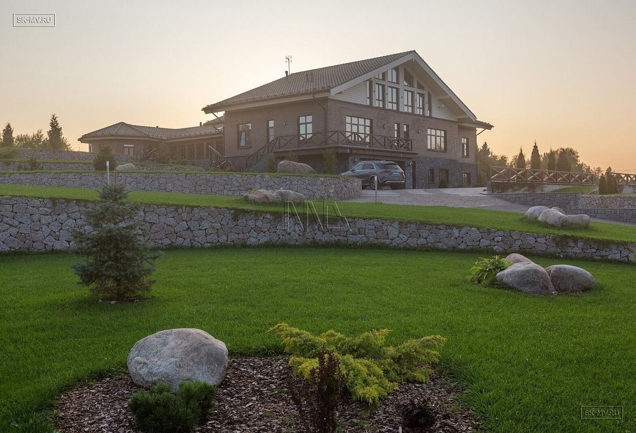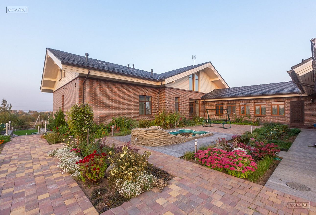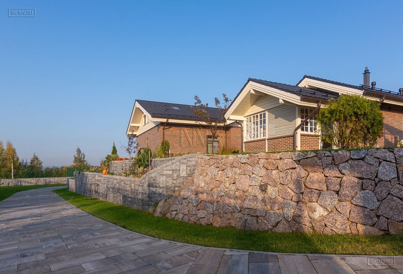 Этот большой уникальный дом с цокольным этажом выполнен из кирпича и деревянного каркаса с железобетонным монолитным межэтажным перекрытием и цоколем. Стены первых двух этажей — кирпичные, а мансардный этаж — каркасный.
