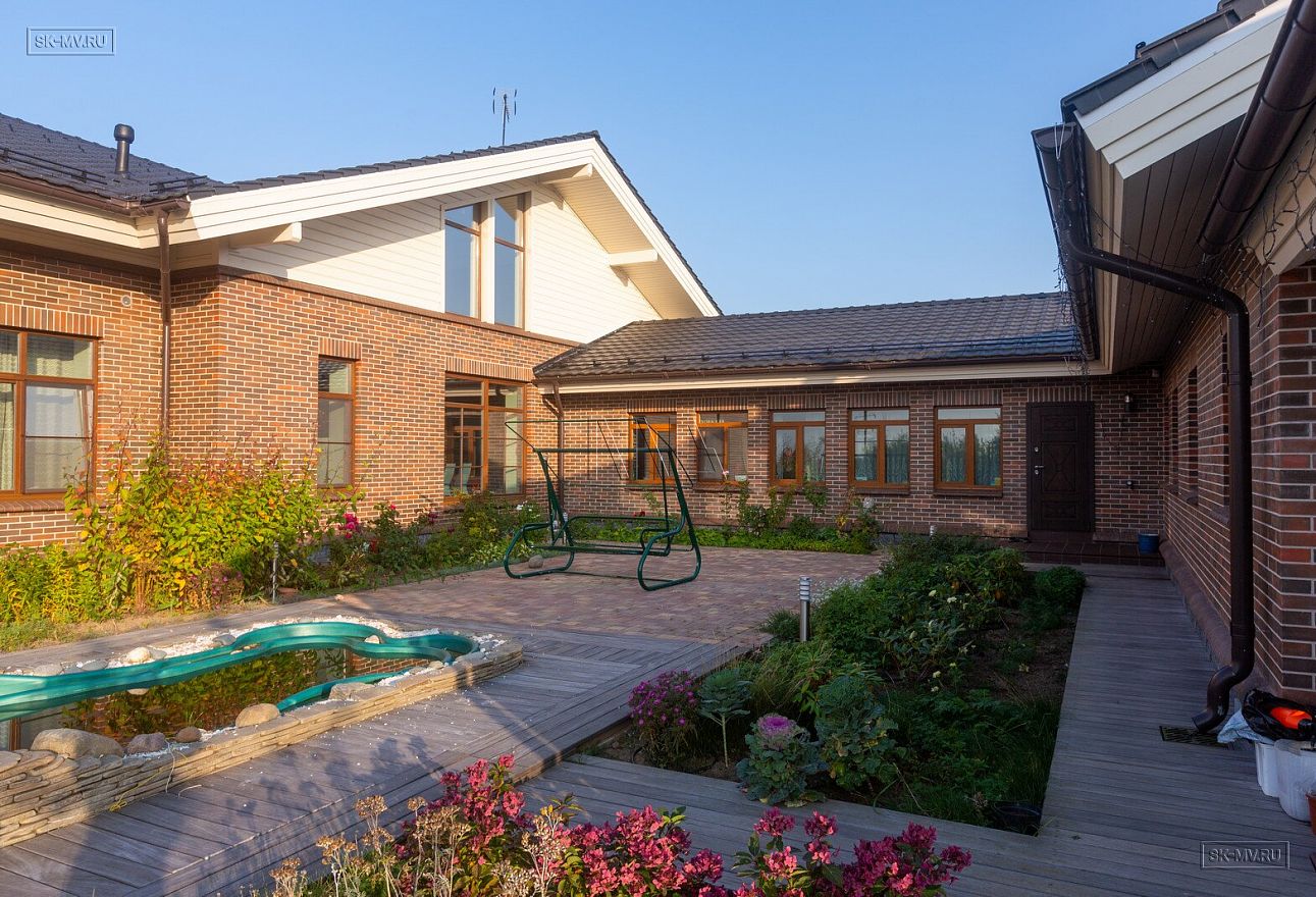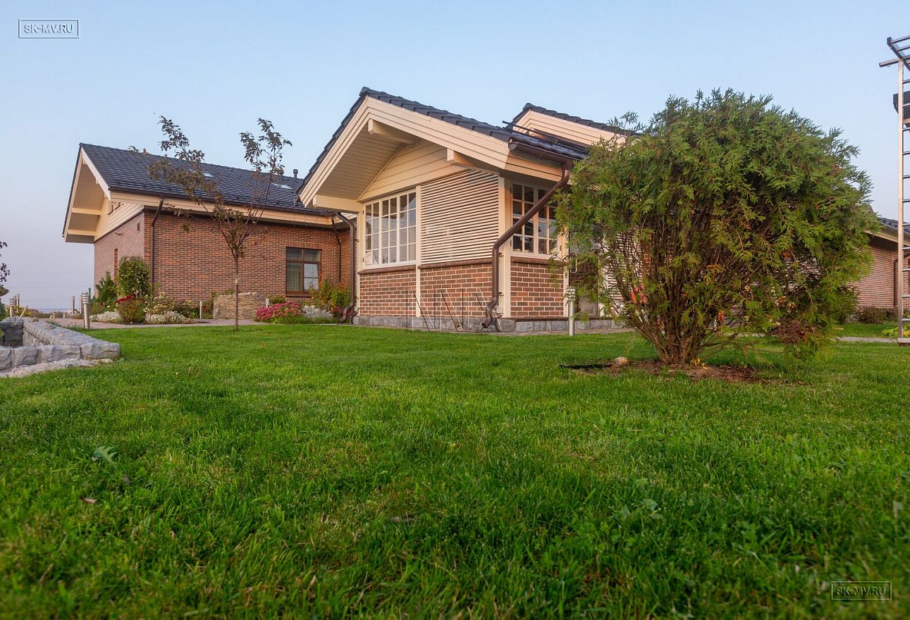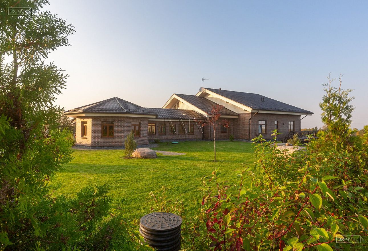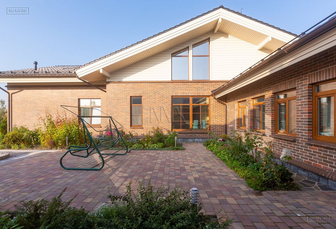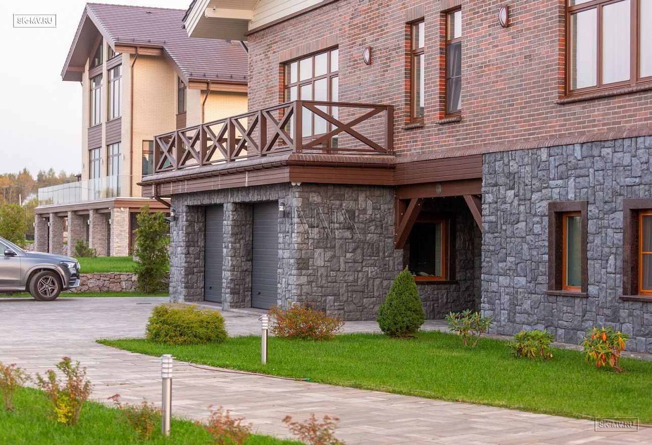 Этот большой уникальный дом с цокольным этажом выполнен из кирпича и деревянного каркаса с железобетонным монолитным межэтажным перекрытием и цоколем. Стены первых двух этажей — кирпичные, а мансардный этаж — каркасный.