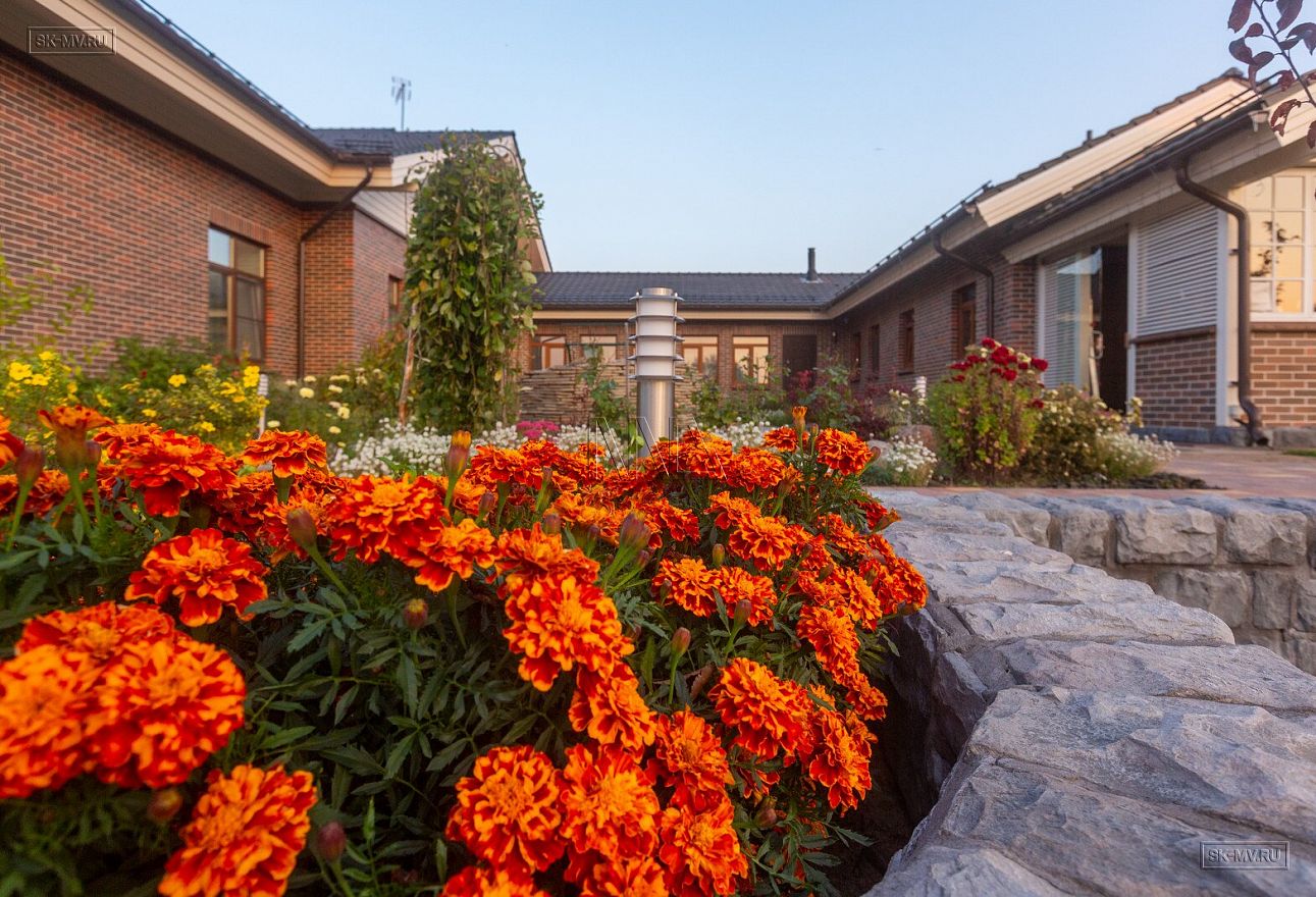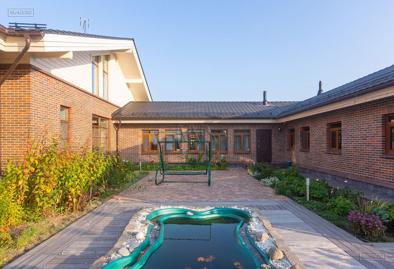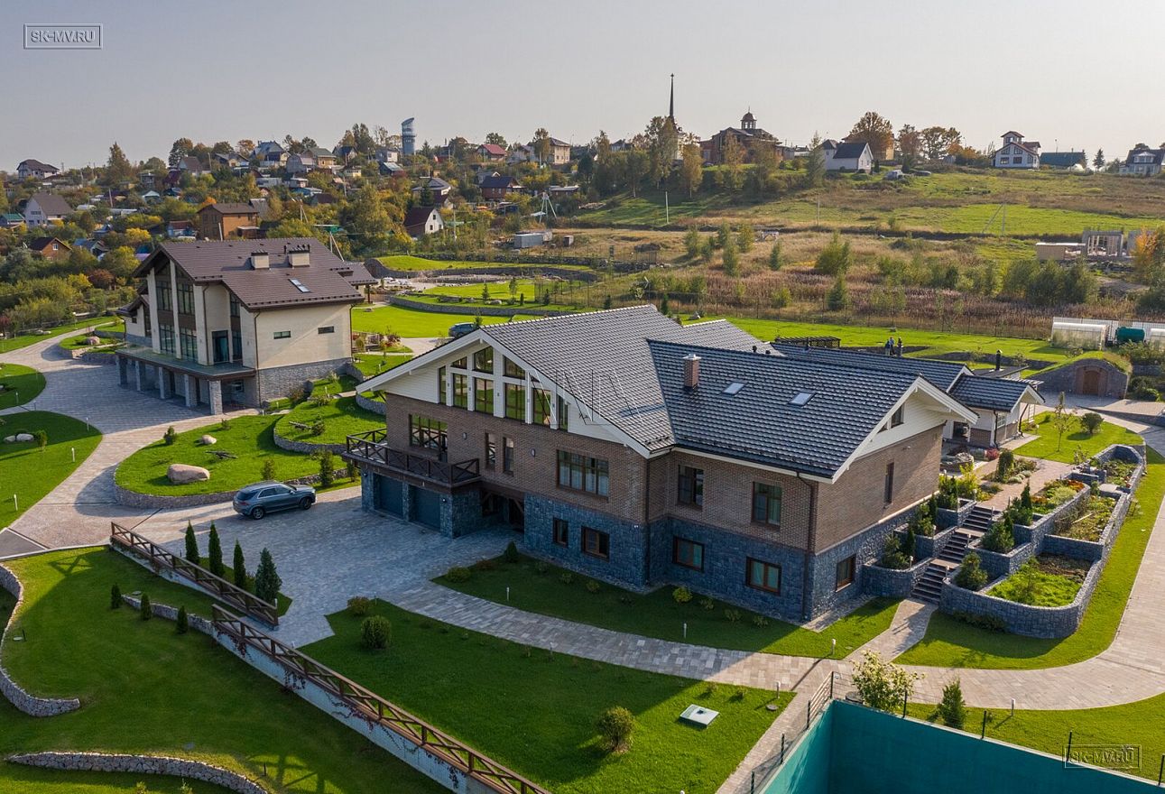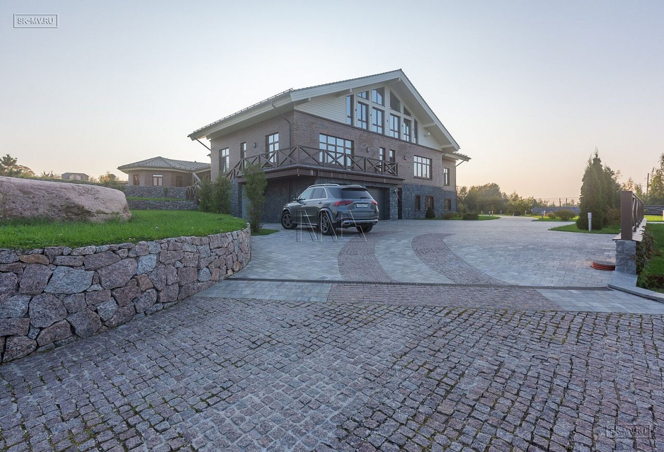 Этот большой уникальный дом с цокольным этажом выполнен из кирпича и деревянного каркаса с железобетонным монолитным межэтажным перекрытием и цоколем. Стены первых двух этажей — кирпичные, а мансардный этаж — каркасный.