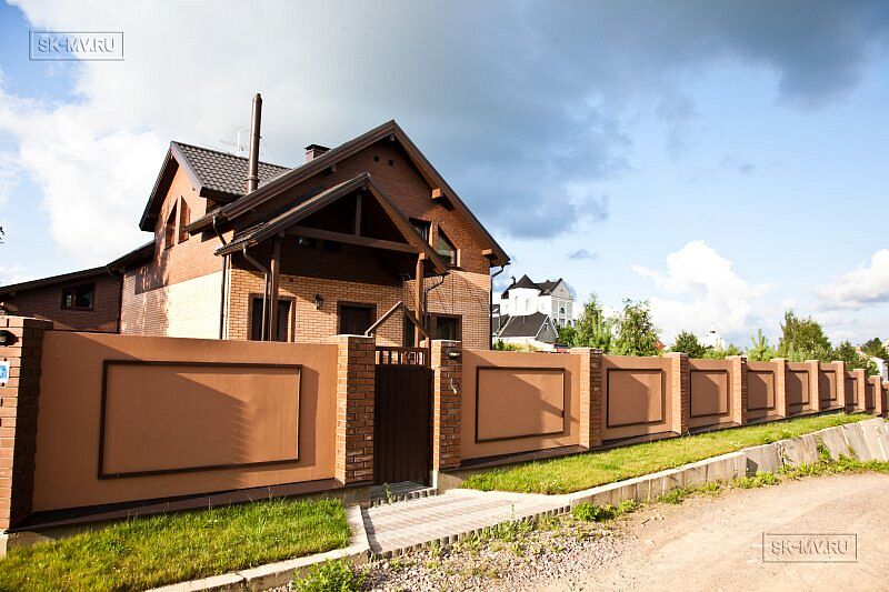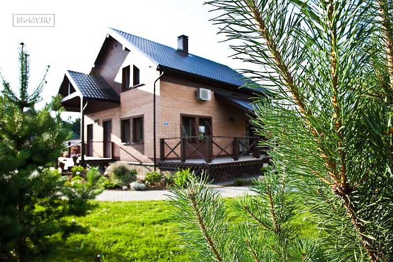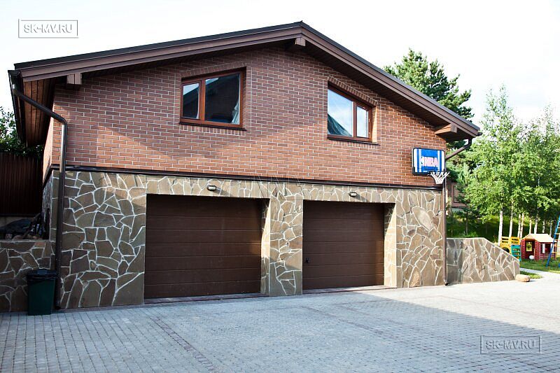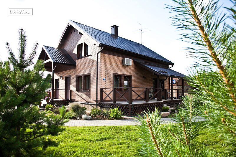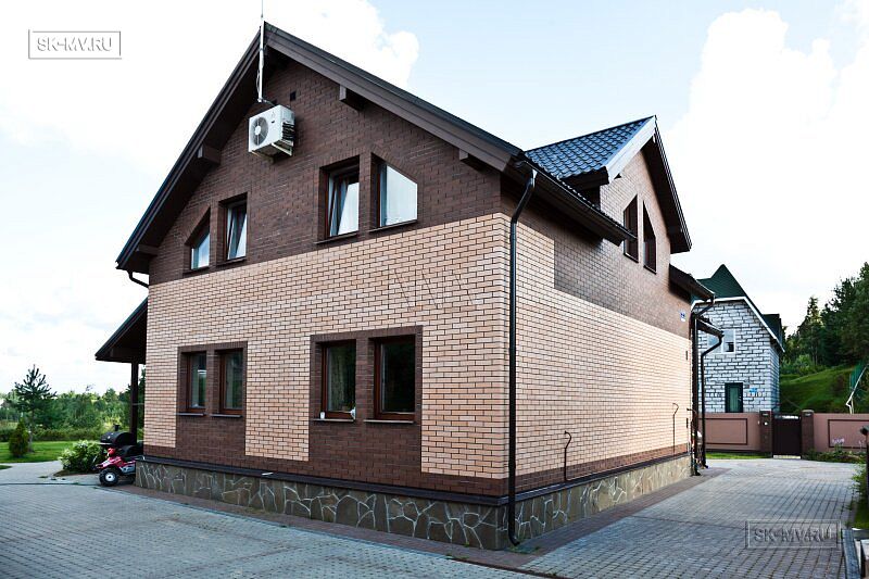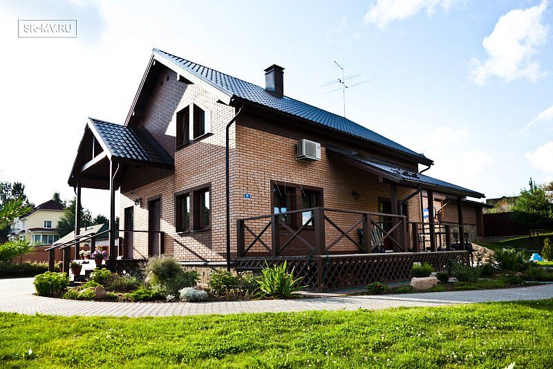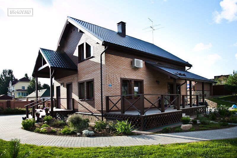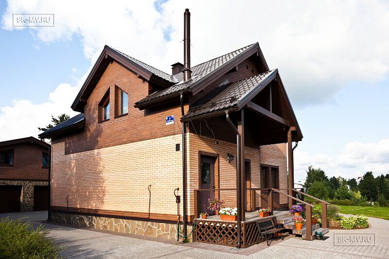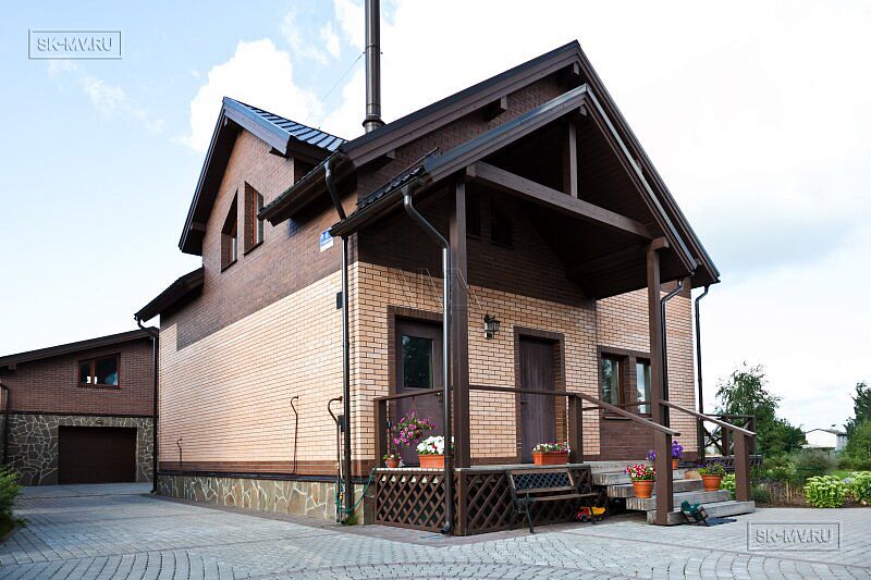 Обычная двускатная кровля, мансардный этаж, крыльцо под кровлей, небольшая полуоткрытая терраса. Но при всей своей простоте, архитектурный облик этого домика весьма незауряден и привлекателен. Комбинация двух цветов кирпича — розового и коричневого — с разноцветной расшивкой. Коричневая кровля, балки, окна поддерживают коричневые кирпичные вставки на фасаде.