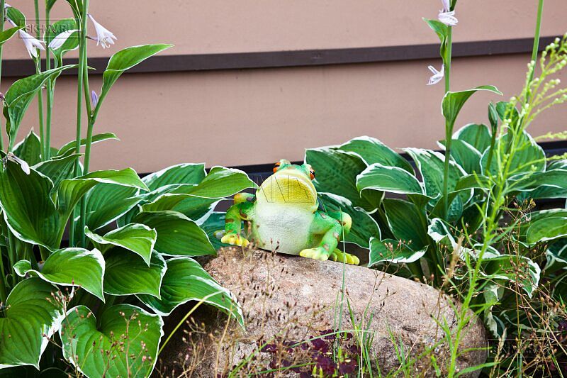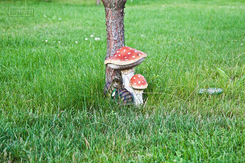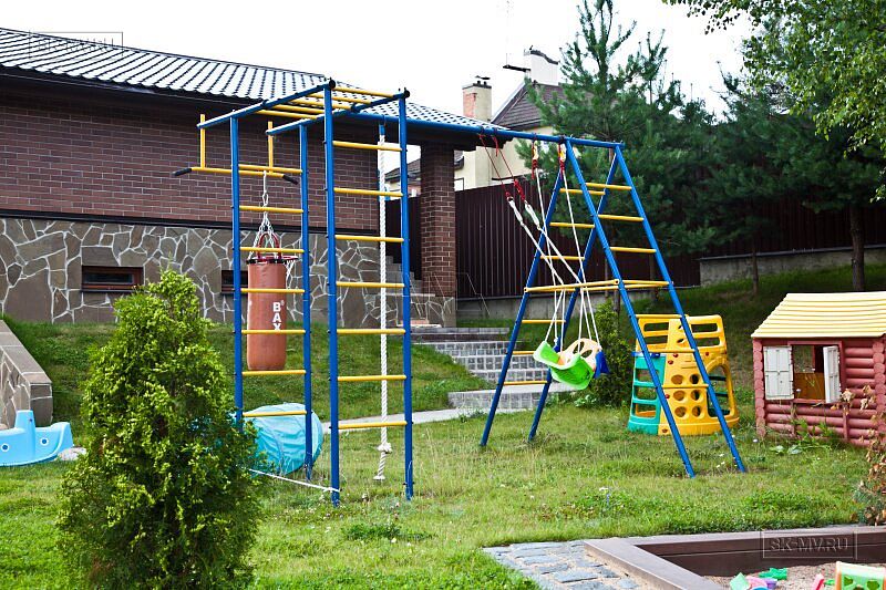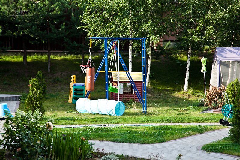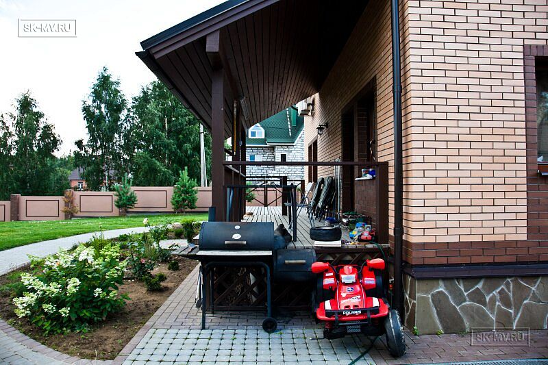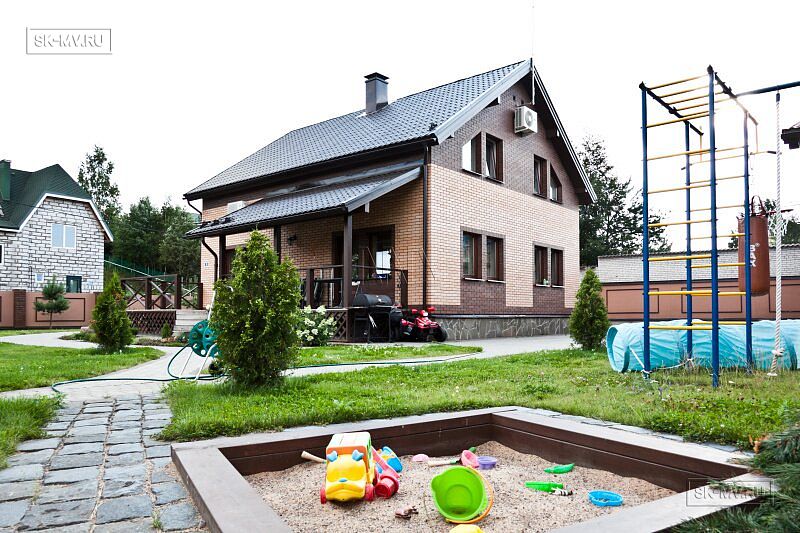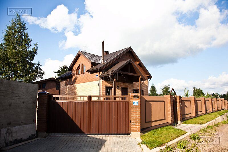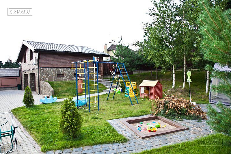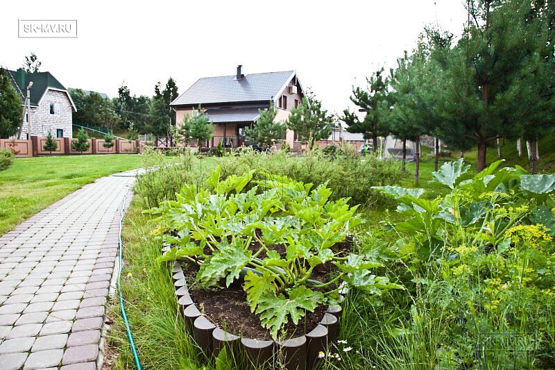 На участке проведены работы по благоустройству и озеленению: выполнено мощение дорожек, высадка однолетних и многолетних растений, организованы клумбы. Помимо основного дома на участке построен двухэтажных гараж на два автомобиля. На втором этаже организована баня. Участок окружен забором с бетонными секциями.