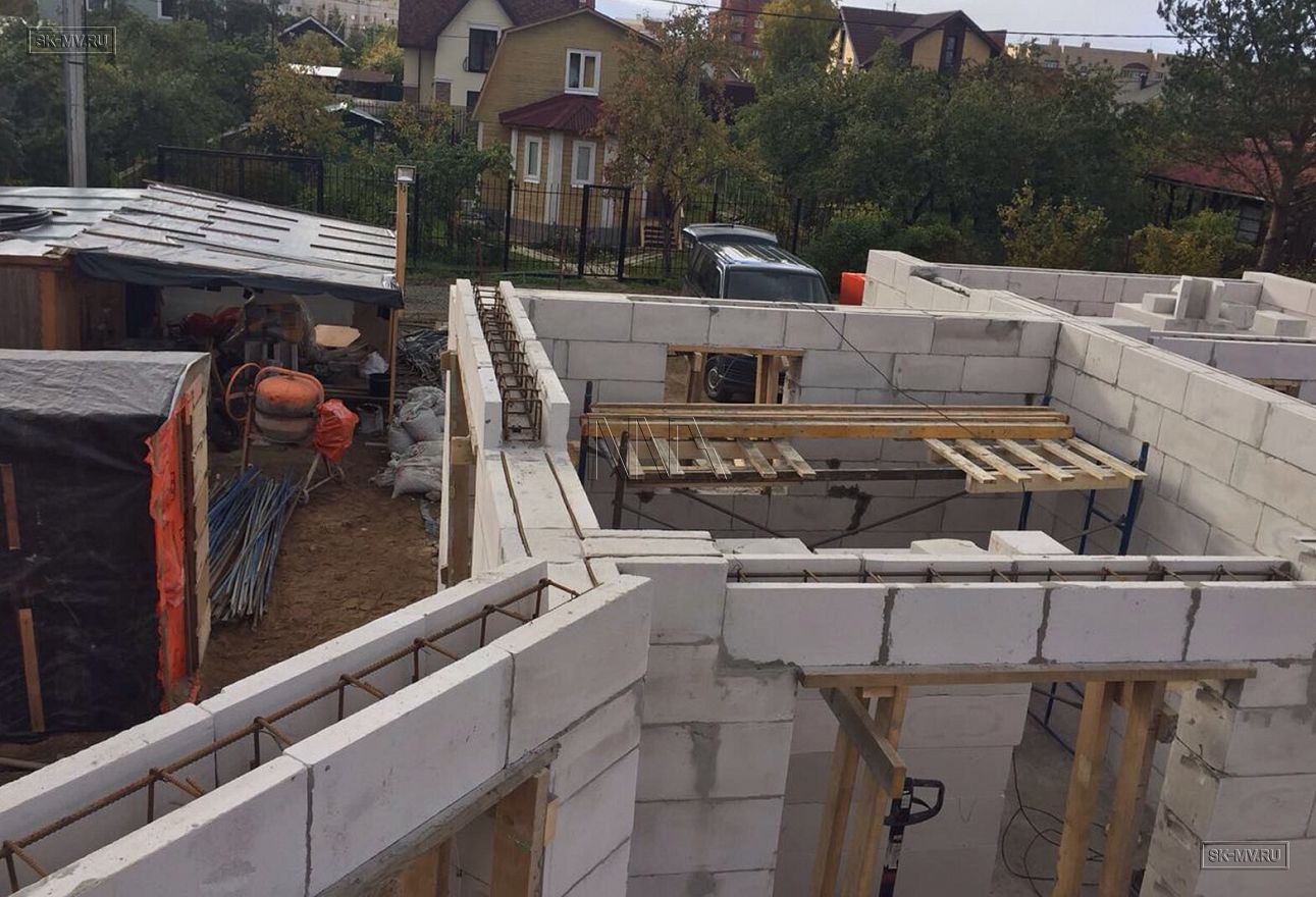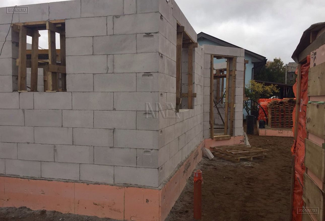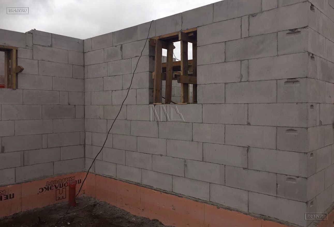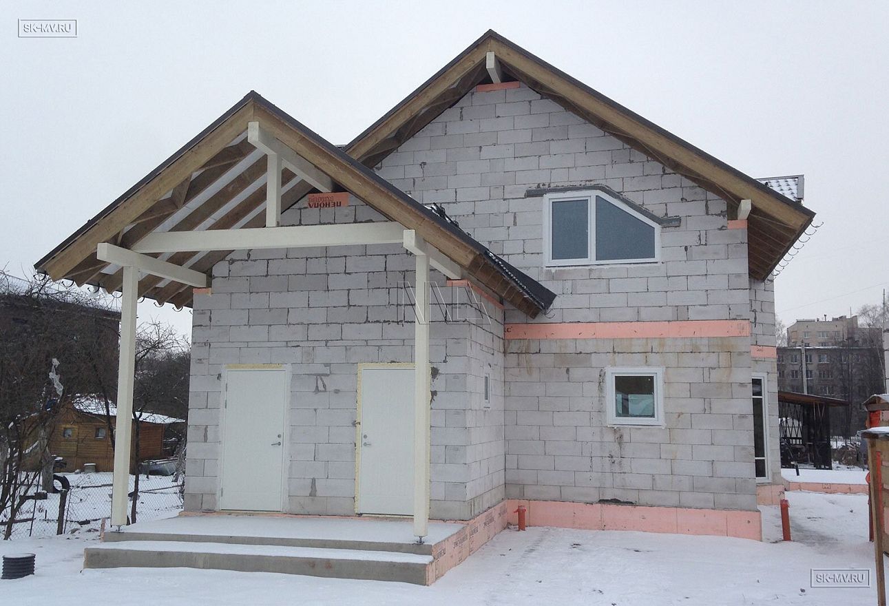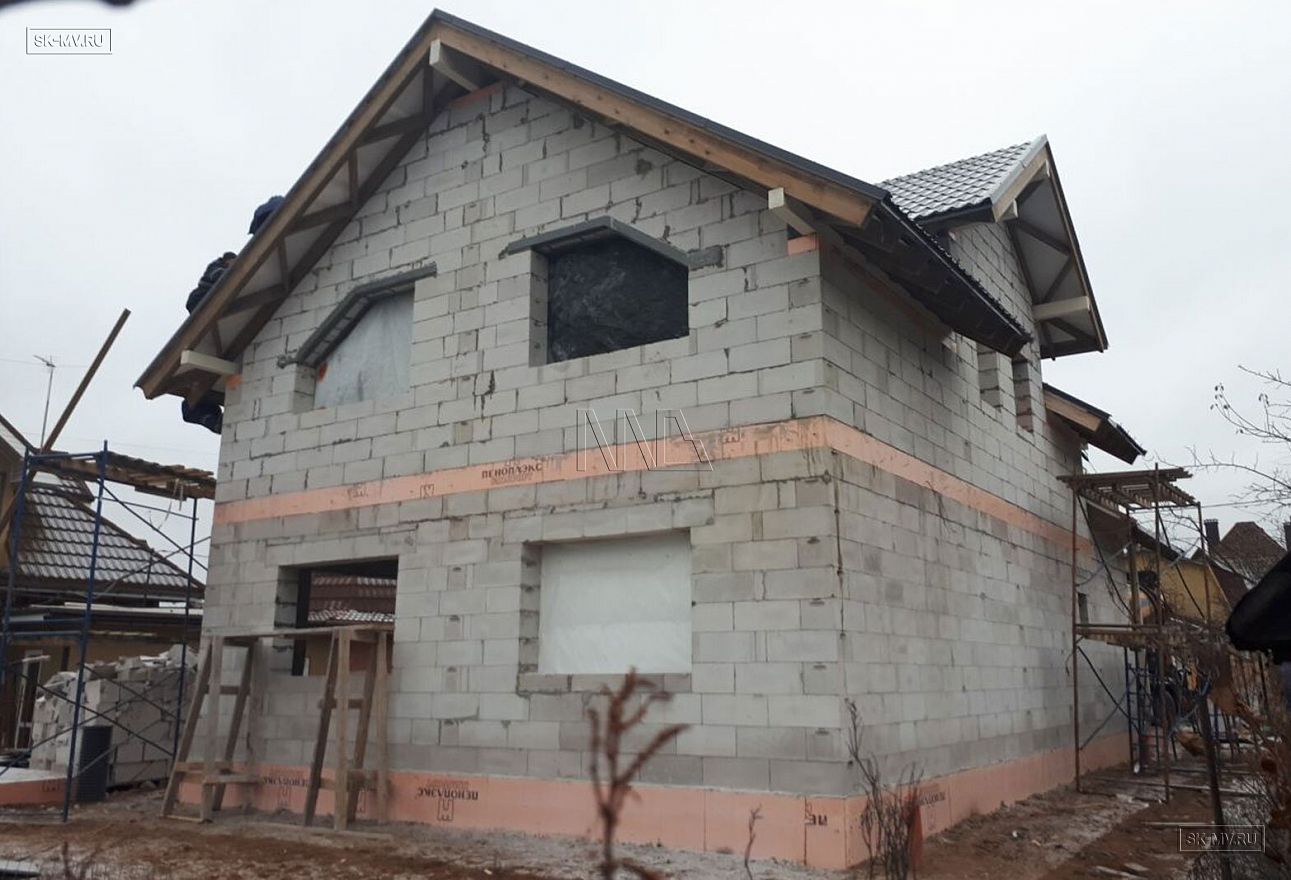 Дом площадью почти 200 кв.м строится в Санкт-Петербурге в г. Пушкин из газобетонных блоков 300 мм, D500 для наружных ограждающих конструкций и блоков 250 мм, D500 для внутренних стен. Межэтажное перекрытие — монолитная ж/б плита. Фундамент — утепленная экструдированным пенополистиролом ж/б плита с прифундаментным дренажом и защитой грунта вокруг фундамента от промерзания.