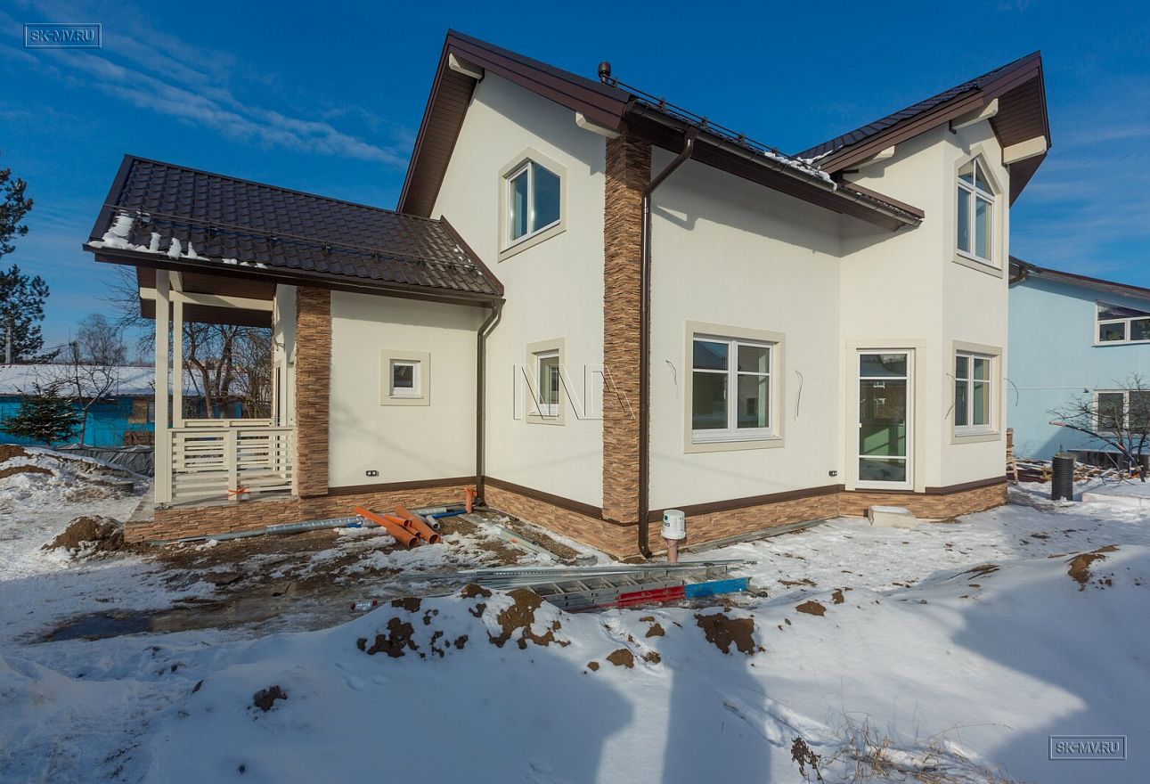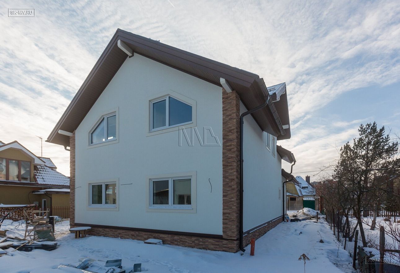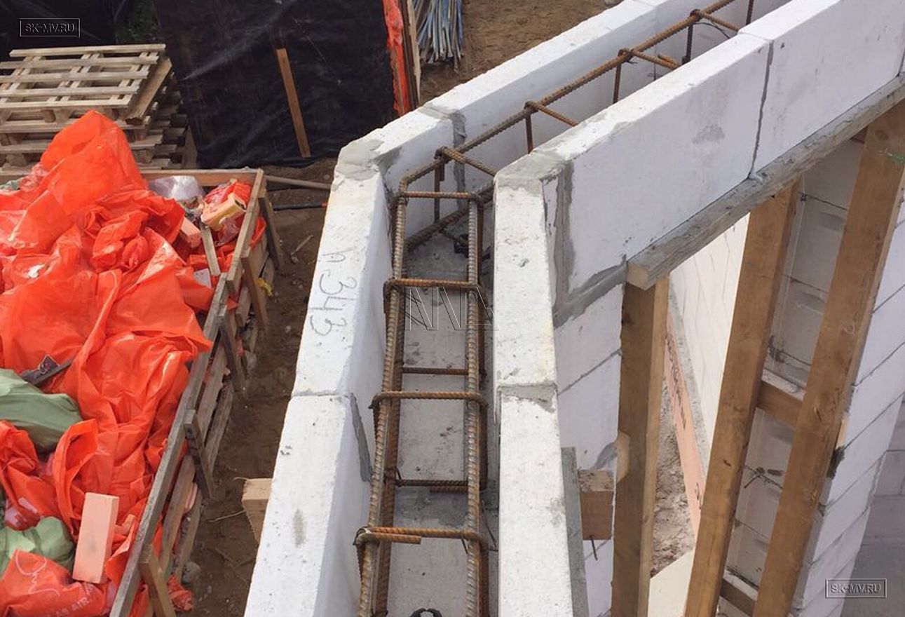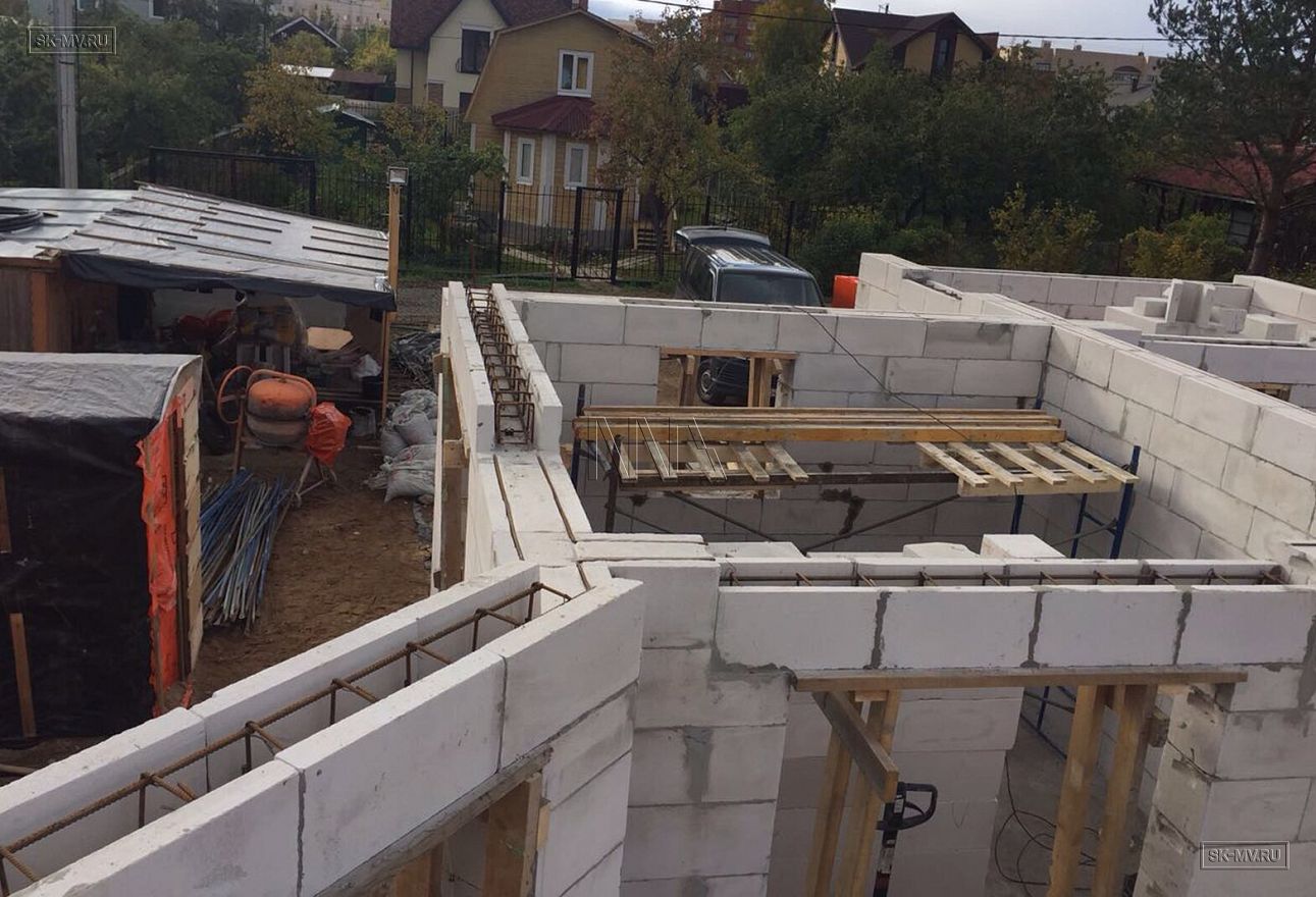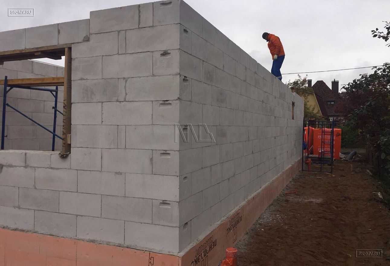 Дом площадью почти 200 кв.м строится в Санкт-Петербурге в г. Пушкин из газобетонных блоков 300 мм, D500 для наружных ограждающих конструкций и блоков 250 мм, D500 для внутренних стен. Межэтажное перекрытие — монолитная ж/б плита. Фундамент — утепленная экструдированным пенополистиролом ж/б плита с прифундаментным дренажом и защитой грунта вокруг фундамента от промерзания.