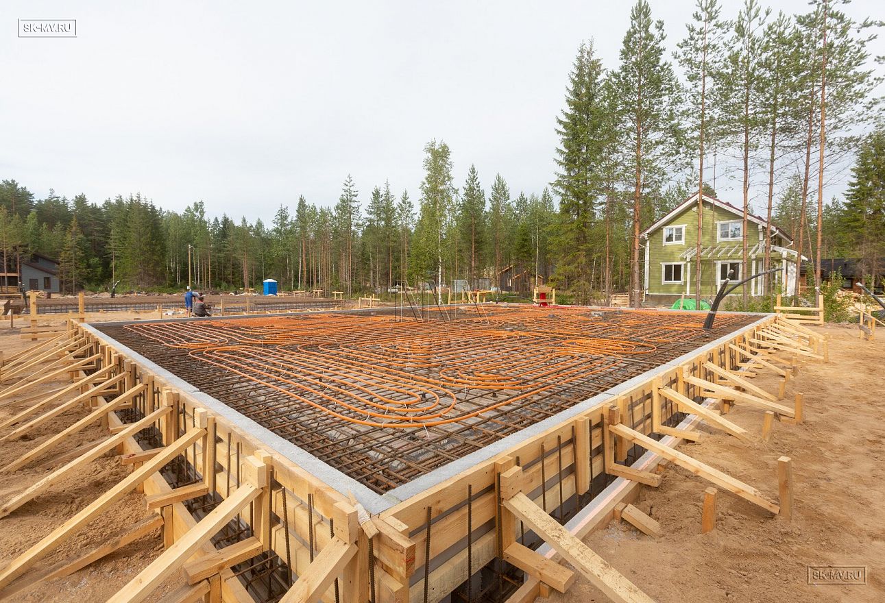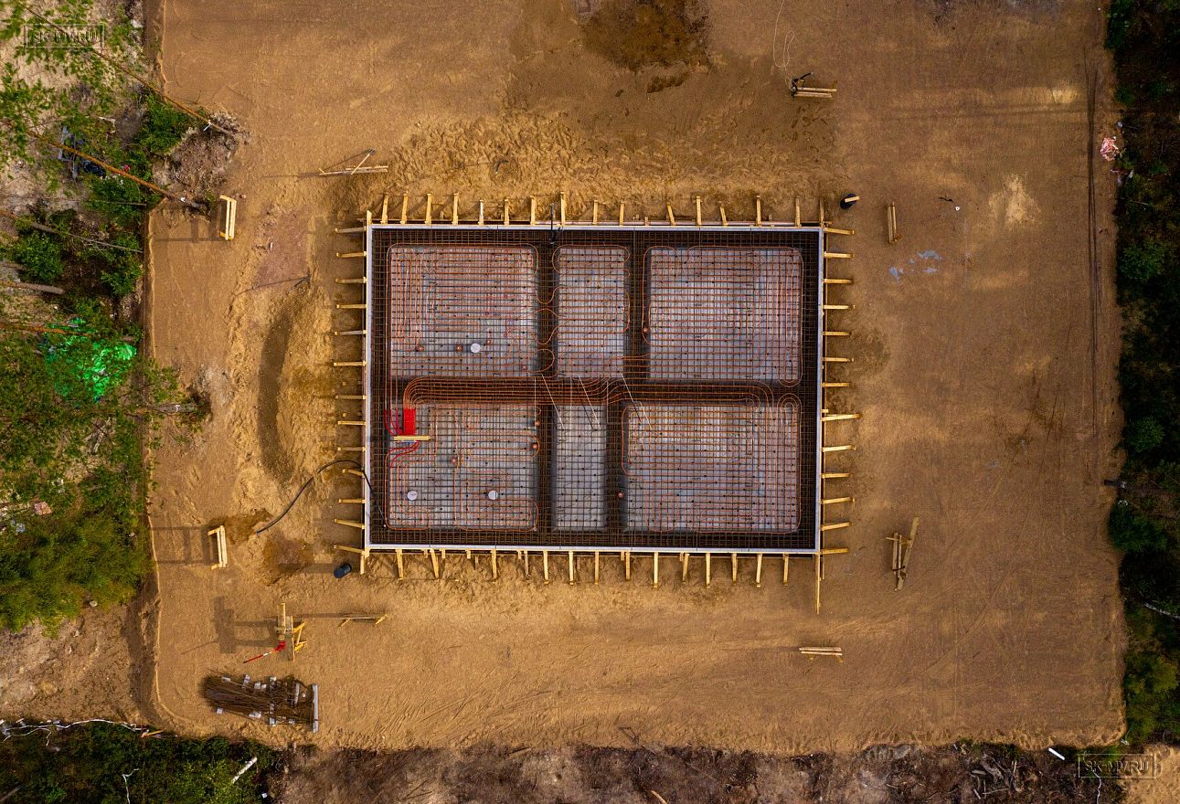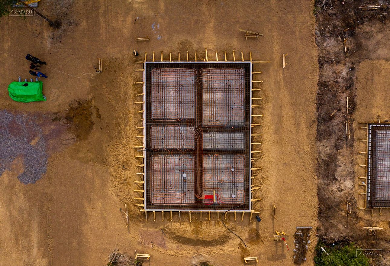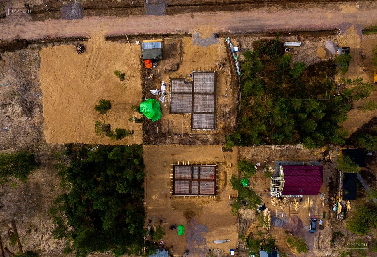 Летом 2020 завершен монтаж фундамента УШП PRO в коттеджном поселке Рощино в Ленинградской области под строительство двухэтажного кирпичного дома с монолитными межэтажными перекрытиями и вальмовой четырехскатной кровлей.