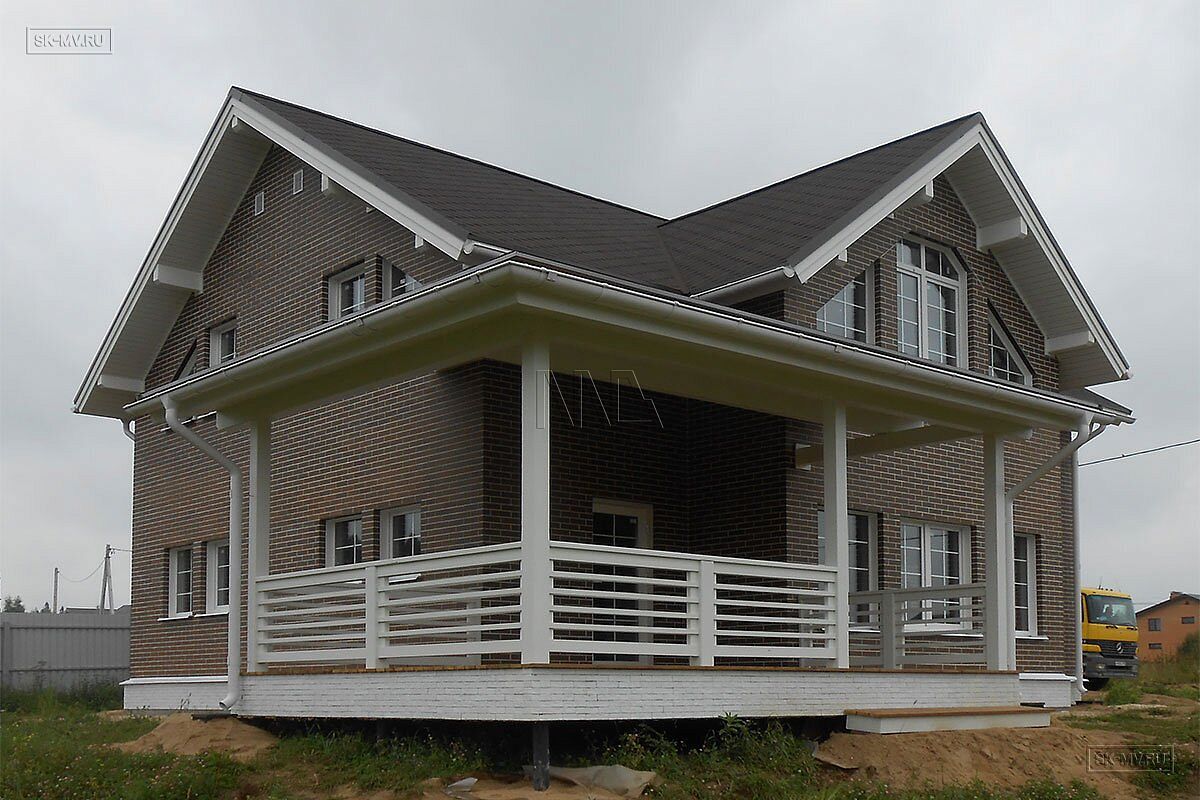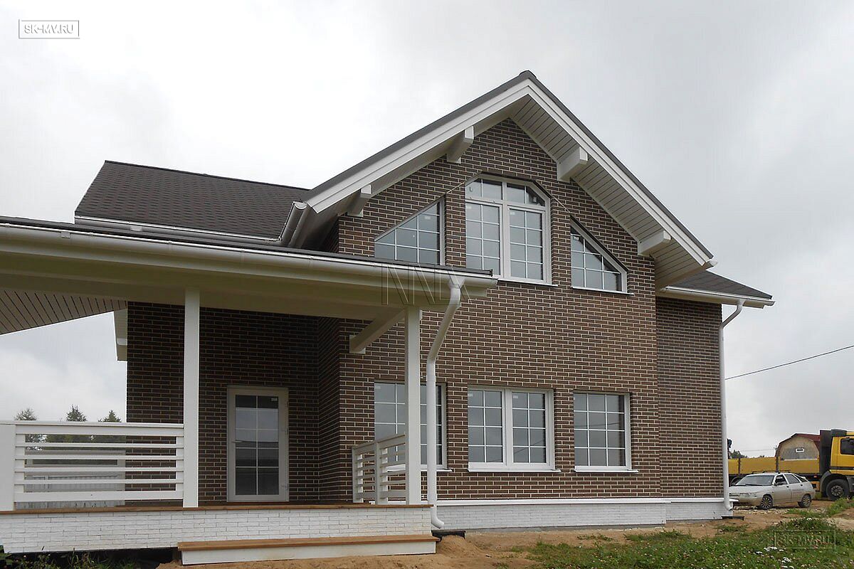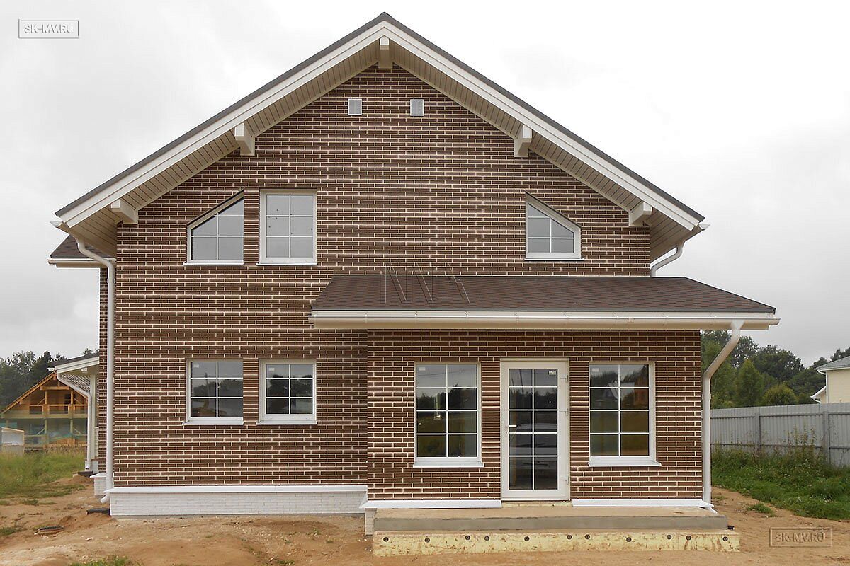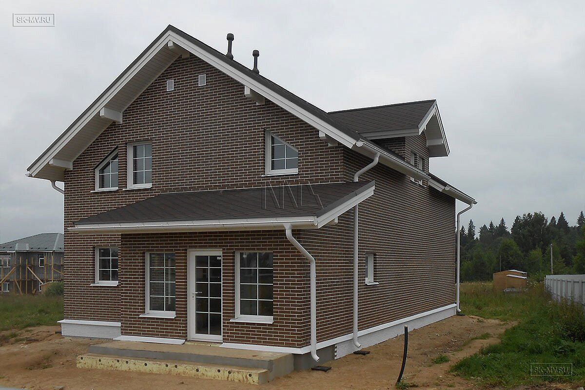 Каркасный двухэтажный дом площадью ок. 200 кв.м с фасадом из коричневого кирпича построен на основании проекта МВ 5 в деревне Себенки Волокаламского района Московской области. Дом строился и проектировался «под ключ», включая инженерные коммуникации и интерьер.