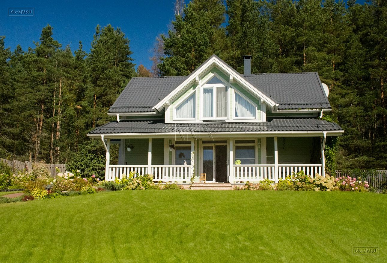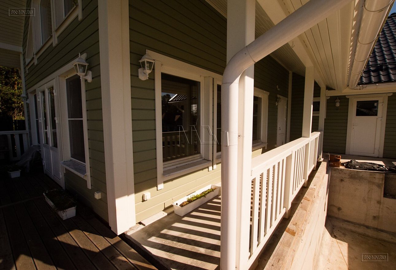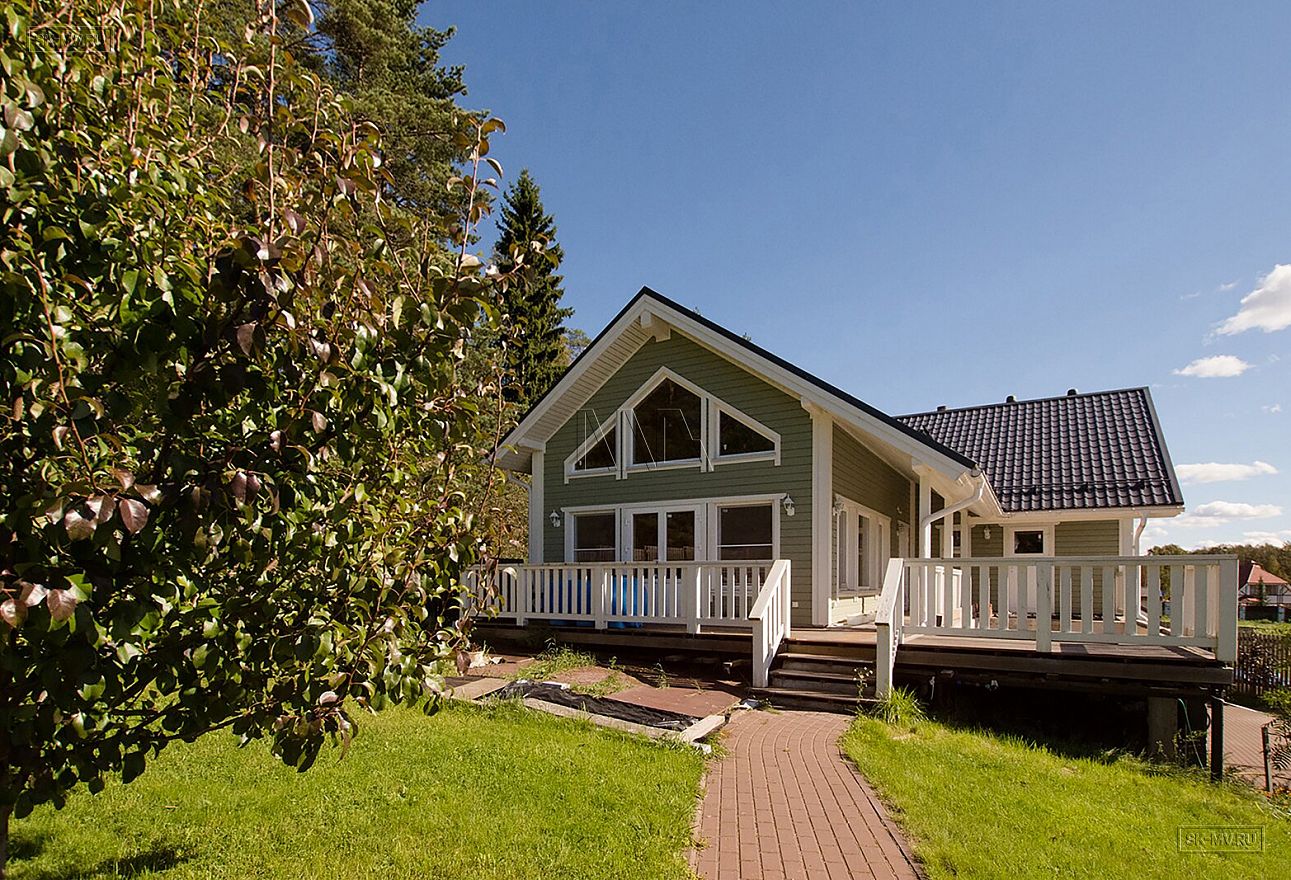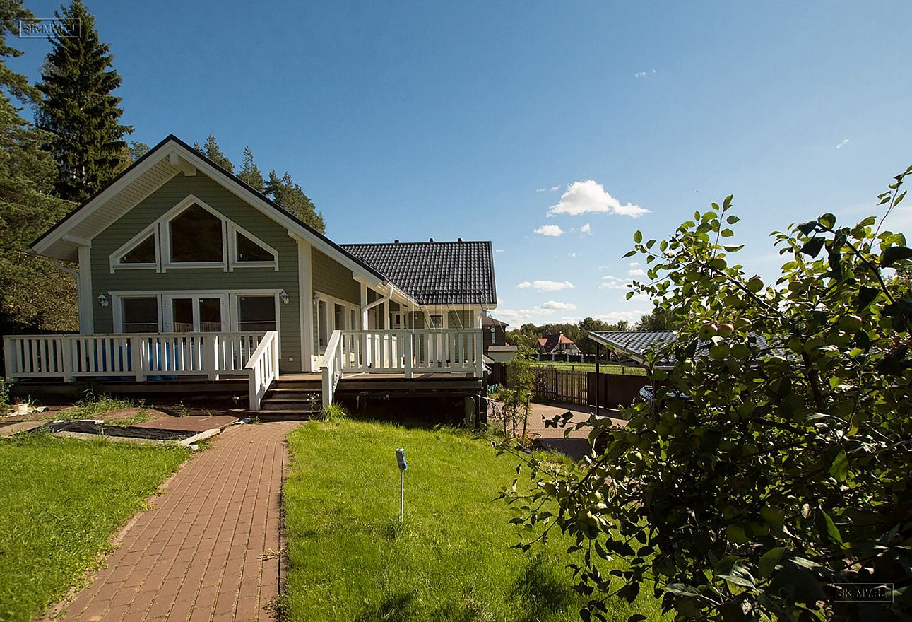 Теплый каркасный дом для постоянного проживания (на фото) площадью 185 кв.м по проекту «МВ 5» построен под ключ в поселке Волочаевка Ленинградской области.