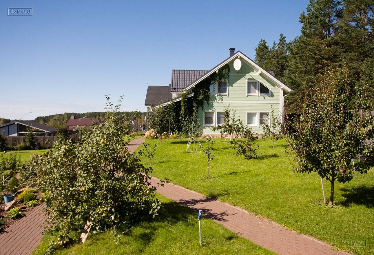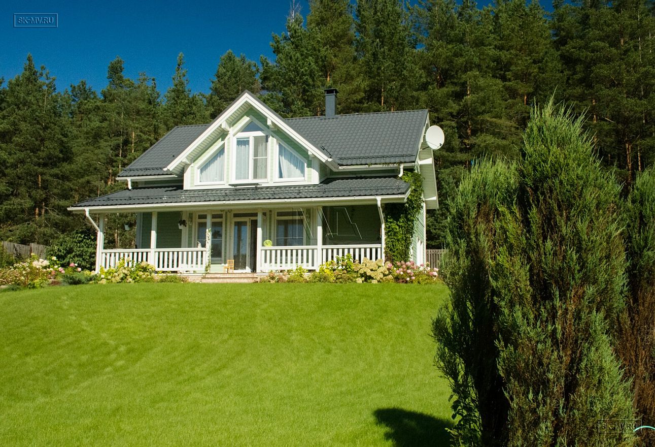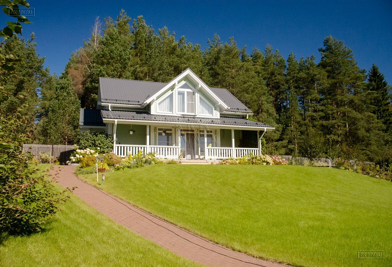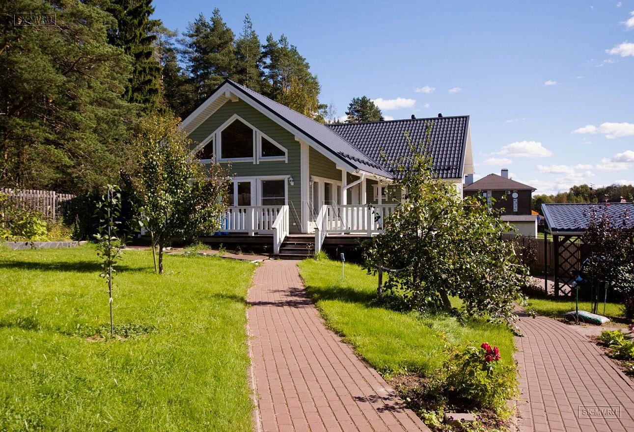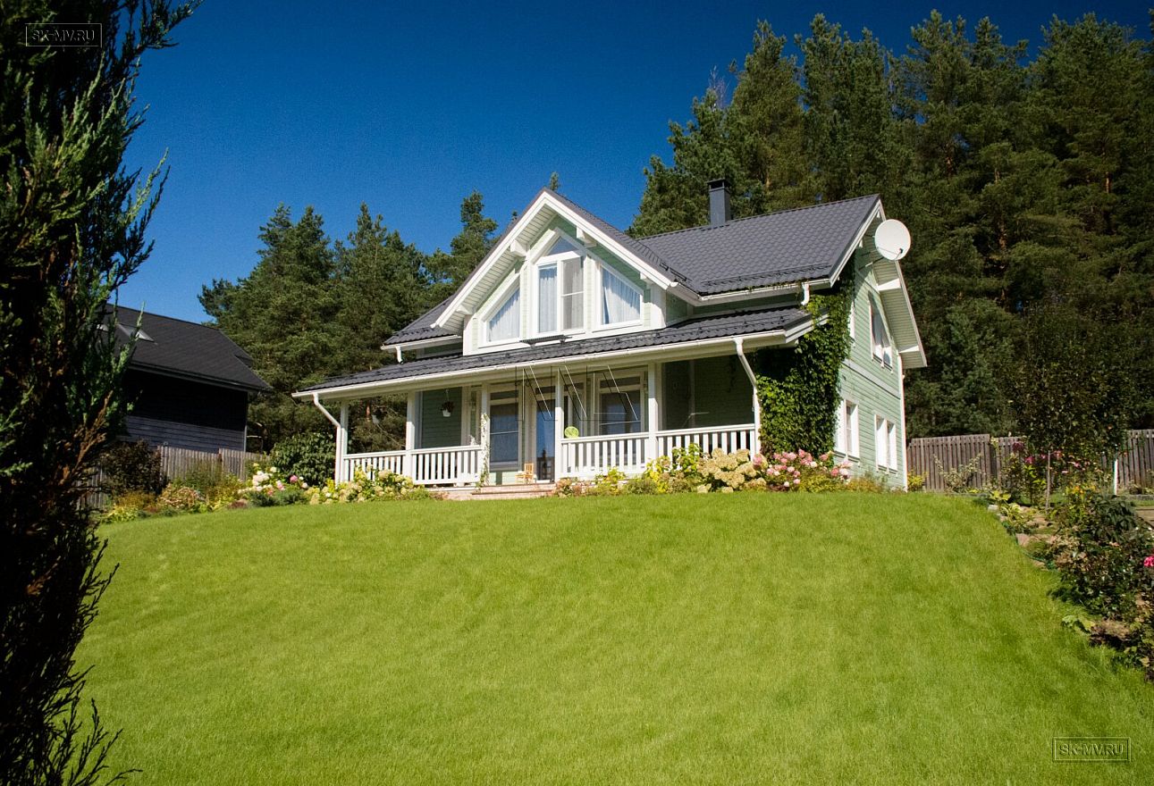 Темная кровля из металлочерепицы и оливкового цвета фасад из отделочной доски великолепно вписан в ландшафтный дизайн домовладения. На участке помимо дома расположилась баня и игровой домик для детей в таком же стиле как дом.