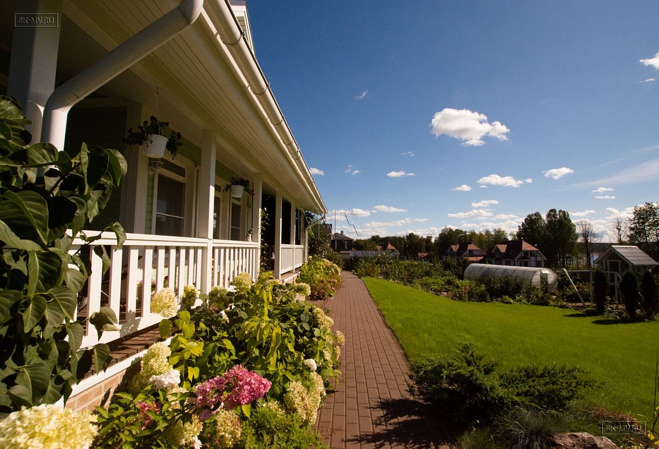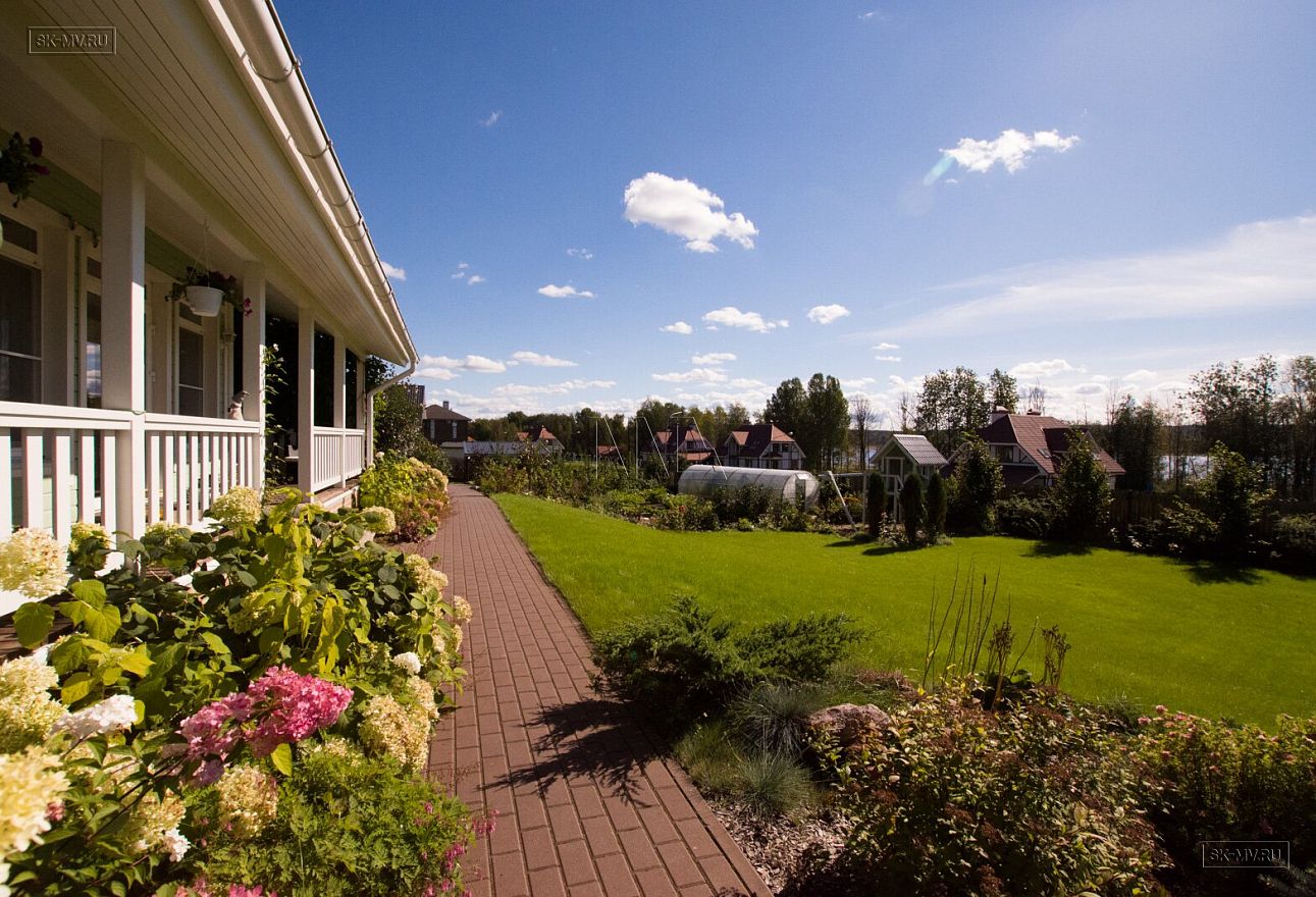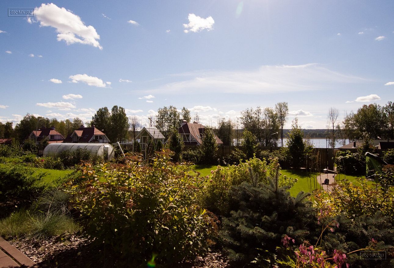 Дом расположен в самой высокой точке участка и обращен главным фасадам на солнечную южную сторону. От этого в гостиной и спальне второго этажа много яркого естественного солнечного света.